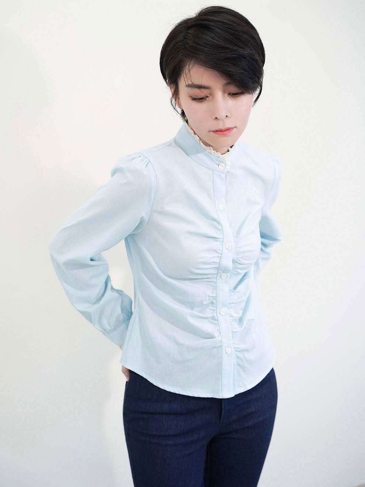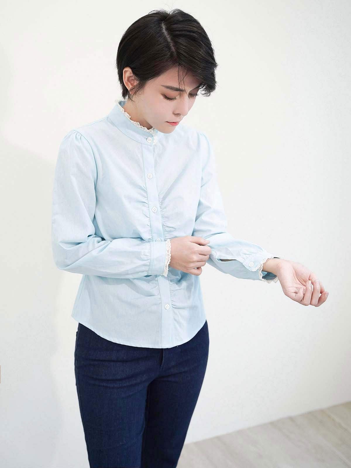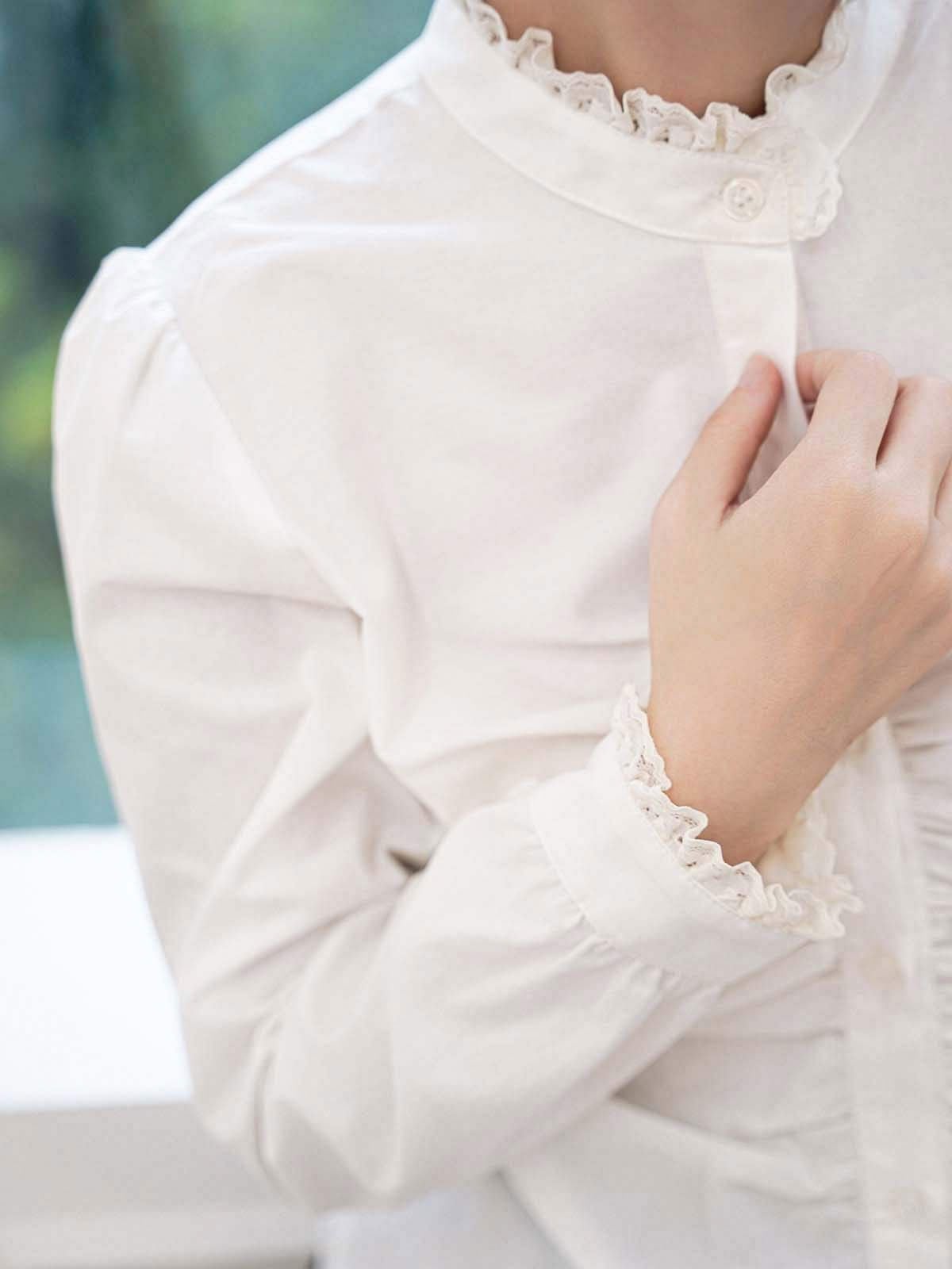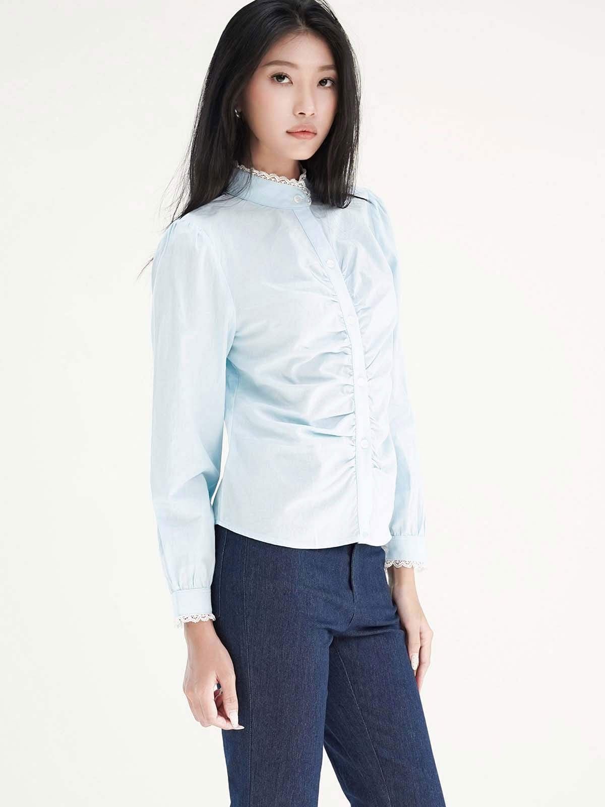 - Áo kiểu nữ thân trước dúng, cổ áo và tay áo viền ren, chất vải dày dặn và không có độ co giãn.