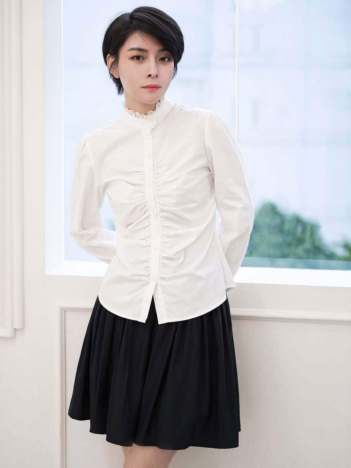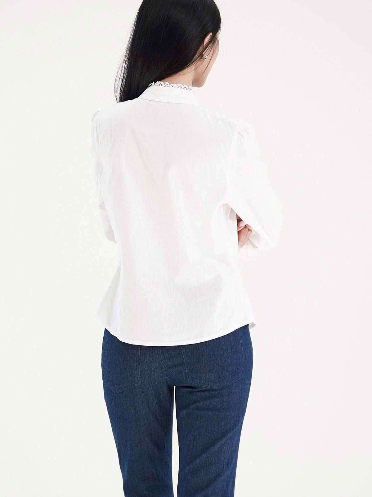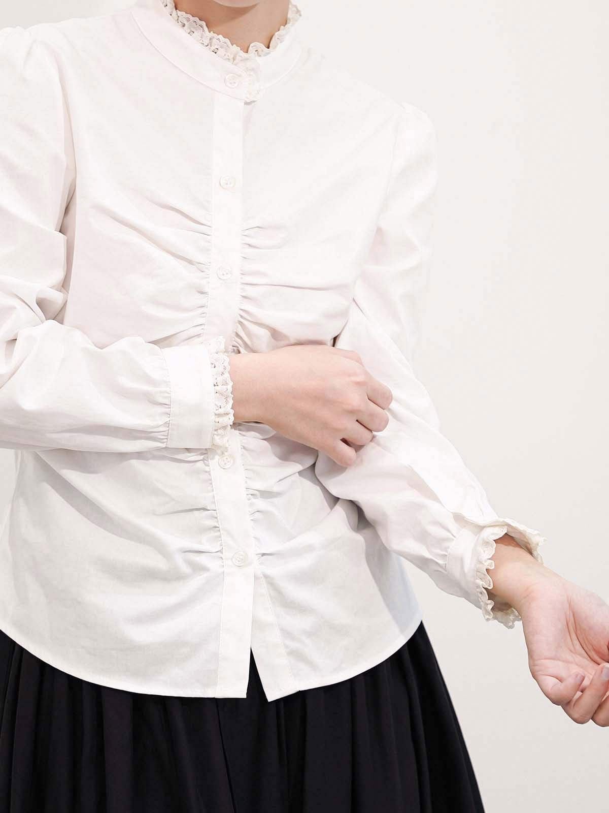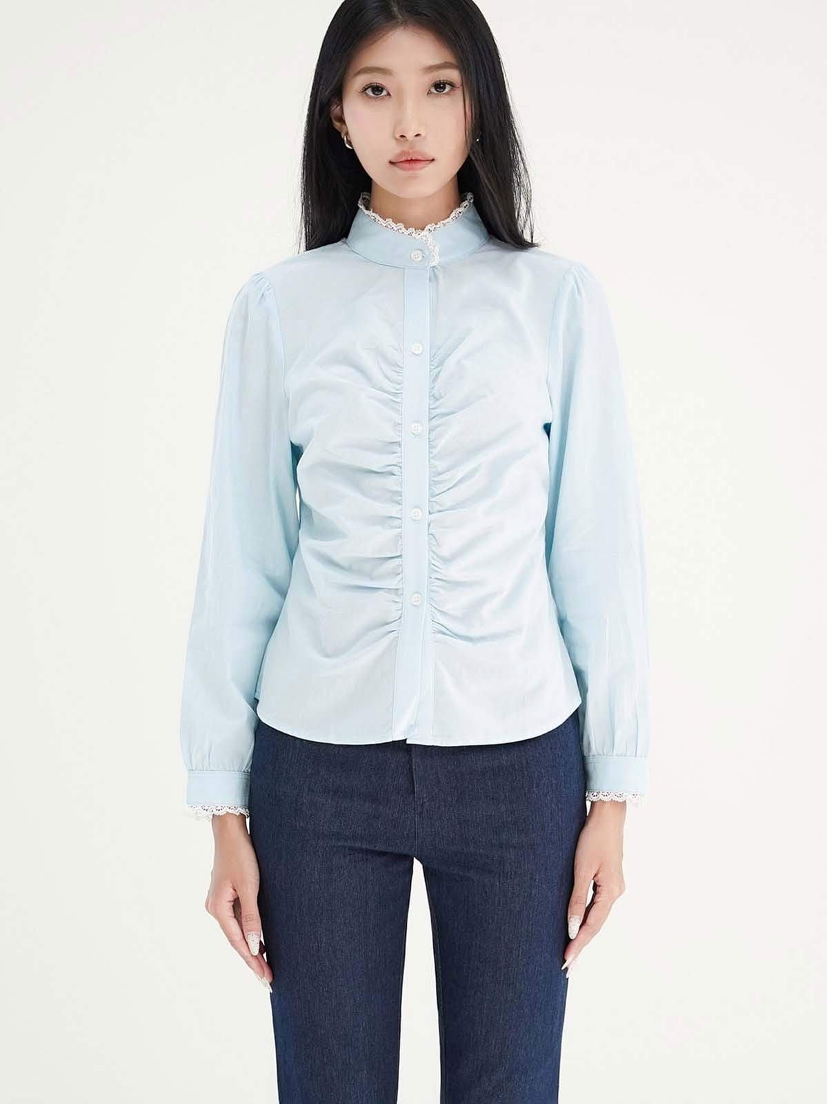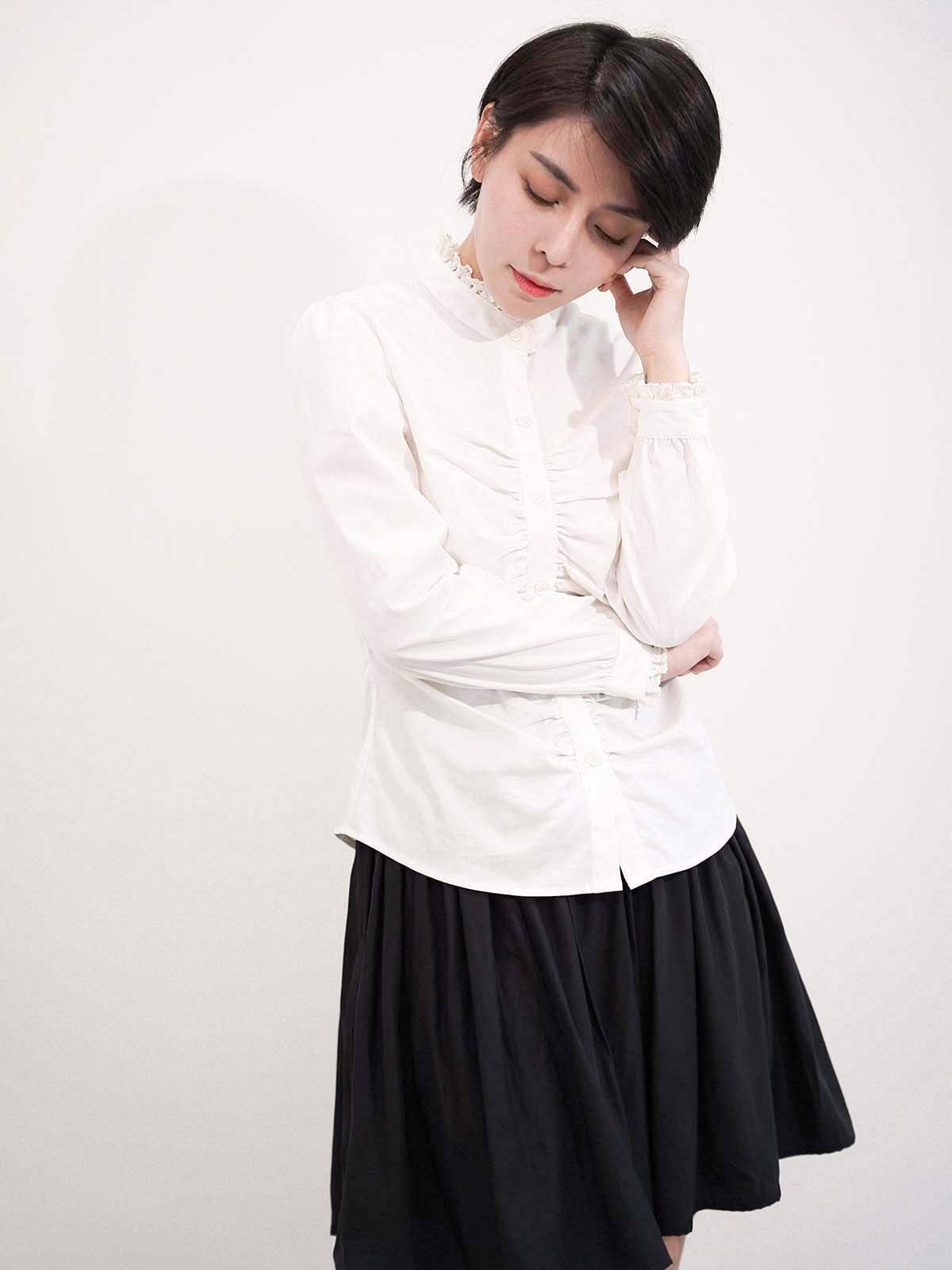 - Áo kiểu nữ thân trước dúng, cổ áo và tay áo viền ren, chất vải dày dặn và không có độ co giãn.