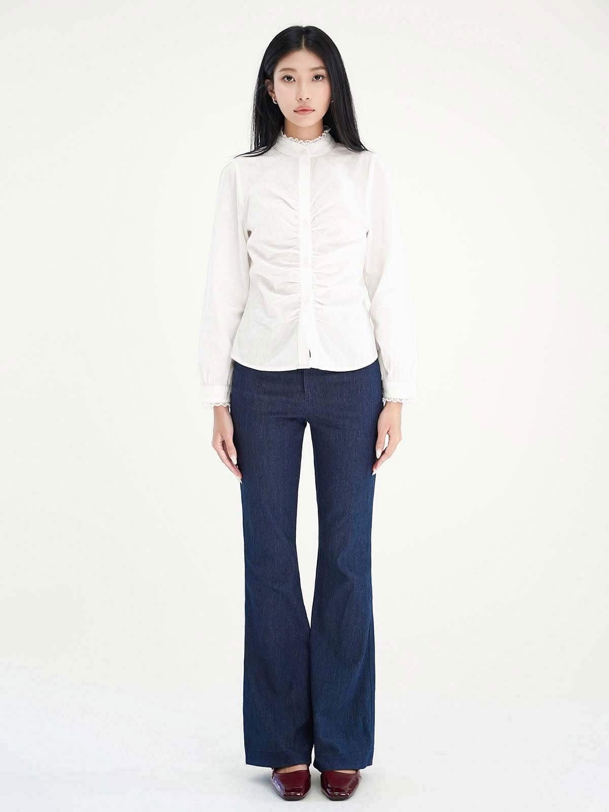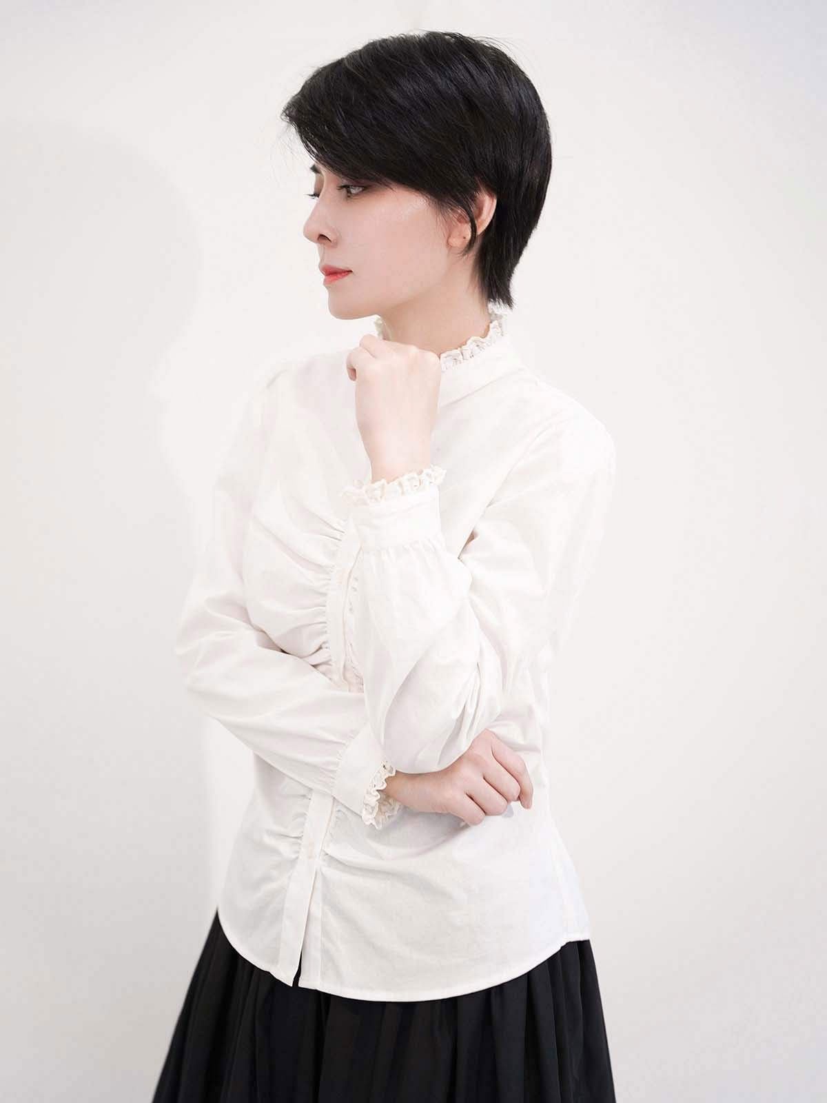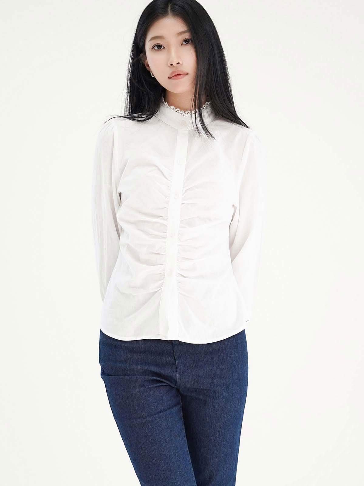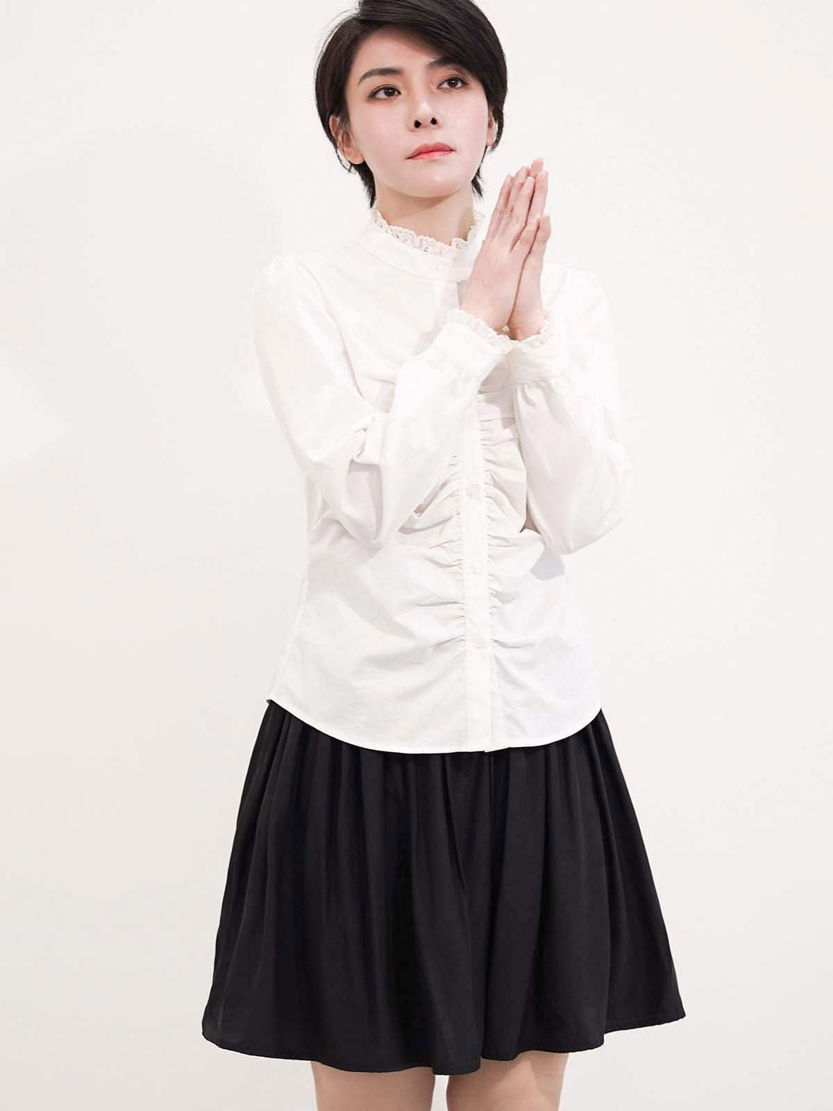- Áo kiểu nữ thân trước dúng, cổ áo và tay áo viền ren, chất vải dày dặn và không có độ co giãn.