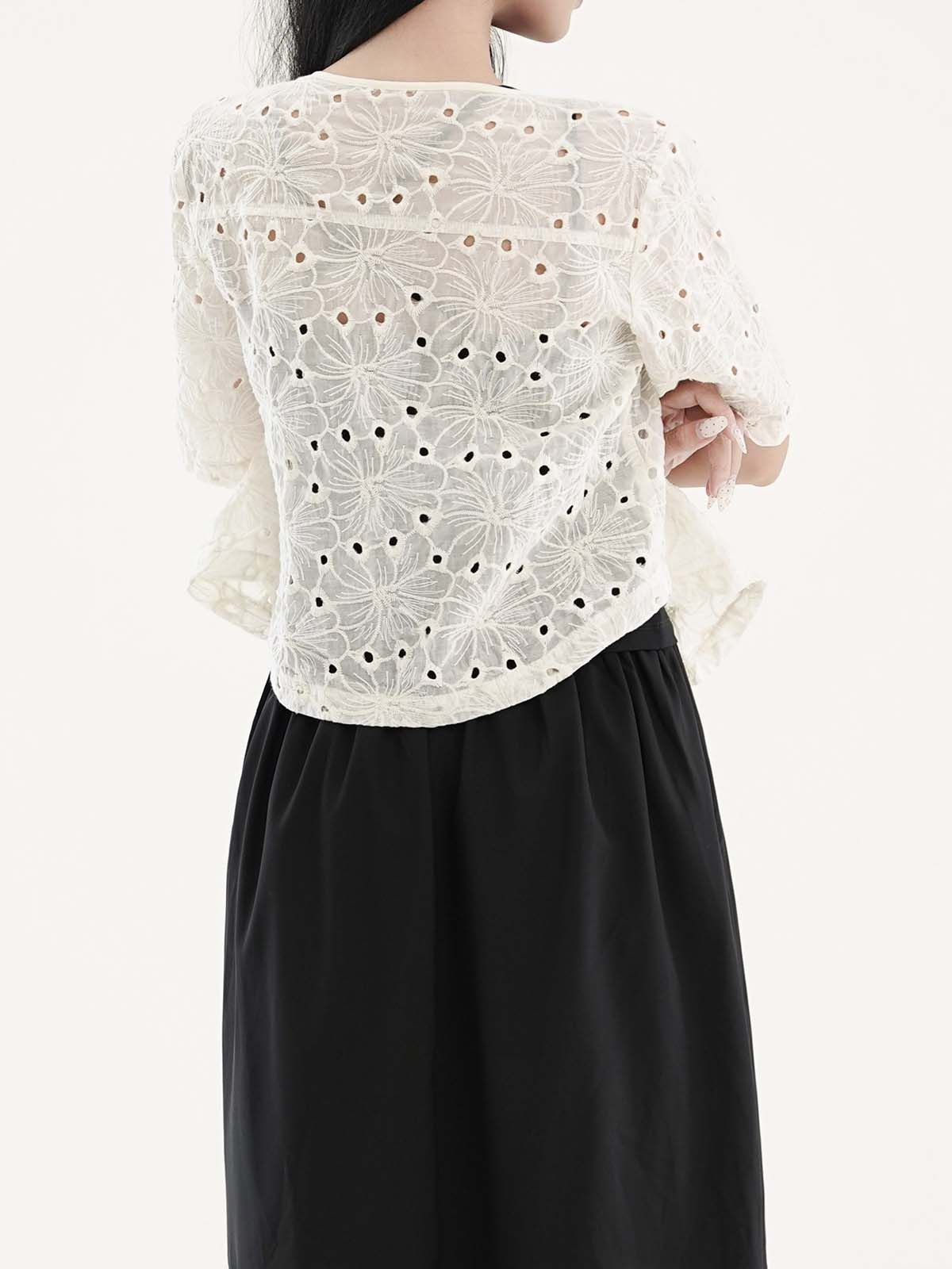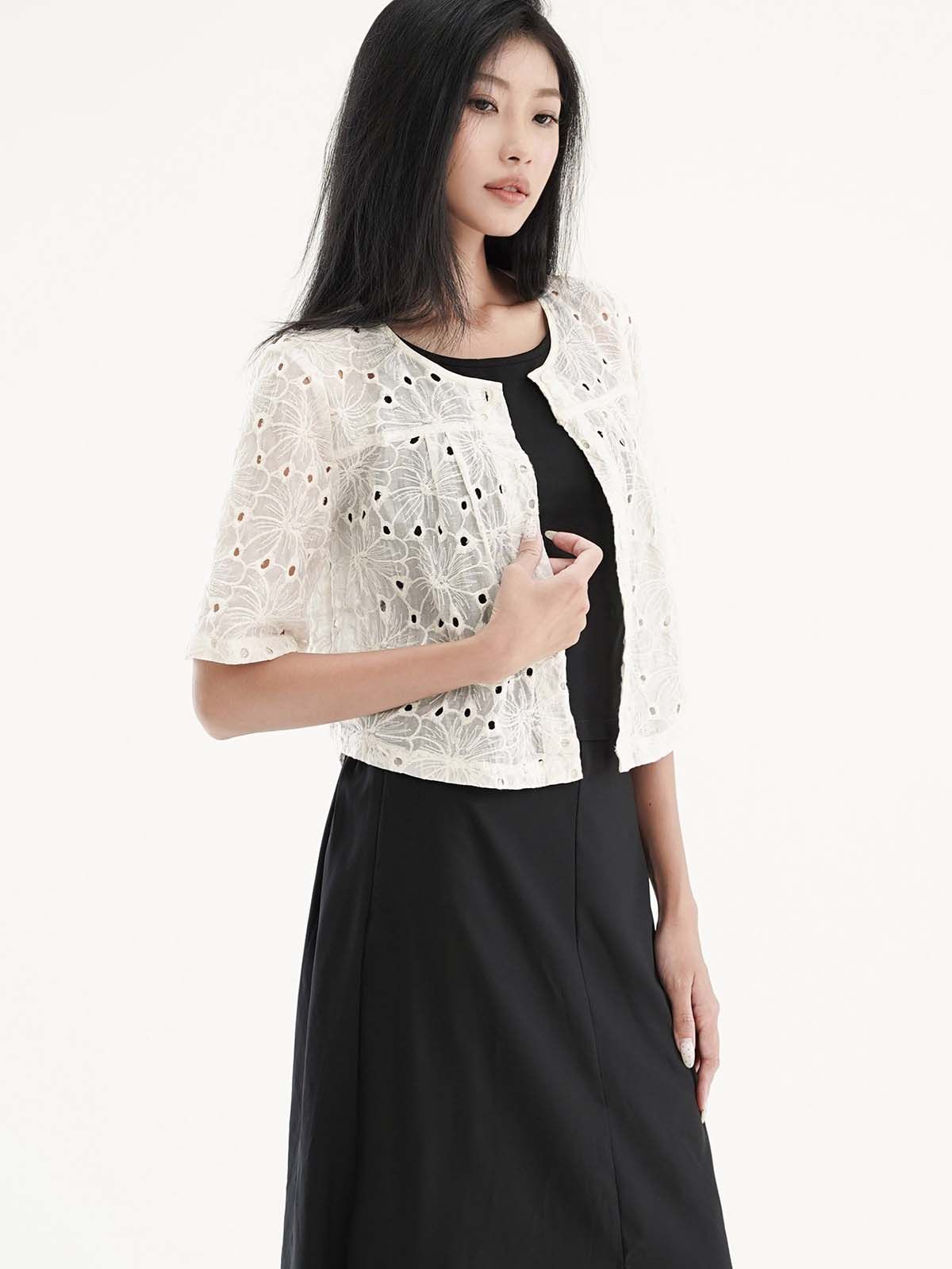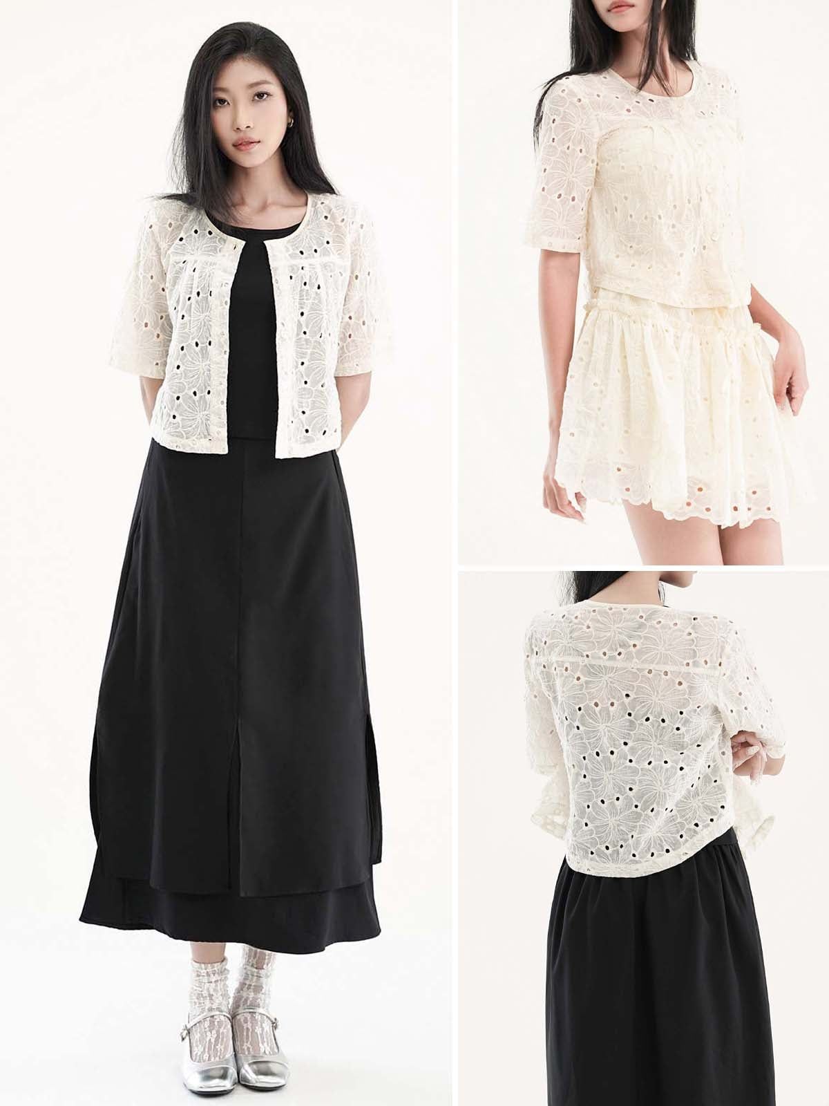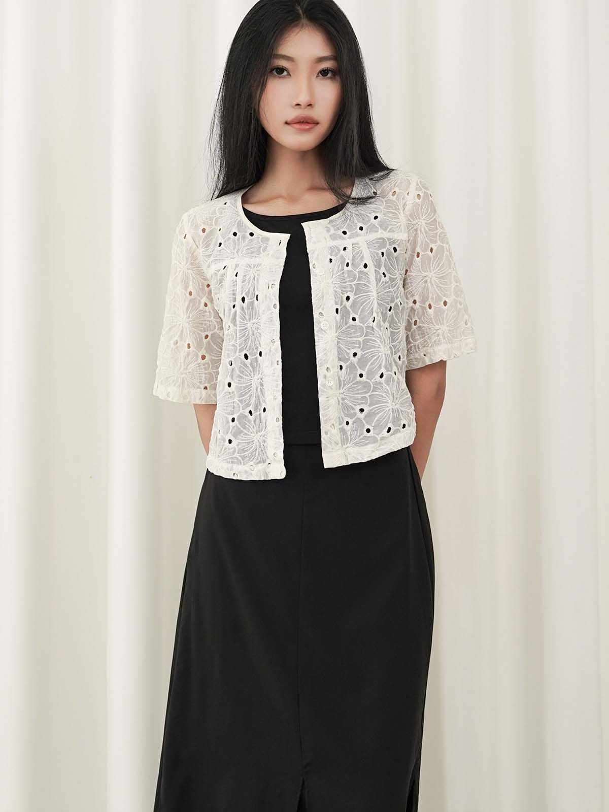 - Áo kiểu vải thêu hoa lỗ, tạo cảm giác nhẹ nhàng, nữ tính và thoáng mát. Tay ngắn, dáng suông. Có thể mặc kèm áo lót ống bên trong, hoặc có thể làm áo khoác nhẹ bên ngoài.