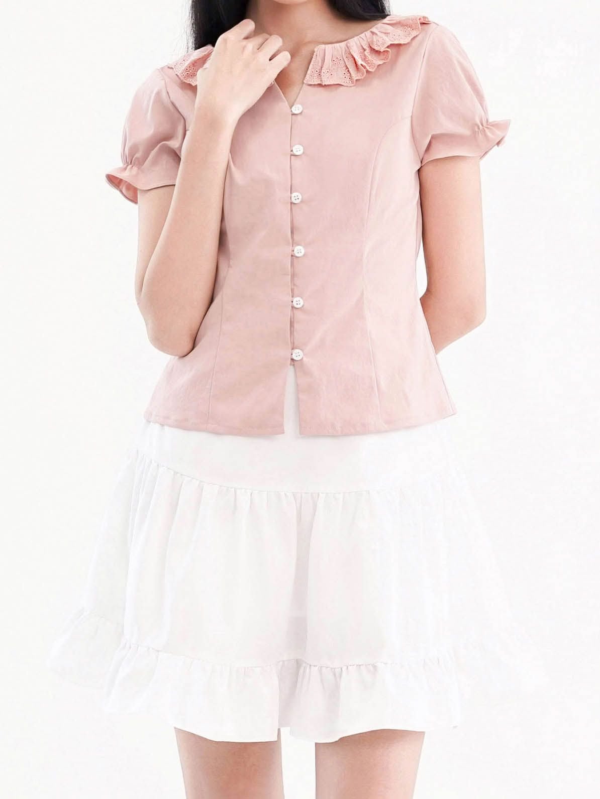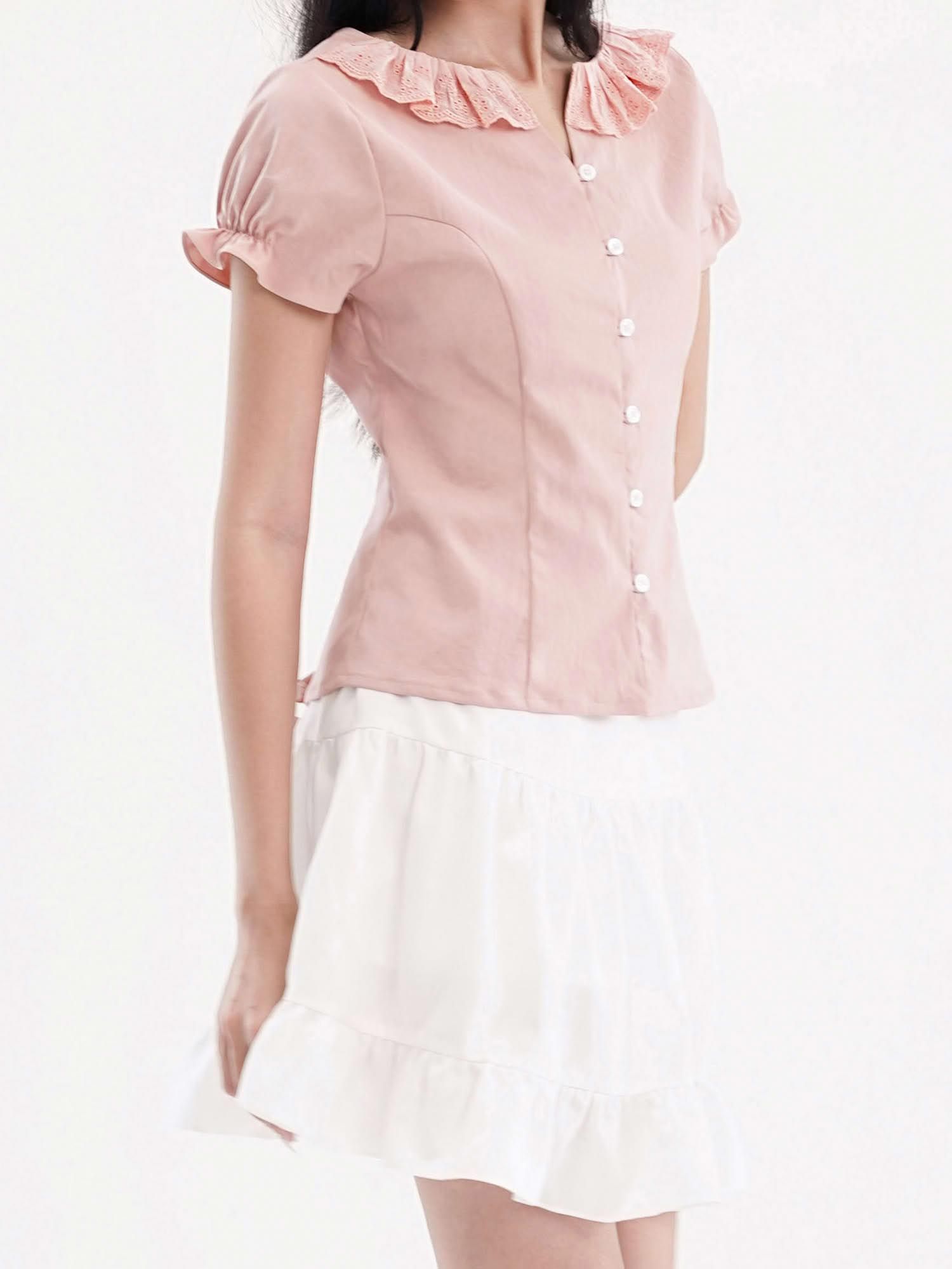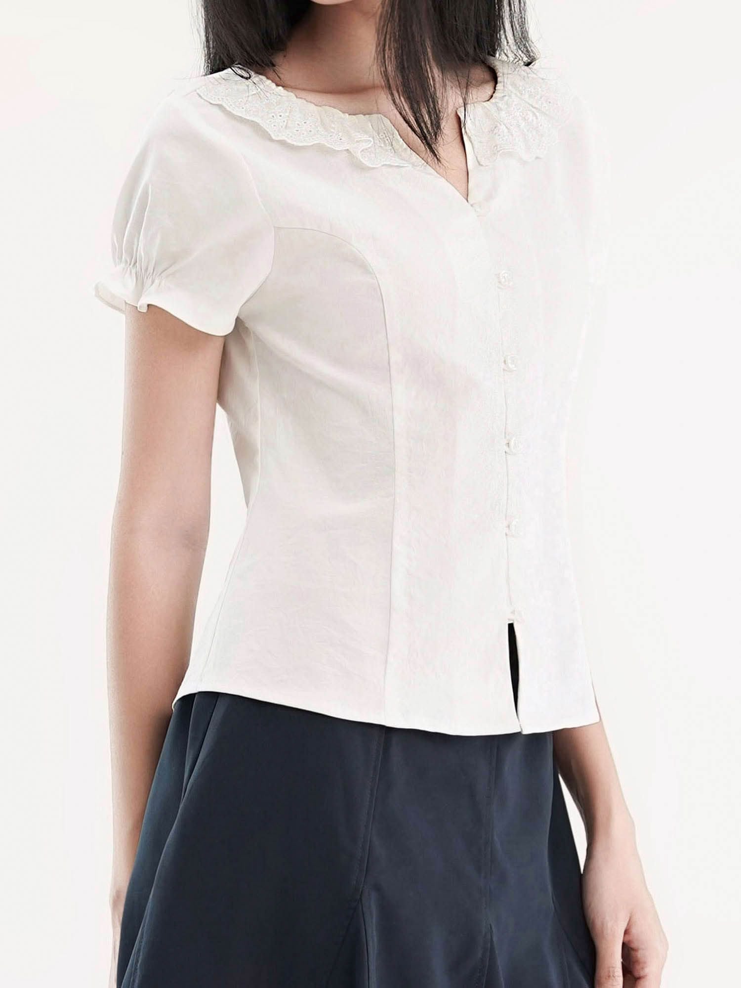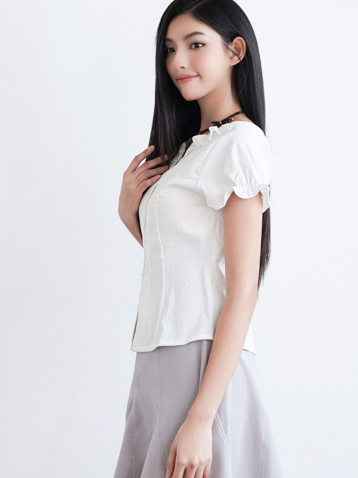 - Áo kiểu nữ cổ tròn phối bèo ren cách điệu, tạo điểm nhấn điệu đà. Tay ngắn phồng nhẹ, bo gấu tay có có thun nhỏ tạo điểm nhấn, phom áo ôm nhẹ phần eo, tôn dáng.