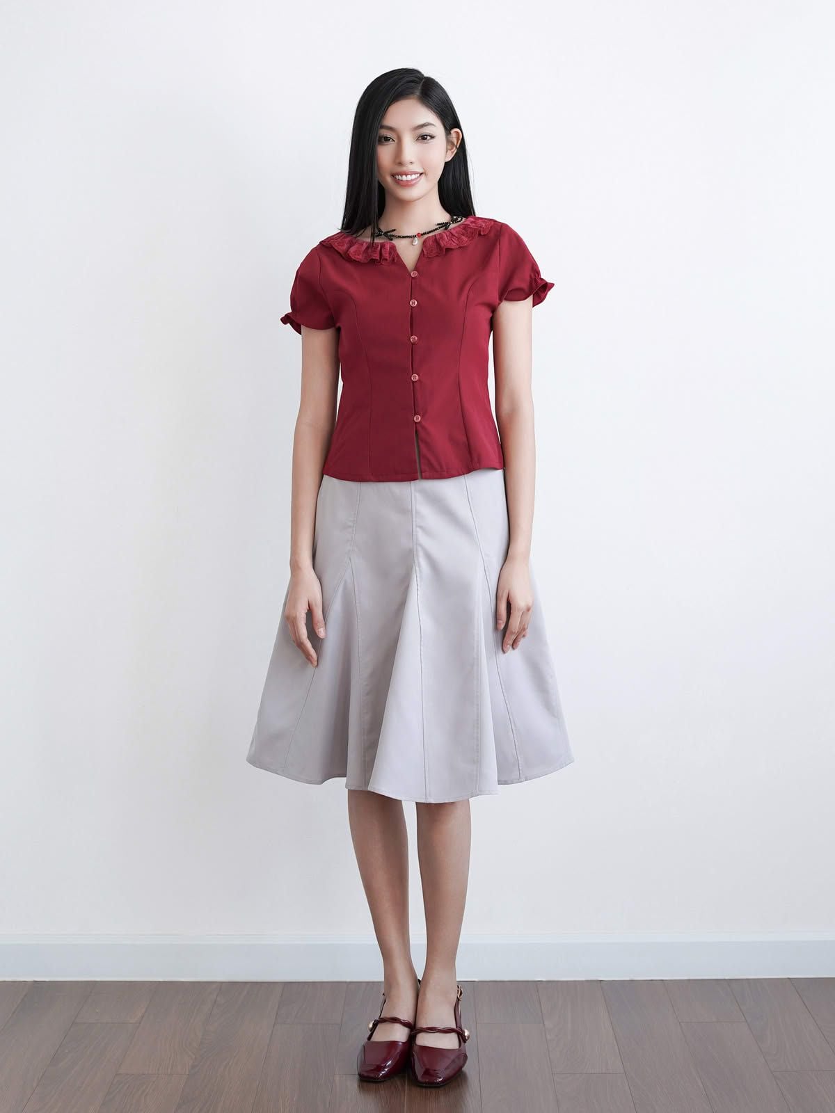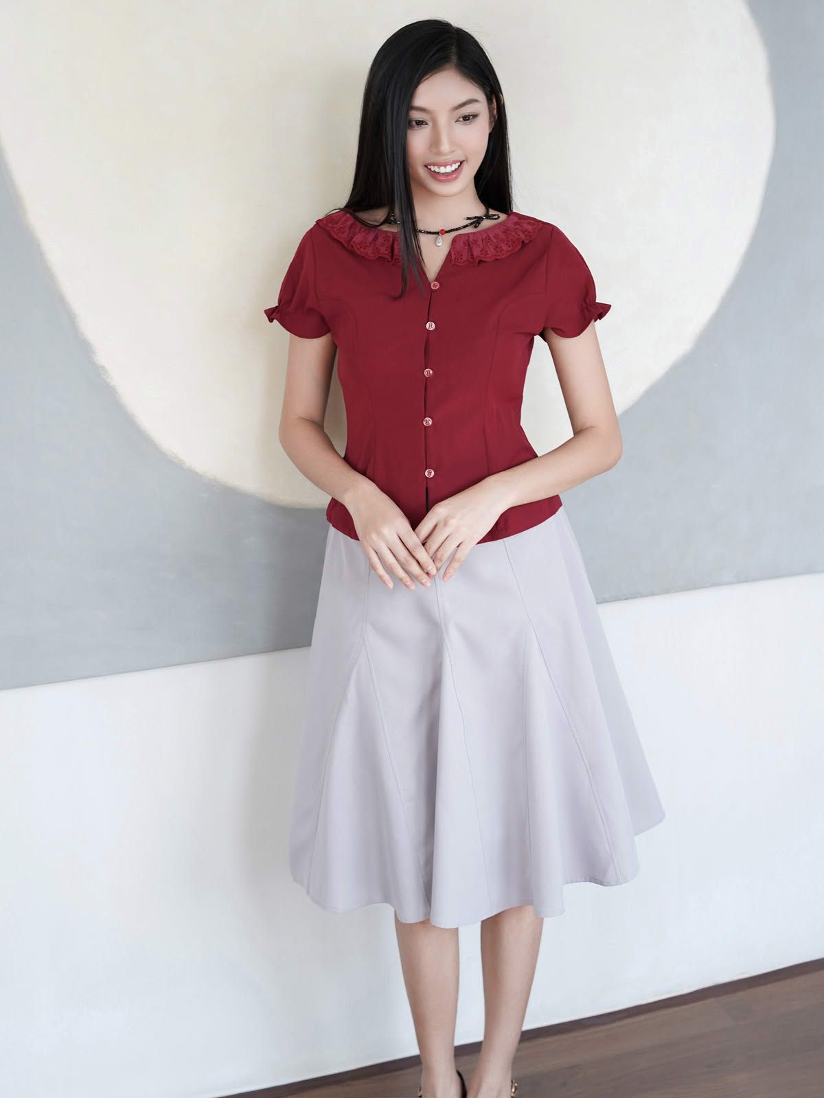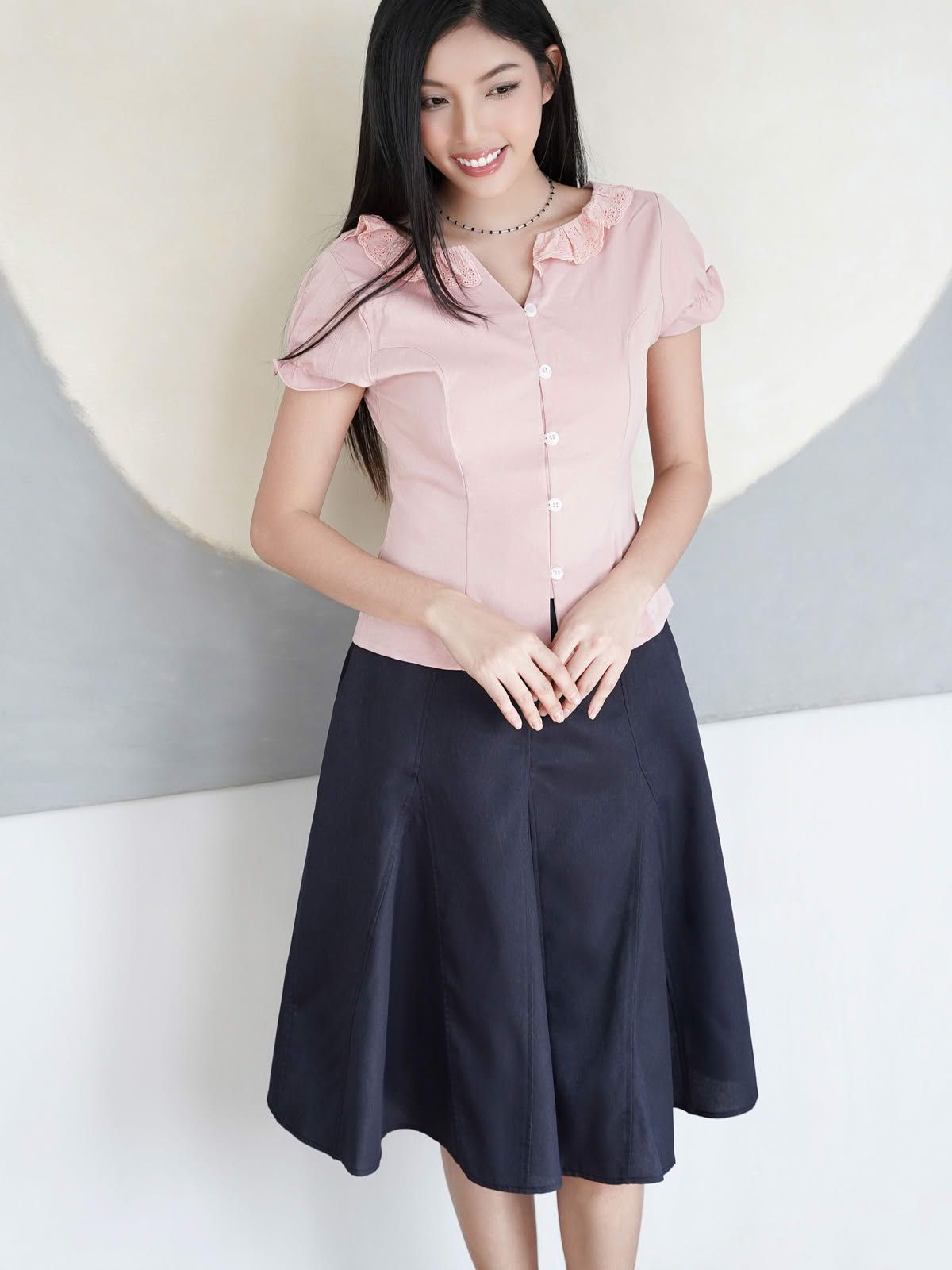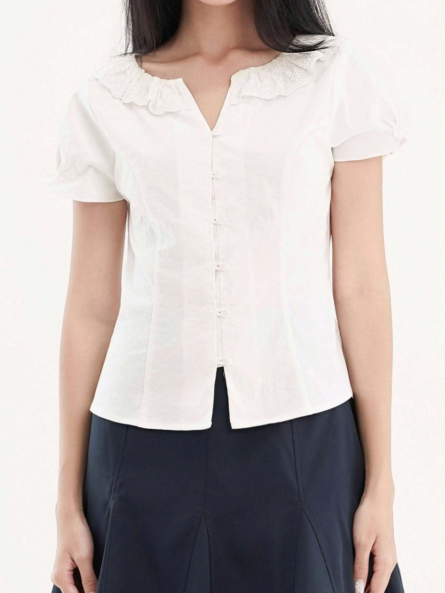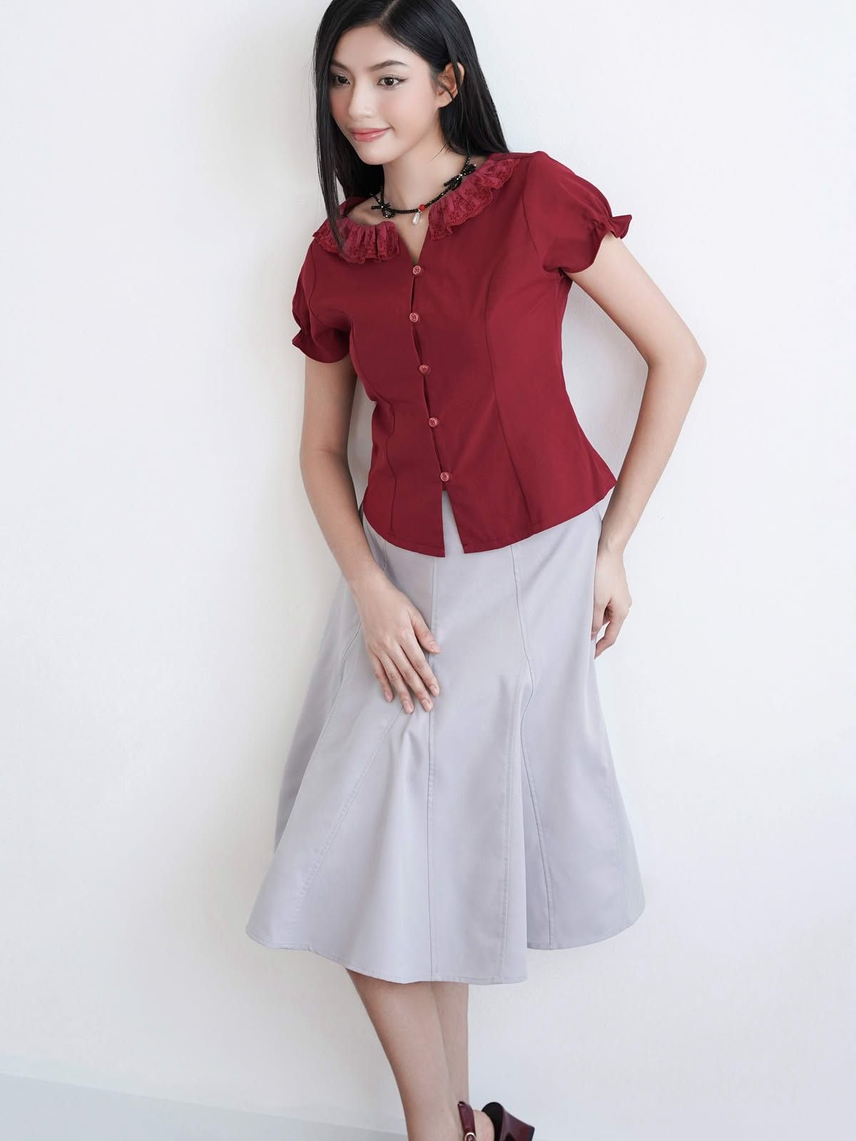 - Áo kiểu nữ cổ tròn phối bèo ren cách điệu, tạo điểm nhấn điệu đà. Tay ngắn phồng nhẹ, bo gấu tay có có thun nhỏ tạo điểm nhấn, phom áo ôm nhẹ phần eo, tôn dáng.