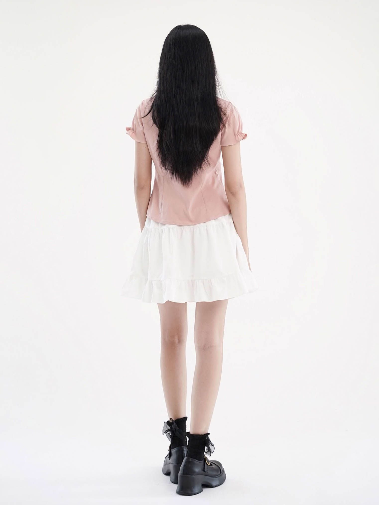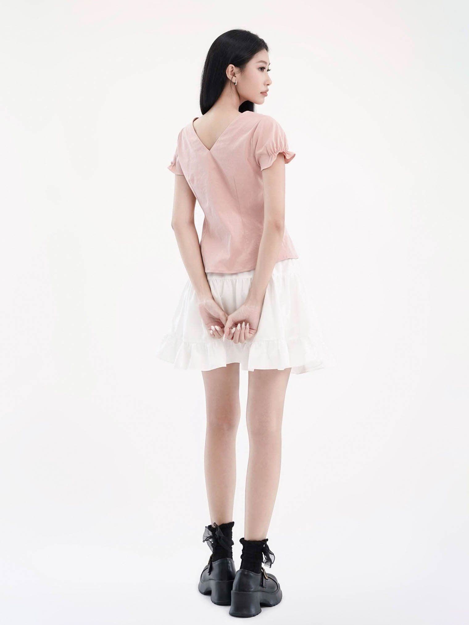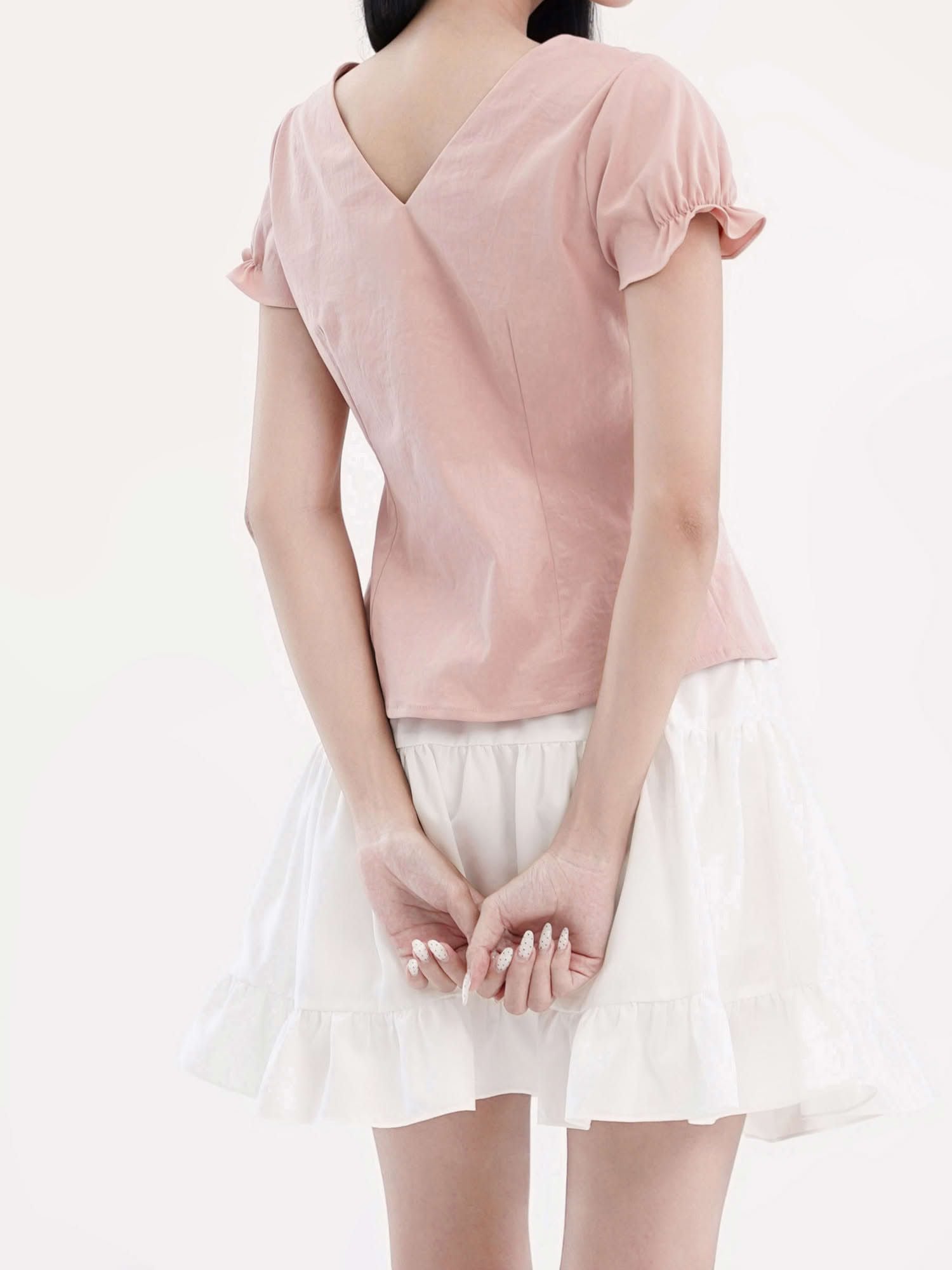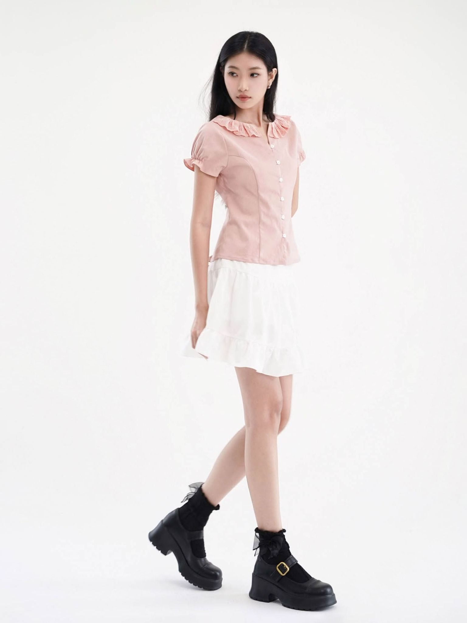 - Áo kiểu nữ cổ tròn phối bèo ren cách điệu, tạo điểm nhấn điệu đà. Tay ngắn phồng nhẹ, bo gấu tay có có thun nhỏ tạo điểm nhấn, phom áo ôm nhẹ phần eo, tôn dáng.