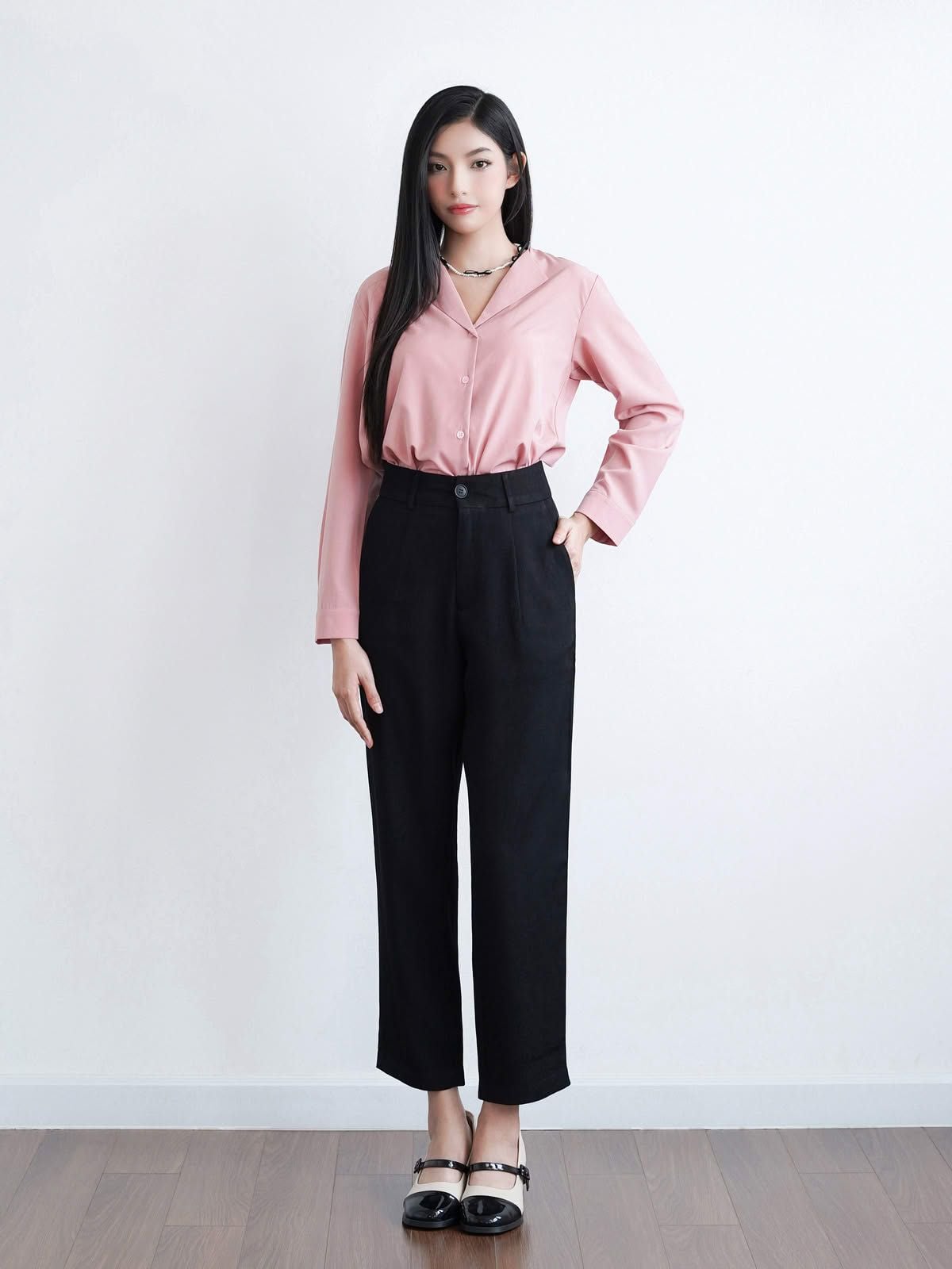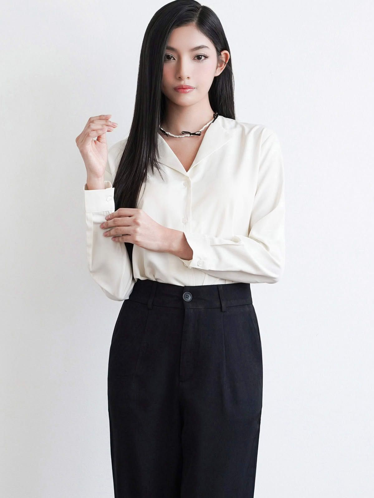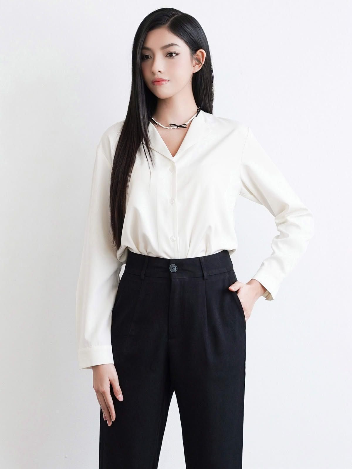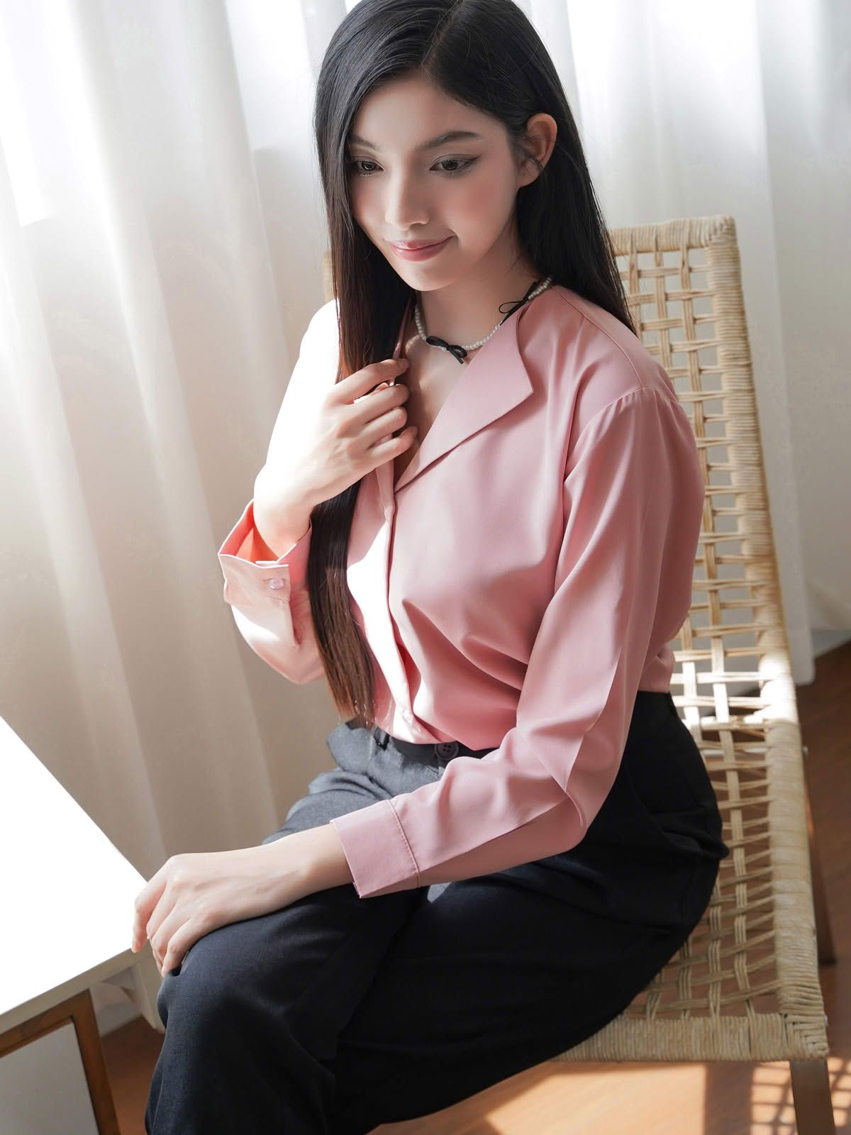 - Áo kiểu nữ cổ lật, chất vải dày dặn, không có độ co giãn.