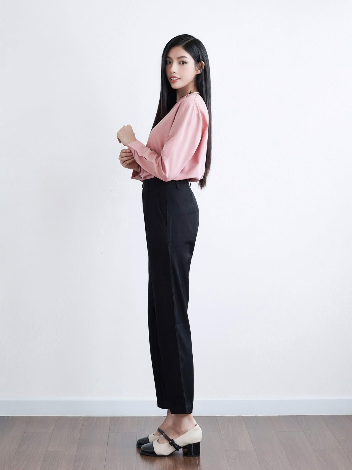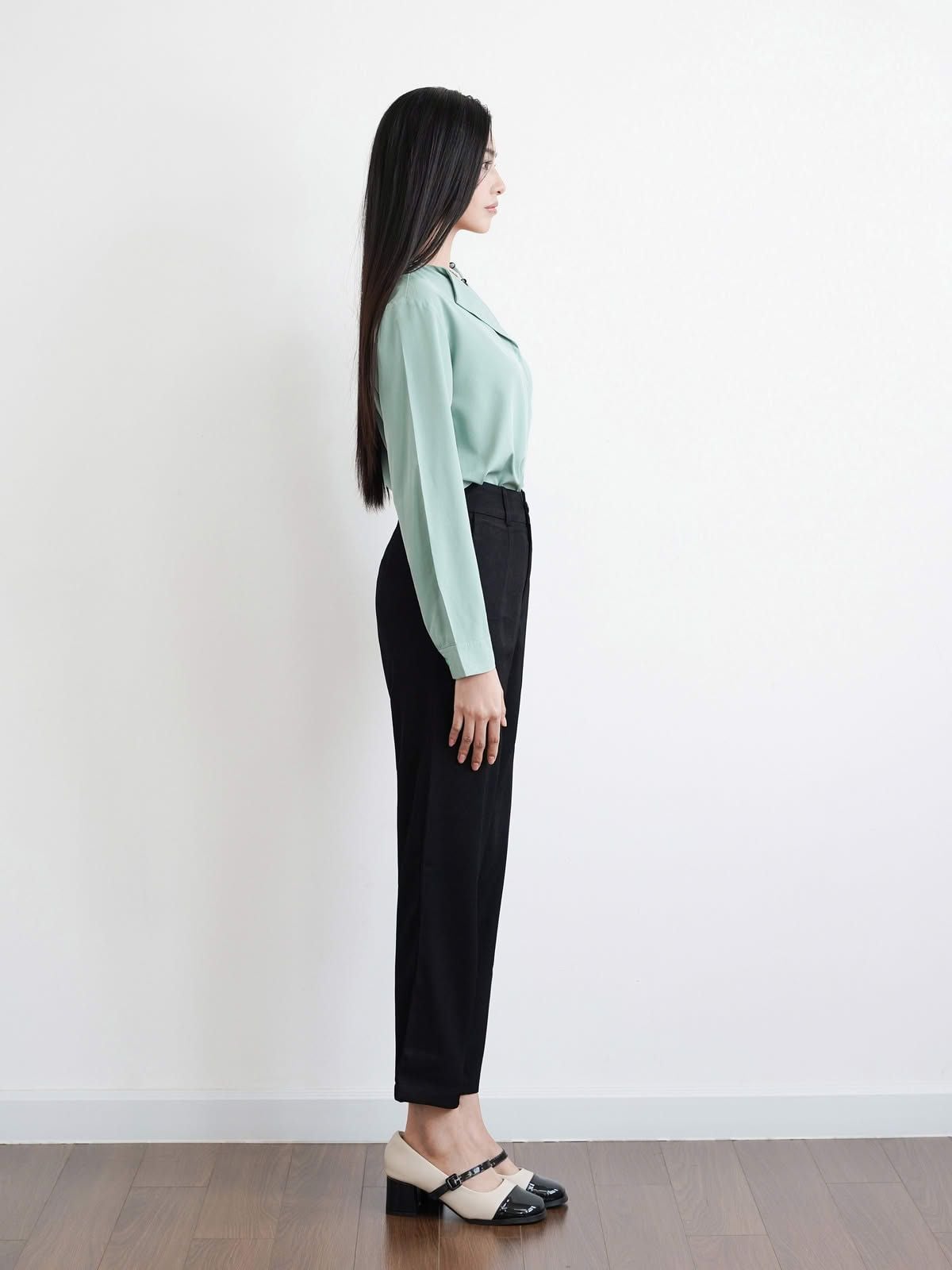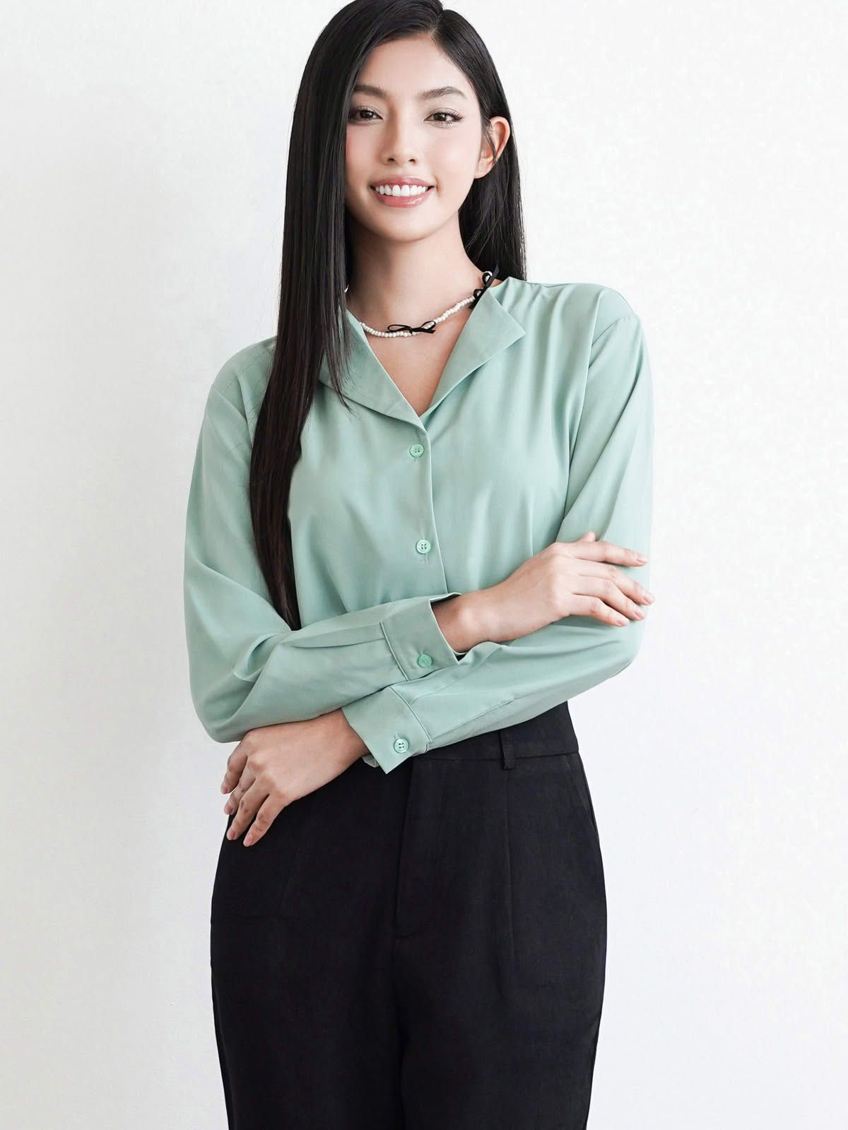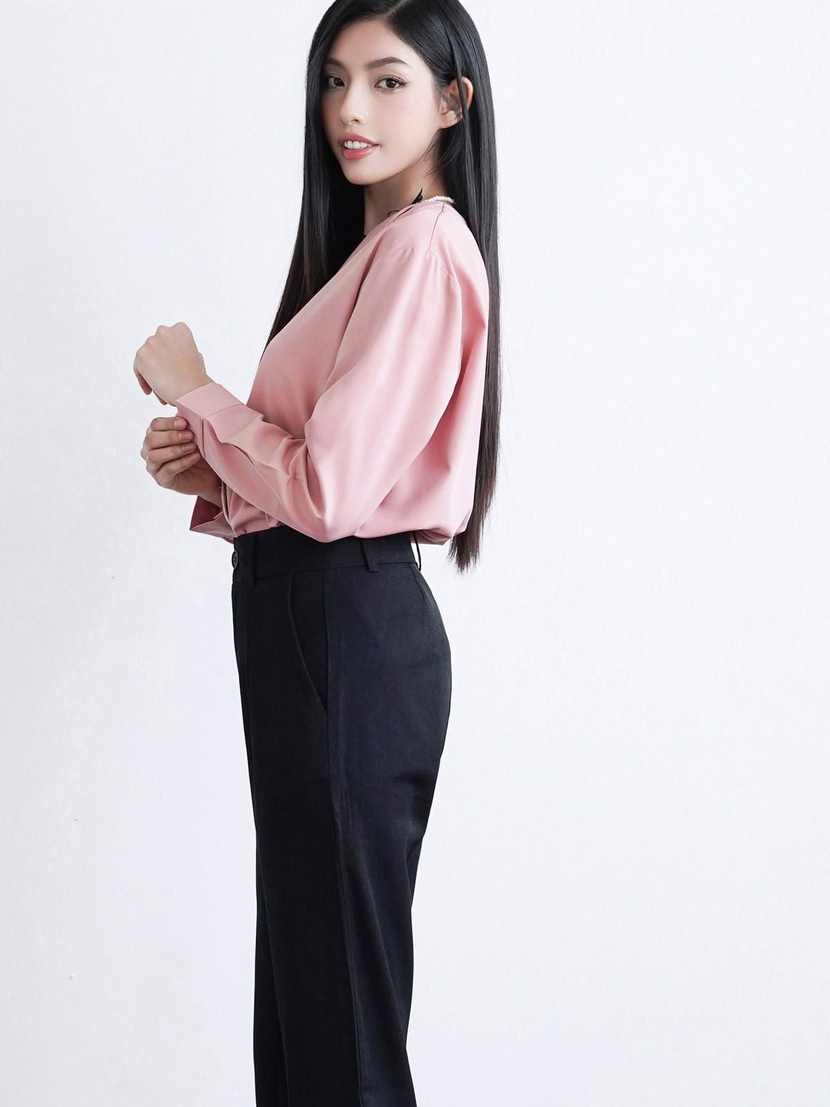 - Áo kiểu nữ cổ lật, chất vải dày dặn, không có độ co giãn.