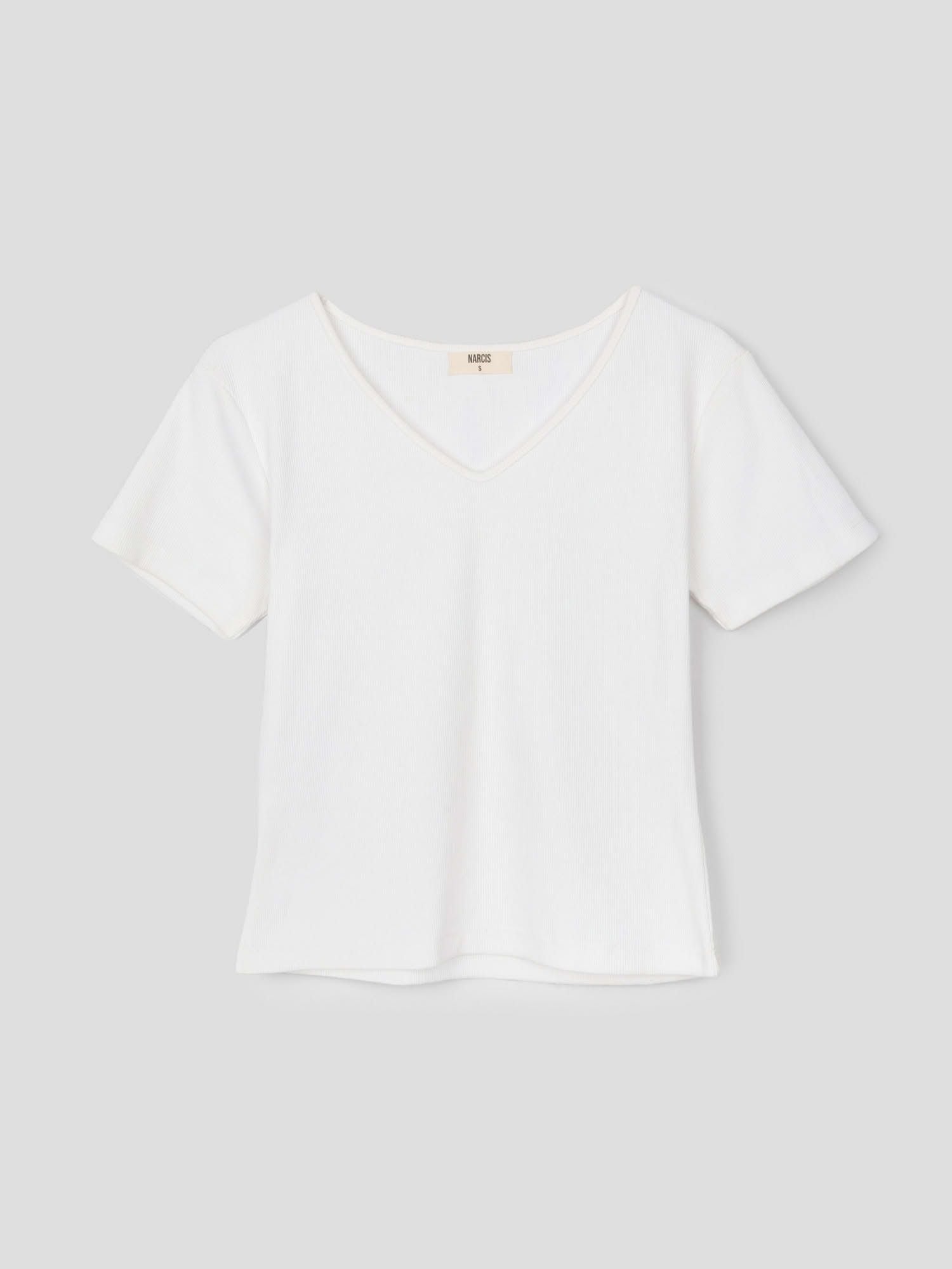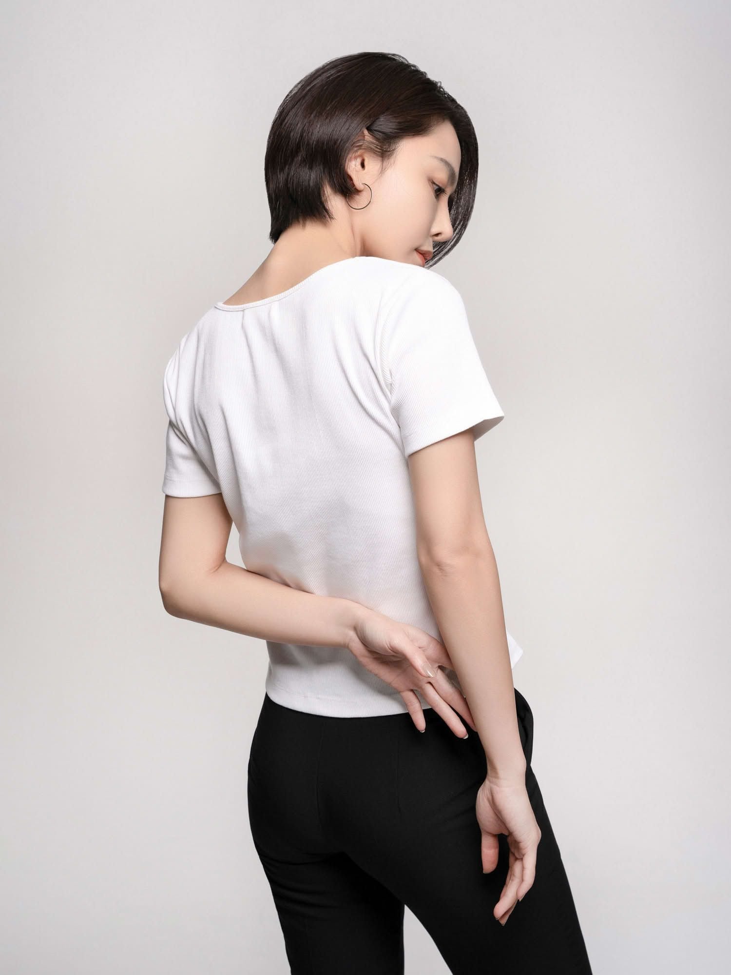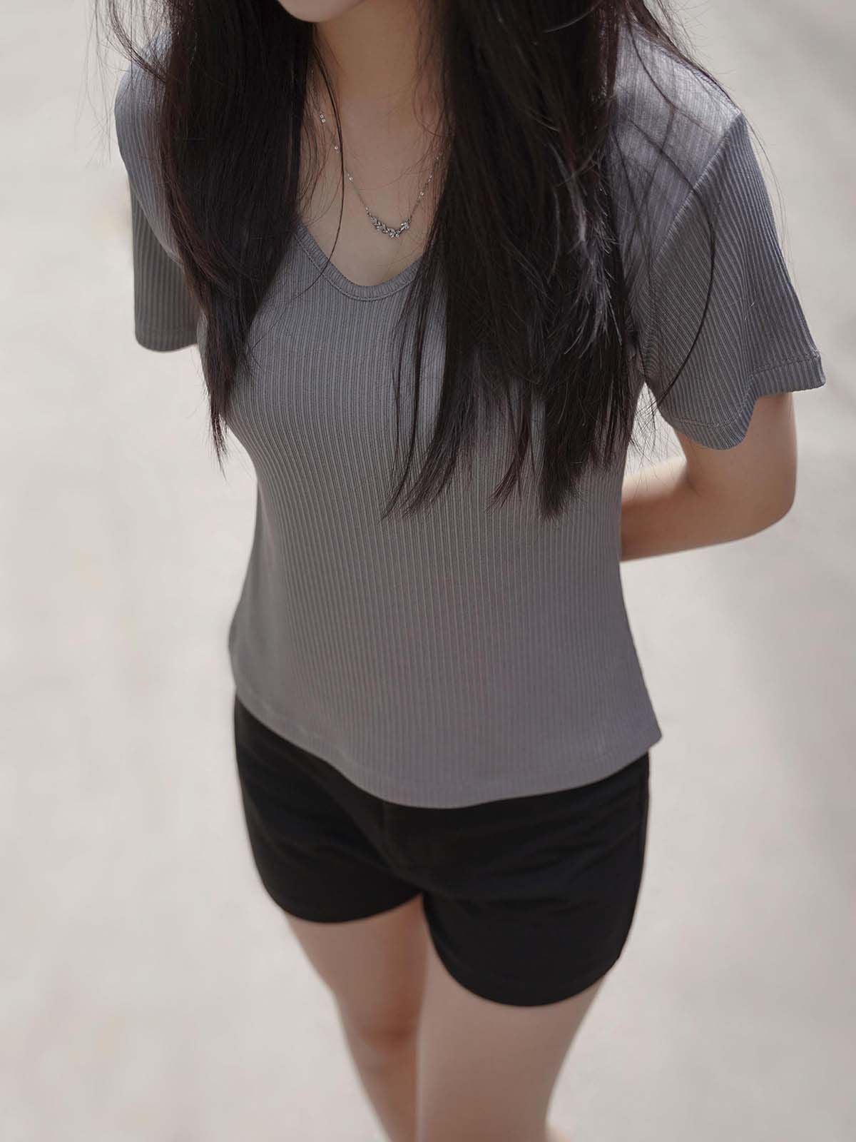 - Áo thun đũa cổ V – item không thể thiếu cho những cô nàng yêu sự tối giản nhưng vẫn thanh lịch. Chất thun gân mềm mịn, co giãn thoải mái, form ôm nhẹ tôn dáng. Cổ V tinh tế giúp khoe khéo phần xương quai xanh, tạo cảm giác thon gọn, quyến rũ nhẹ nhàng.