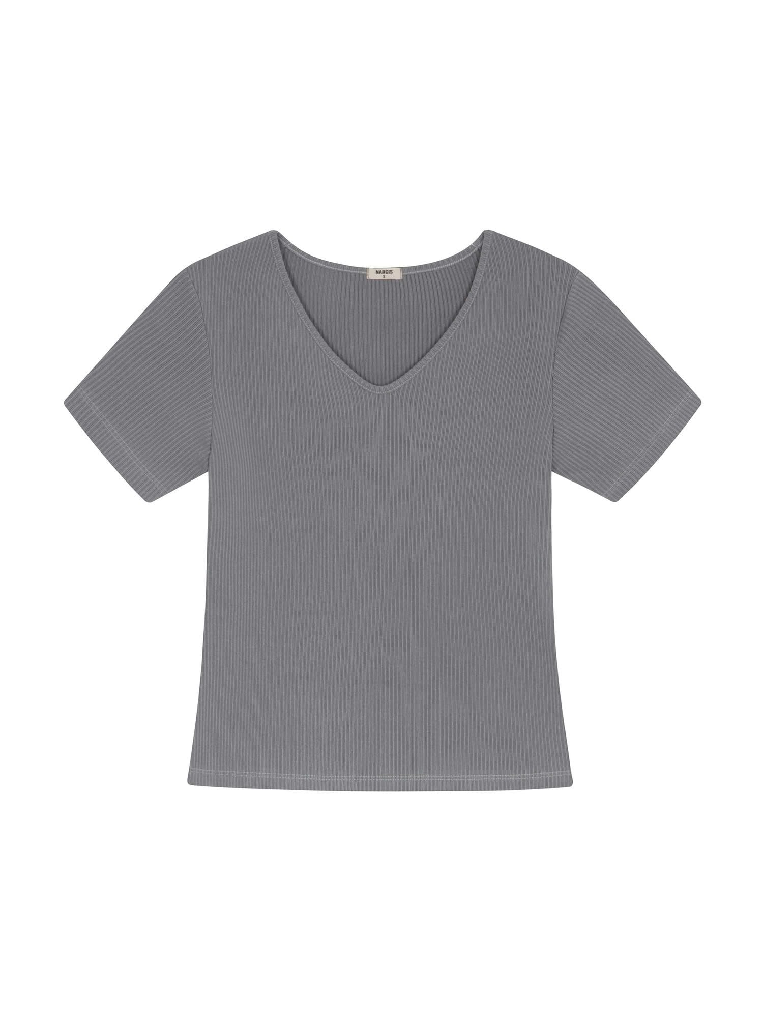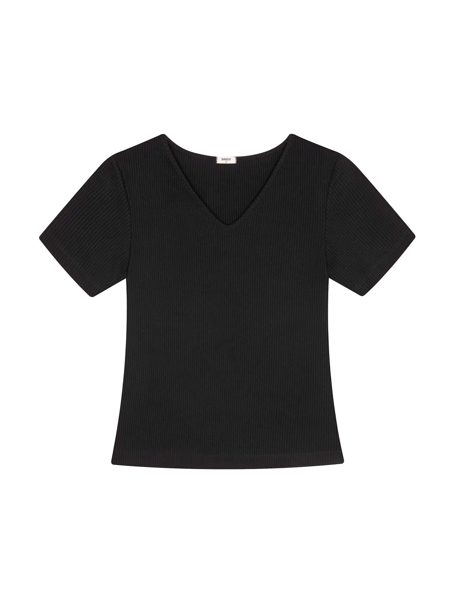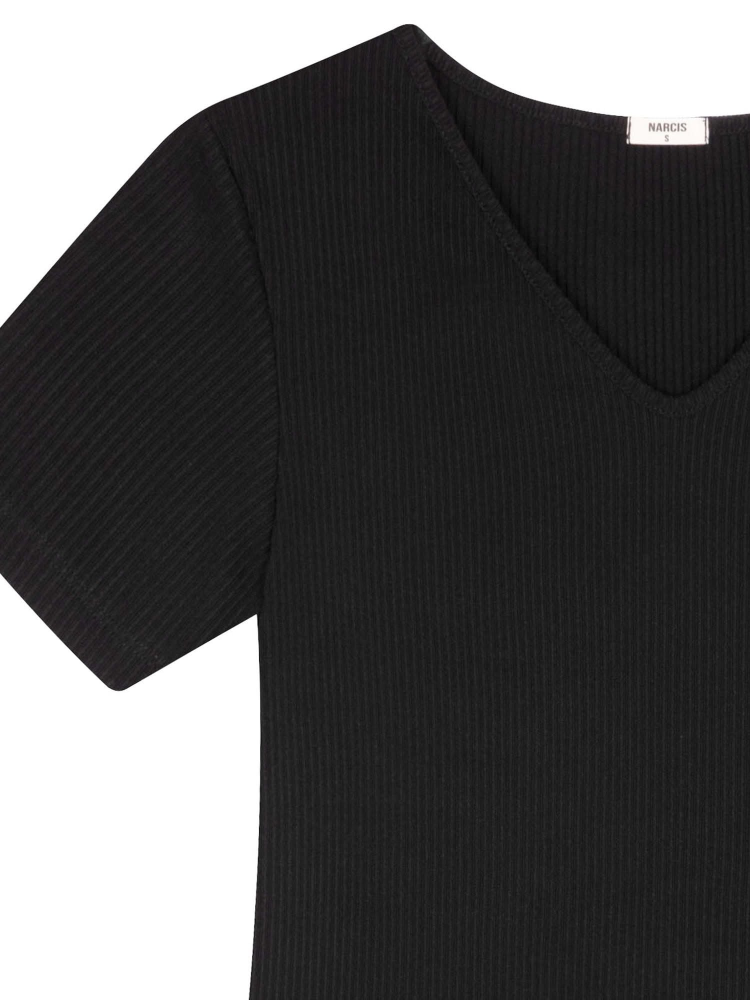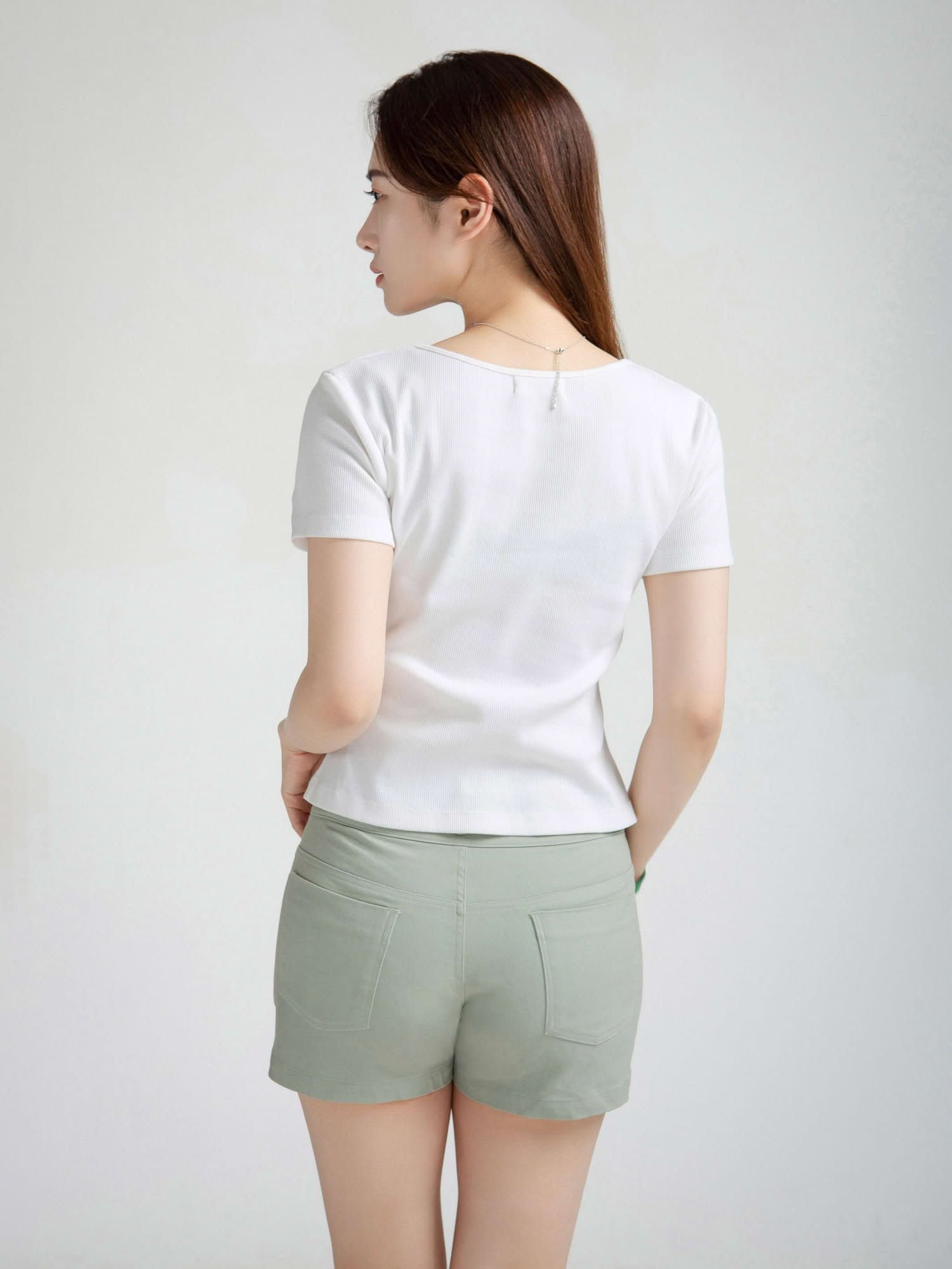 - Áo thun đũa cổ V – item không thể thiếu cho những cô nàng yêu sự tối giản nhưng vẫn thanh lịch. Chất thun gân mềm mịn, co giãn thoải mái, form ôm nhẹ tôn dáng. Cổ V tinh tế giúp khoe khéo phần xương quai xanh, tạo cảm giác thon gọn, quyến rũ nhẹ nhàng.
