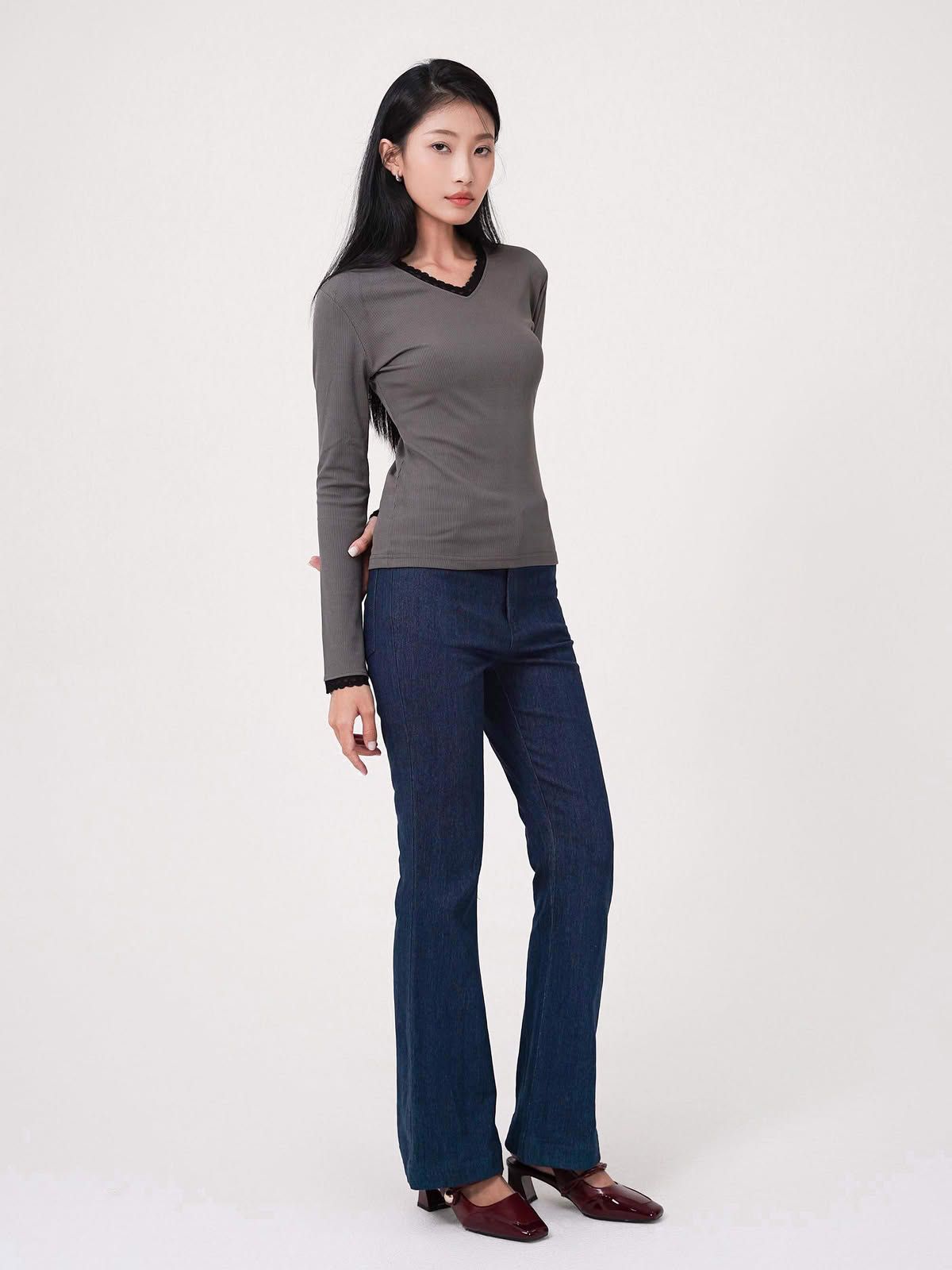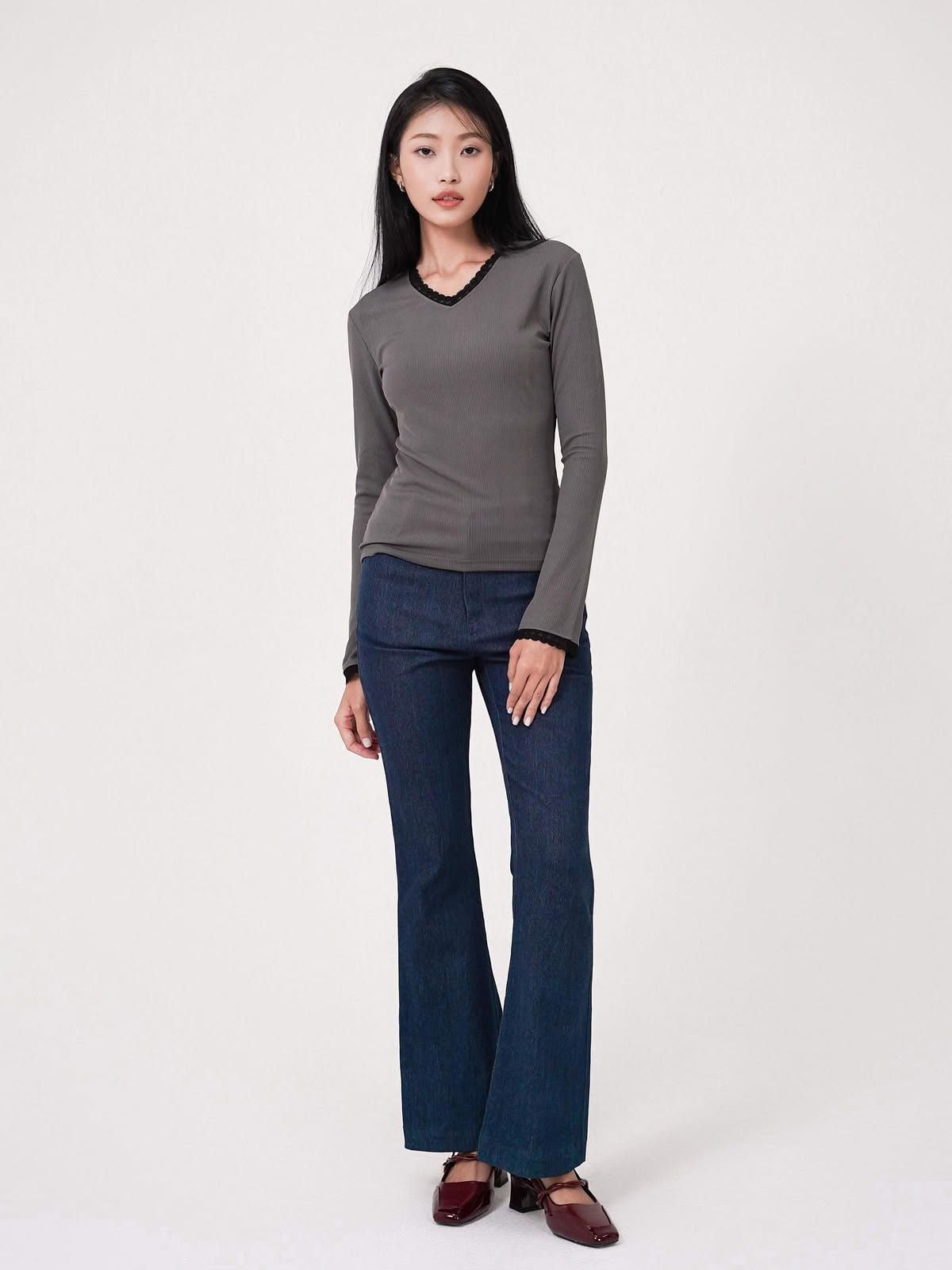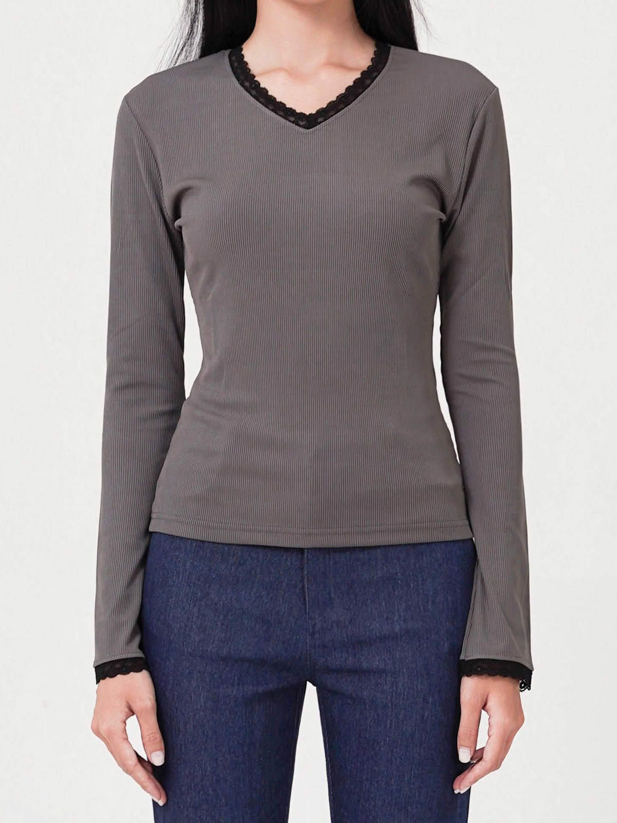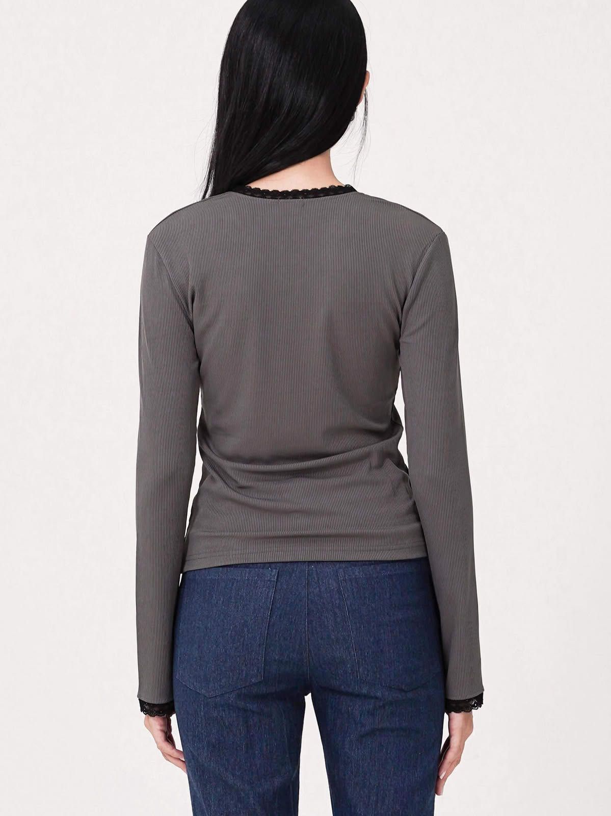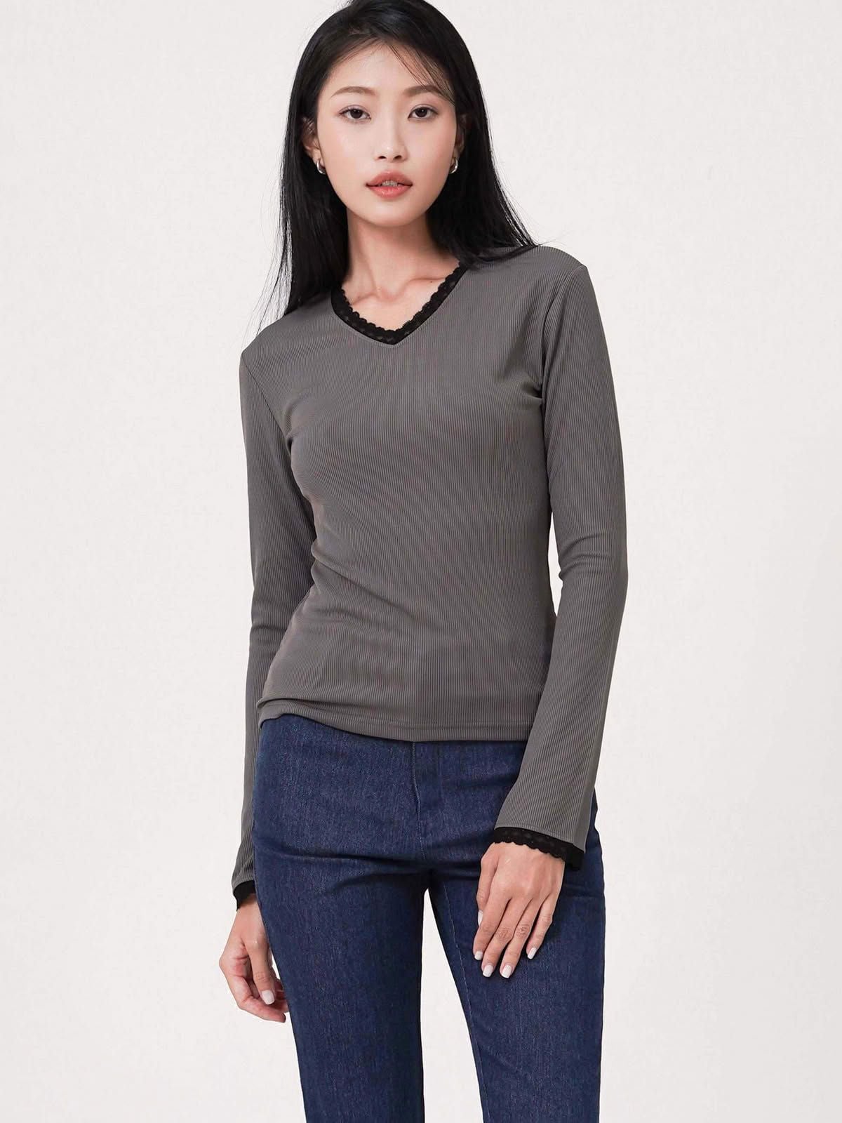 - Áo thun dài tay cổ tim, cổ và lai áo có viền ren, chất vải dày dặn và co giãn tốt