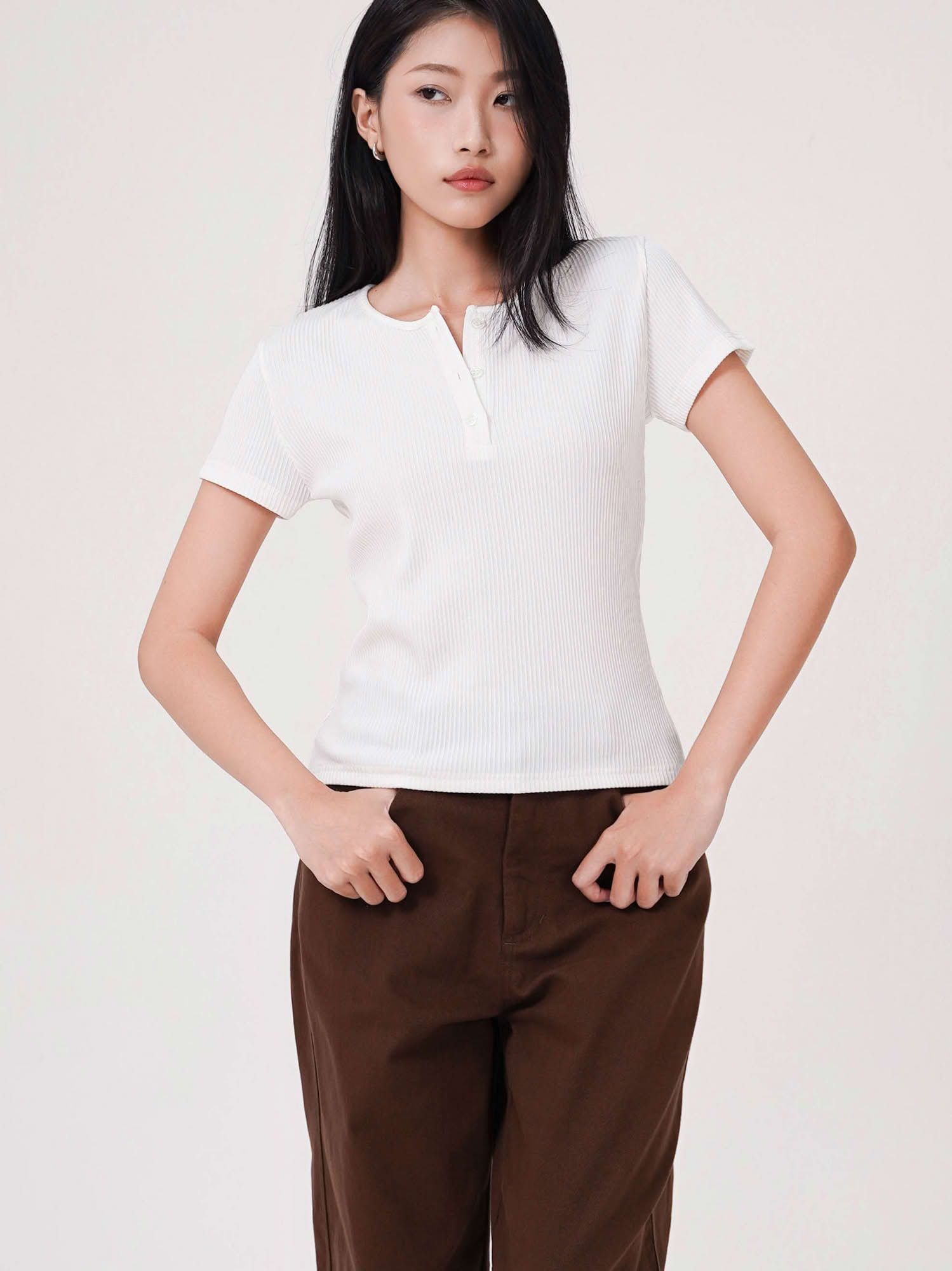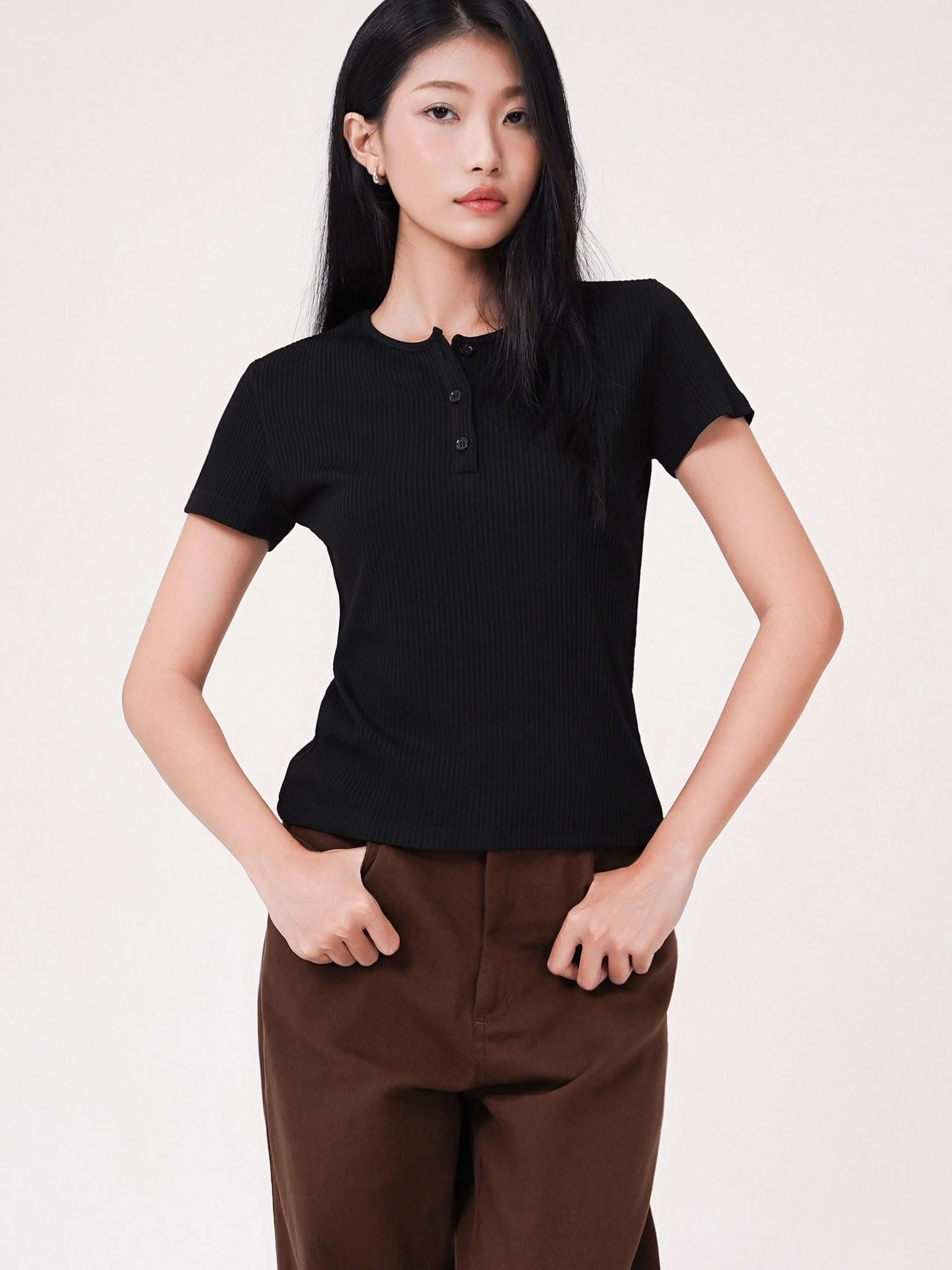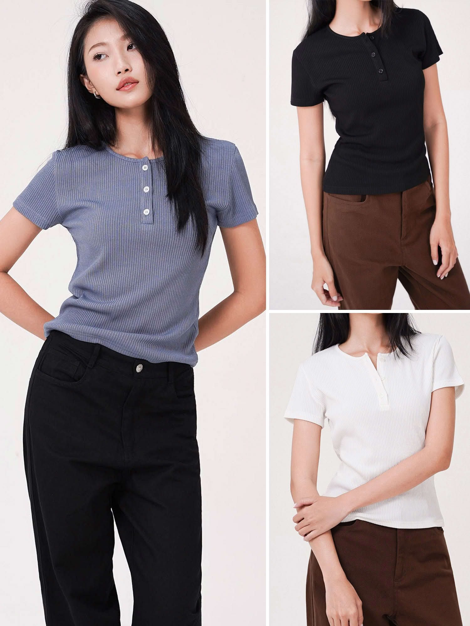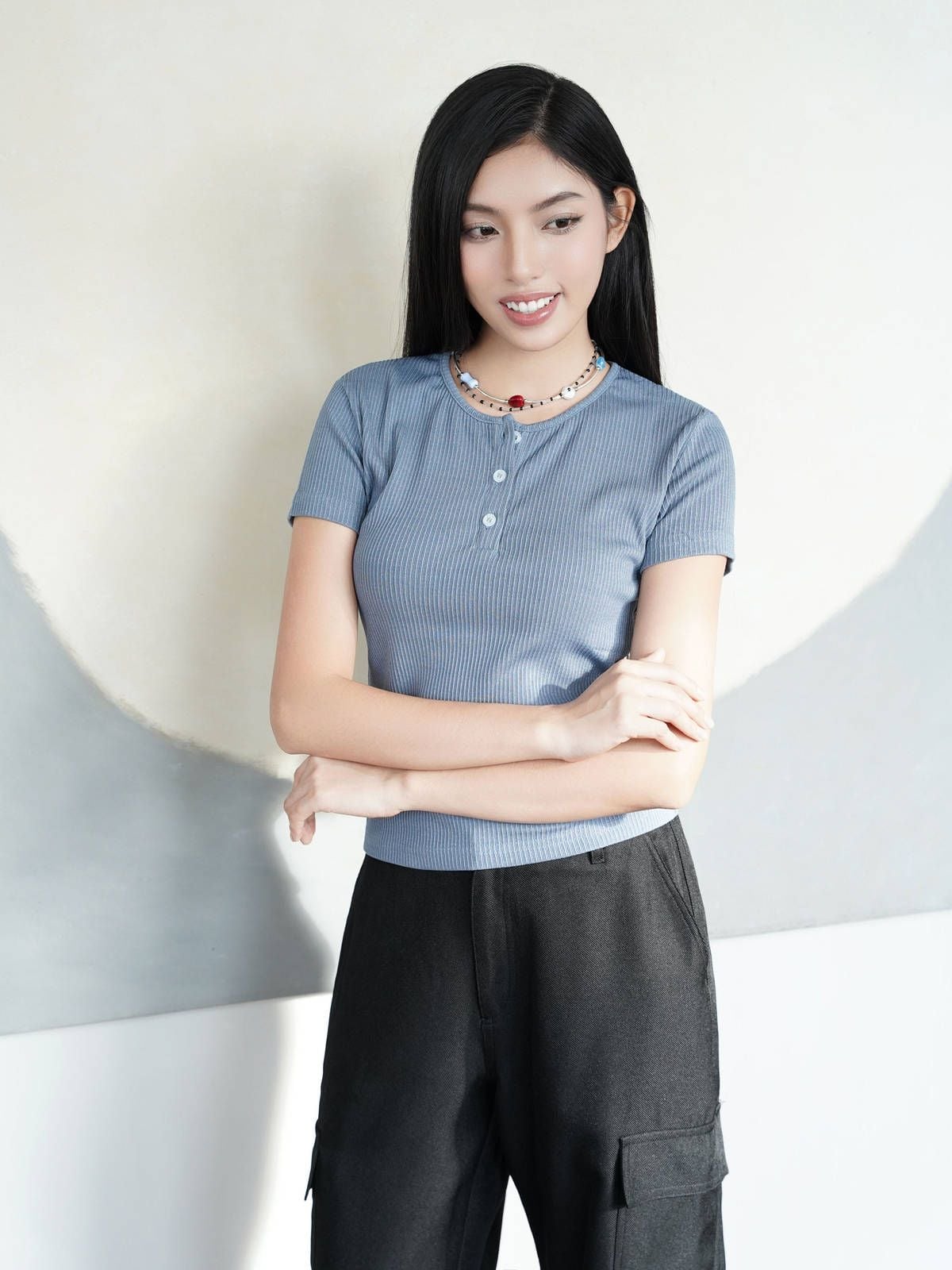 - Áo thun với thiết kế basic nhưng tinh tế với điểm nhấn hàng nút phía trước, tay ngắn là item không thể thiếu trong tủ đồ của nàng. Chất liệu thun đũa co giãn nhẹ, ôm body vừa phải – tôn dáng nhưng vẫn thoải mái. Dễ phối cùng nhiều item từ quần jean, kaki đến chân váy.