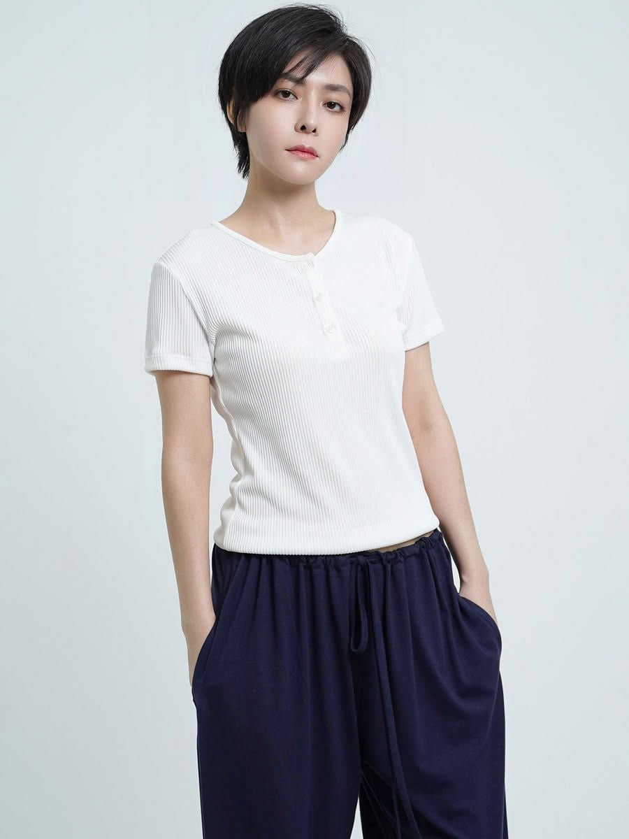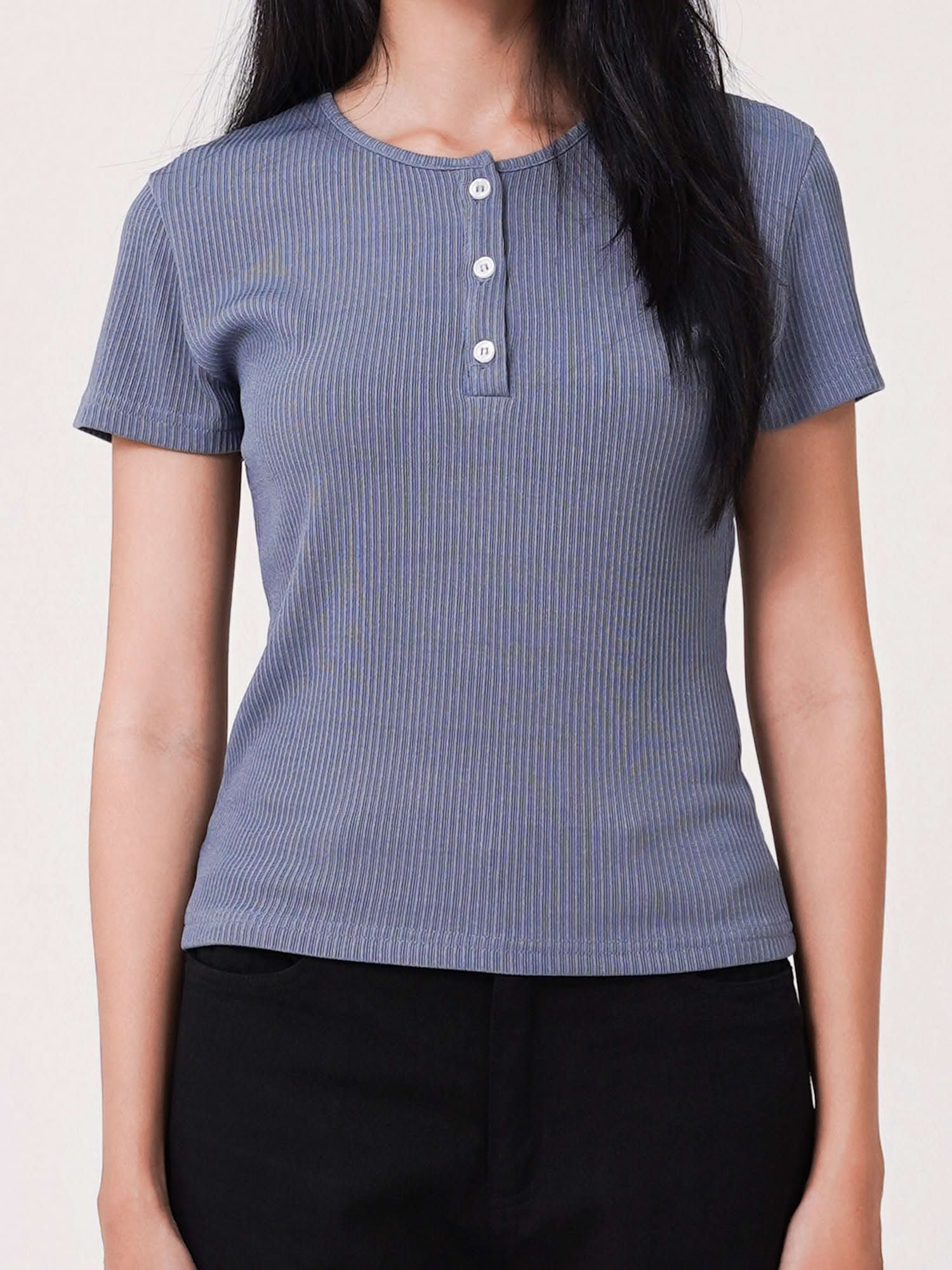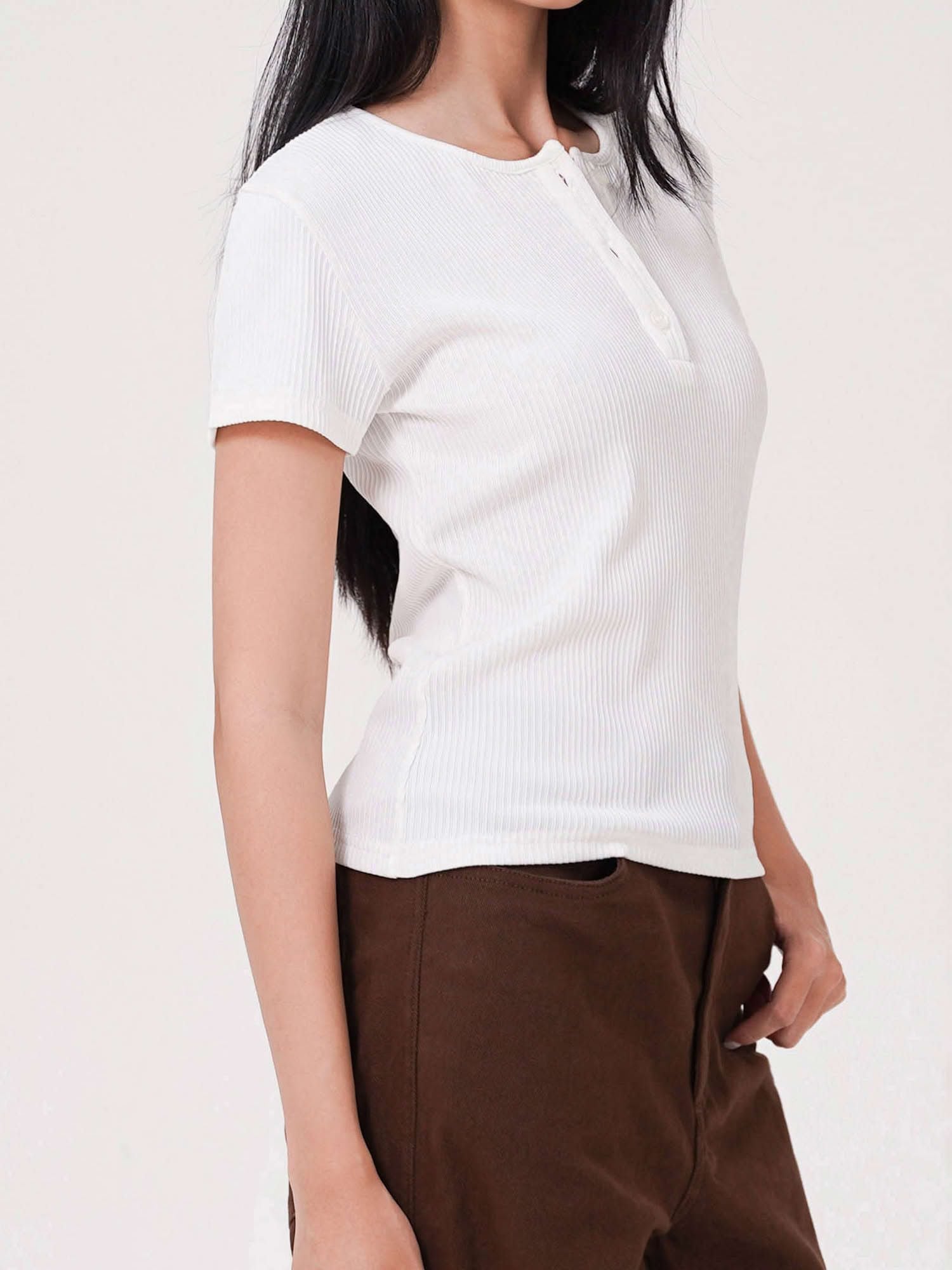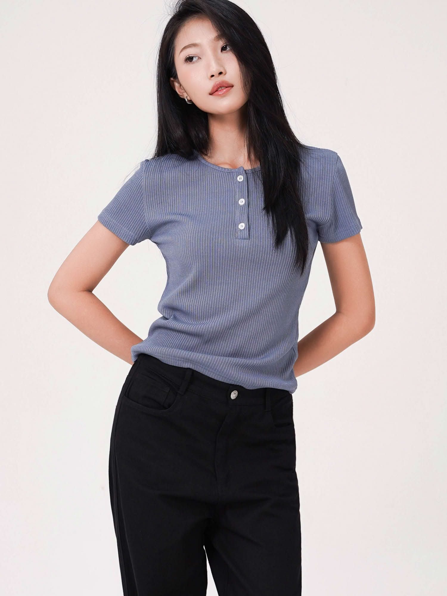 - Áo thun với thiết kế basic nhưng tinh tế với điểm nhấn hàng nút phía trước, tay ngắn là item không thể thiếu trong tủ đồ của nàng. Chất liệu thun đũa co giãn nhẹ, ôm body vừa phải – tôn dáng nhưng vẫn thoải mái. Dễ phối cùng nhiều item từ quần jean, kaki đến chân váy.