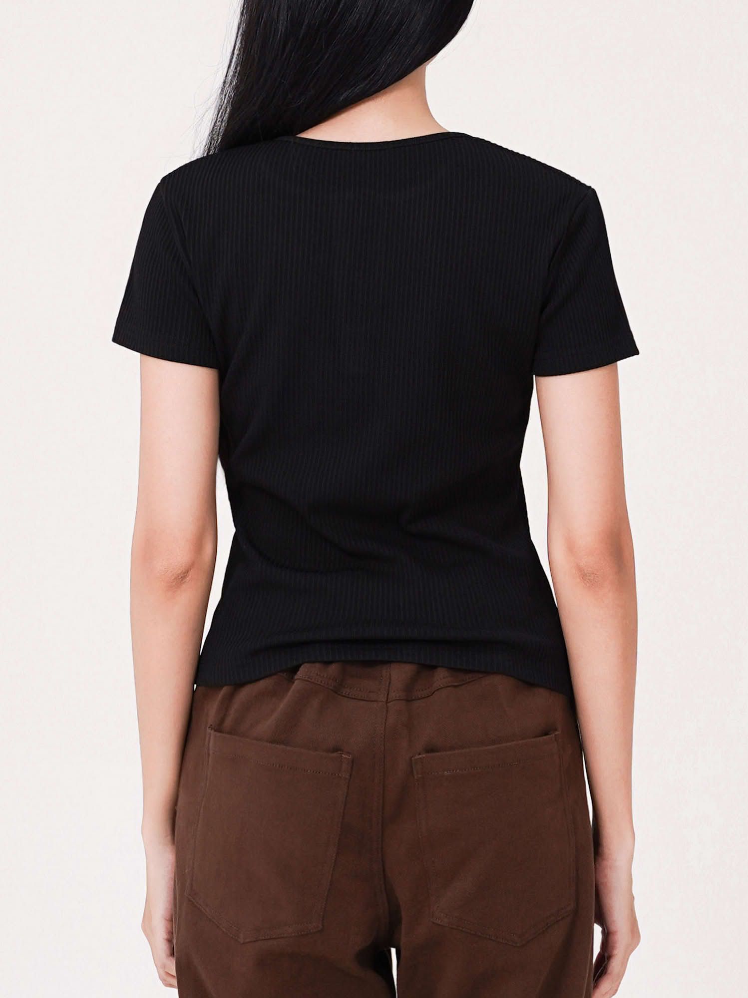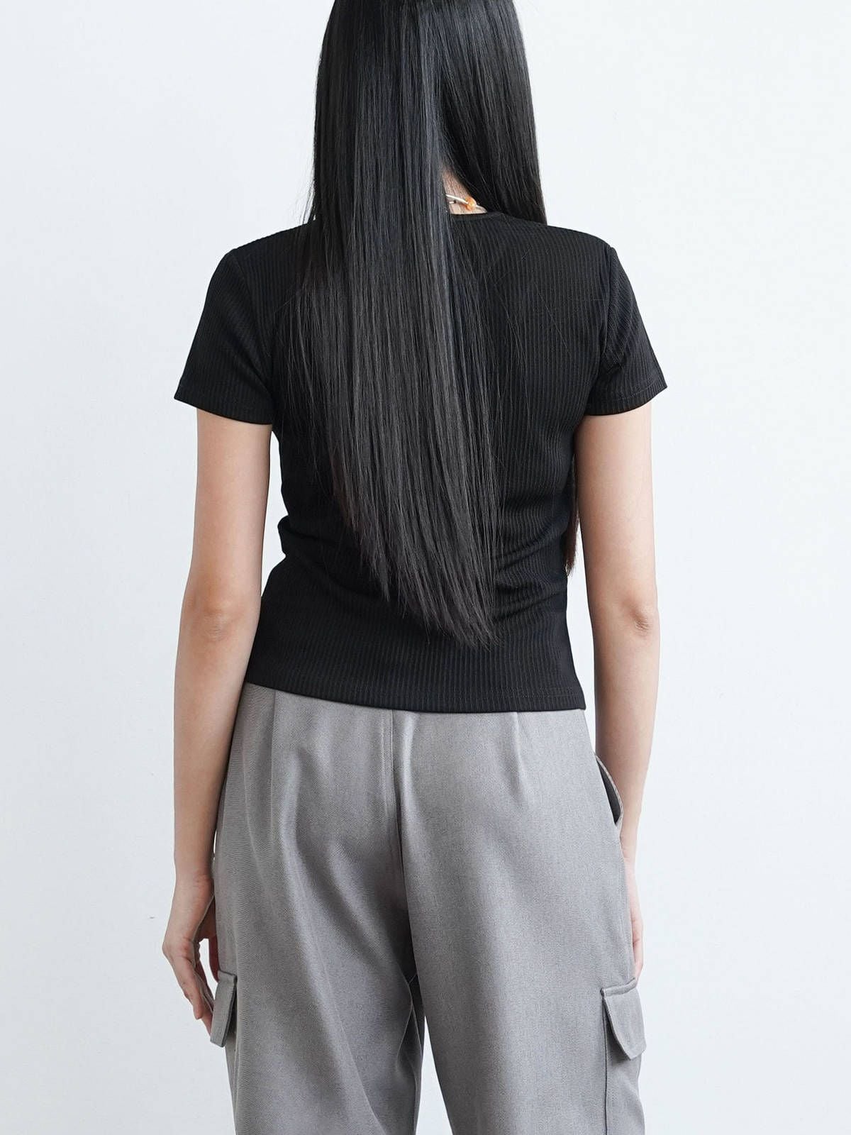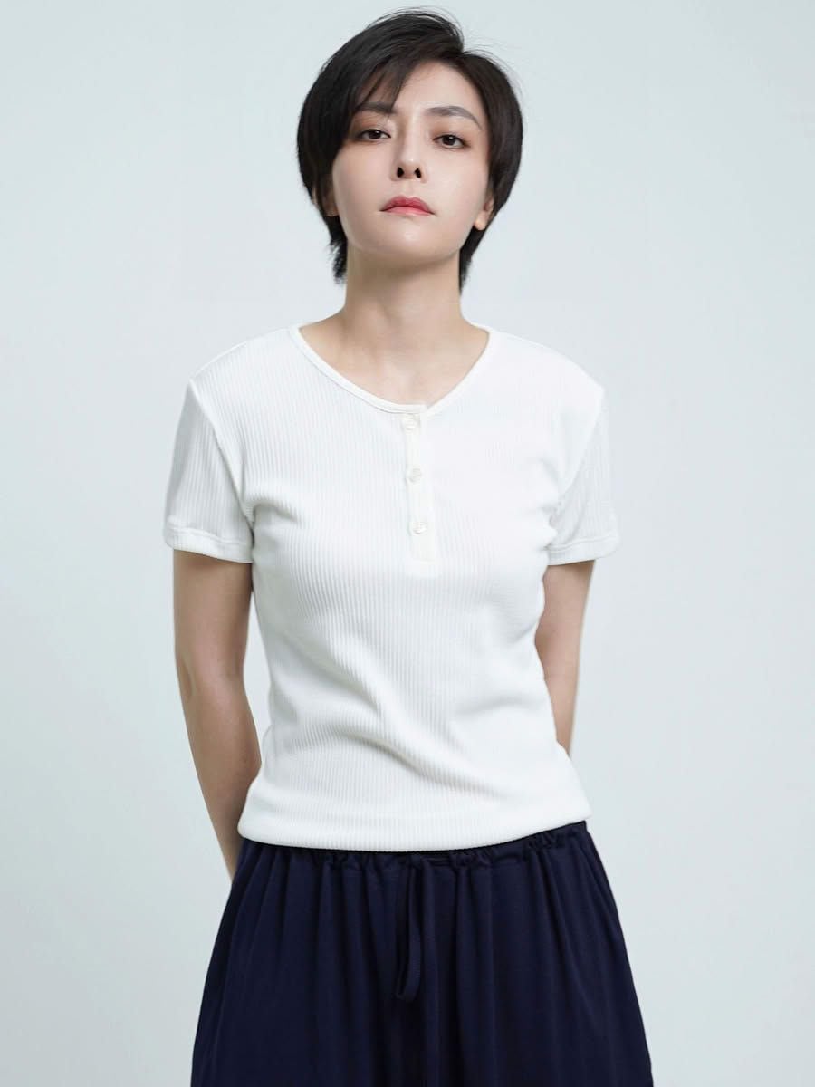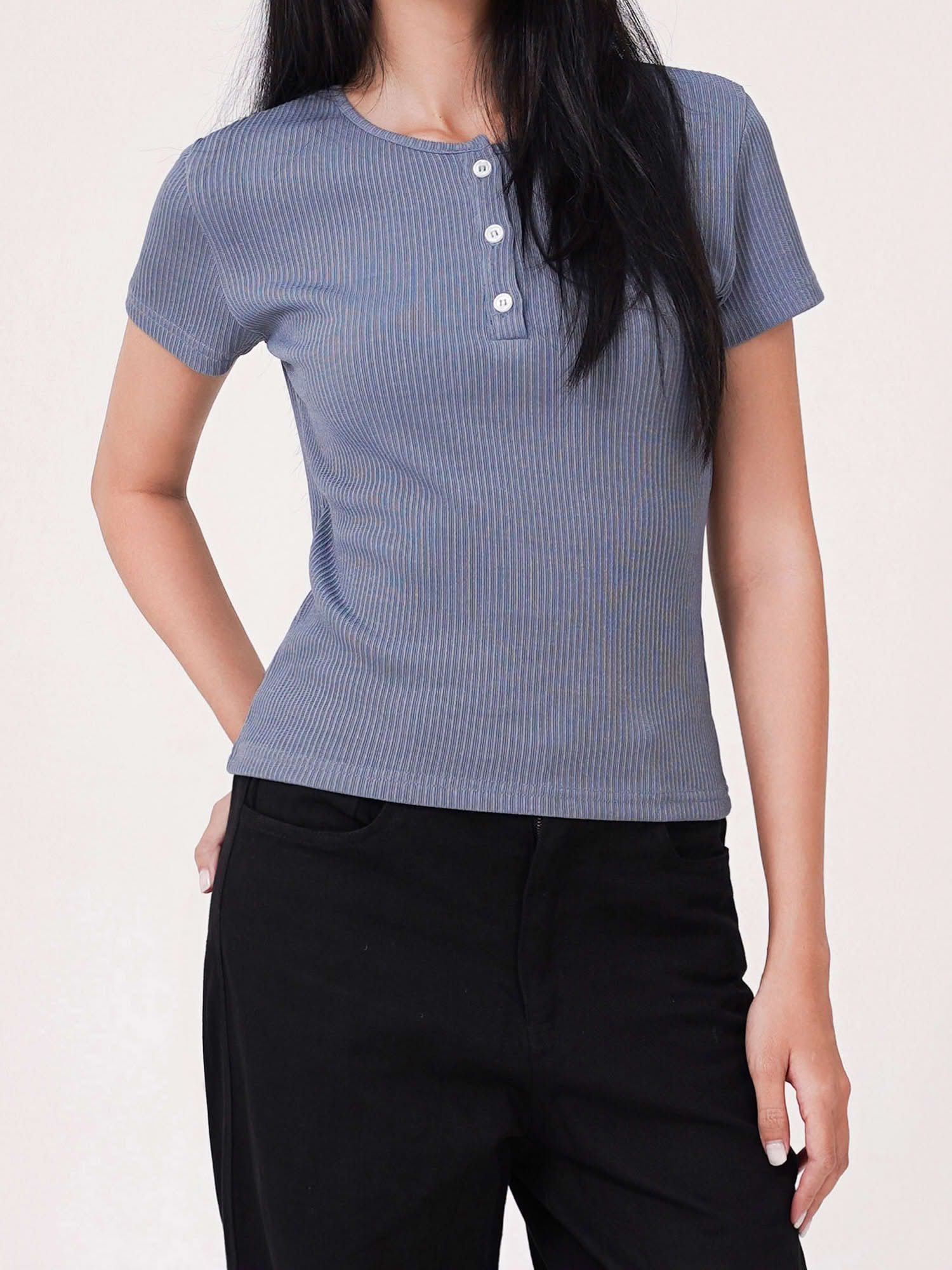 - Áo thun với thiết kế basic nhưng tinh tế với điểm nhấn hàng nút phía trước, tay ngắn là item không thể thiếu trong tủ đồ của nàng. Chất liệu thun đũa co giãn nhẹ, ôm body vừa phải – tôn dáng nhưng vẫn thoải mái. Dễ phối cùng nhiều item từ quần jean, kaki đến chân váy.