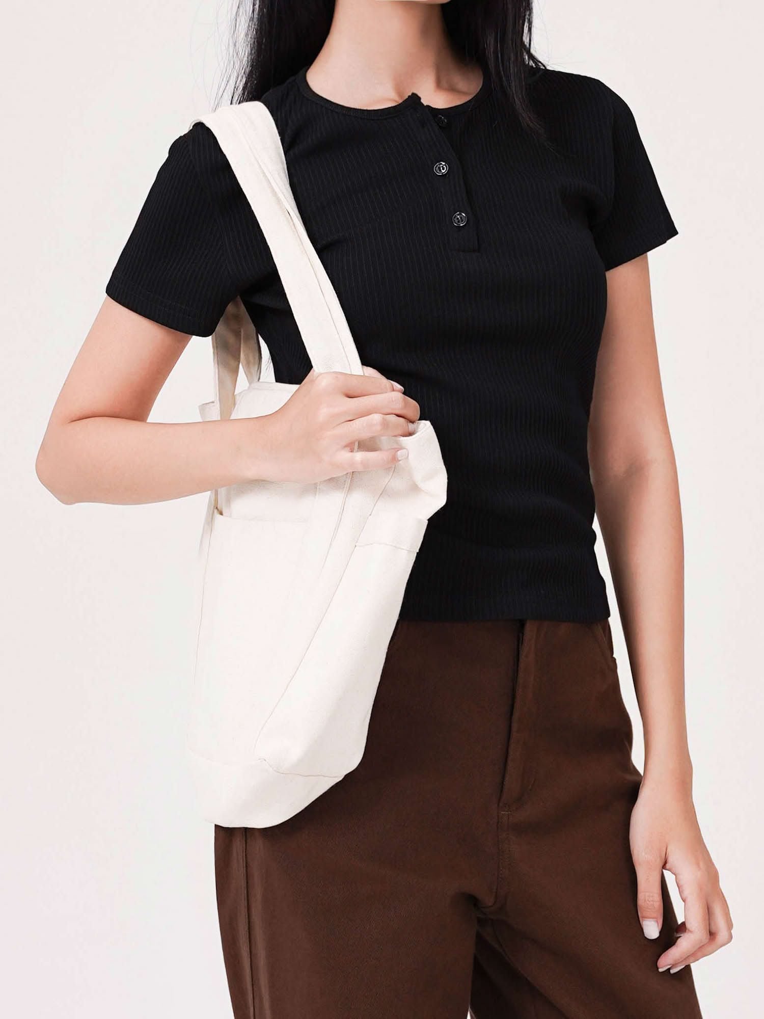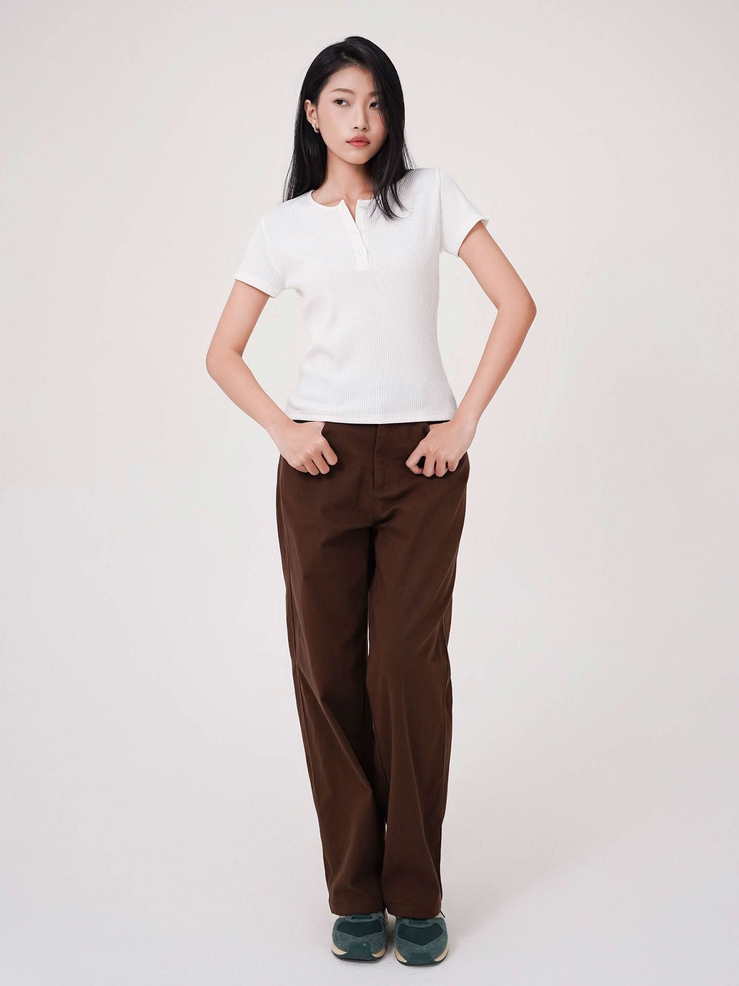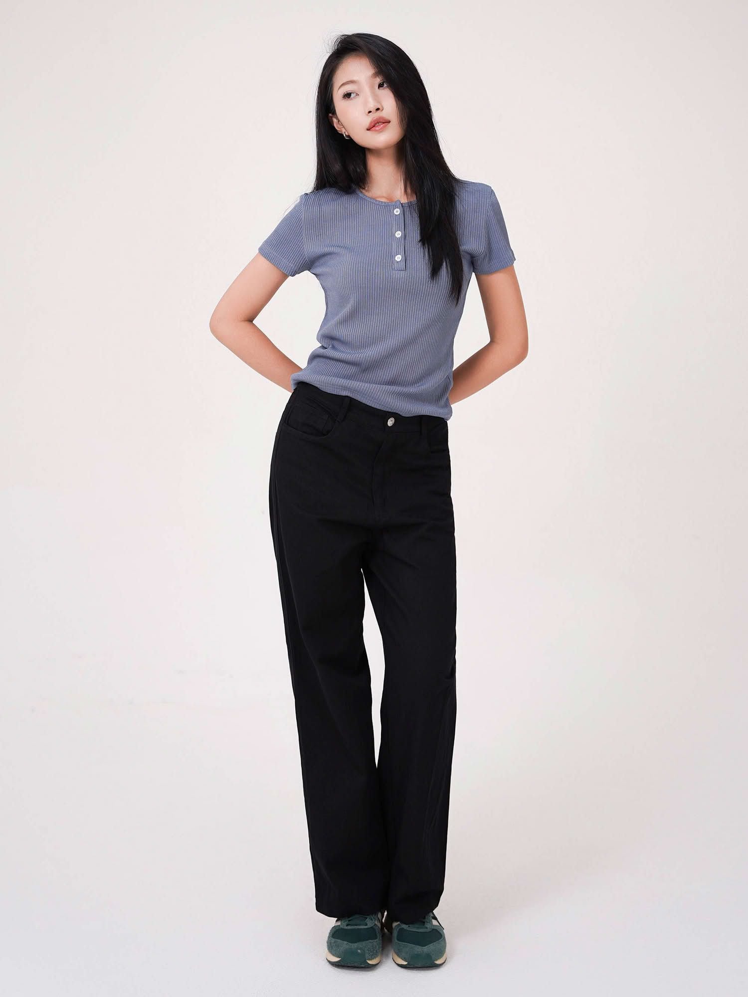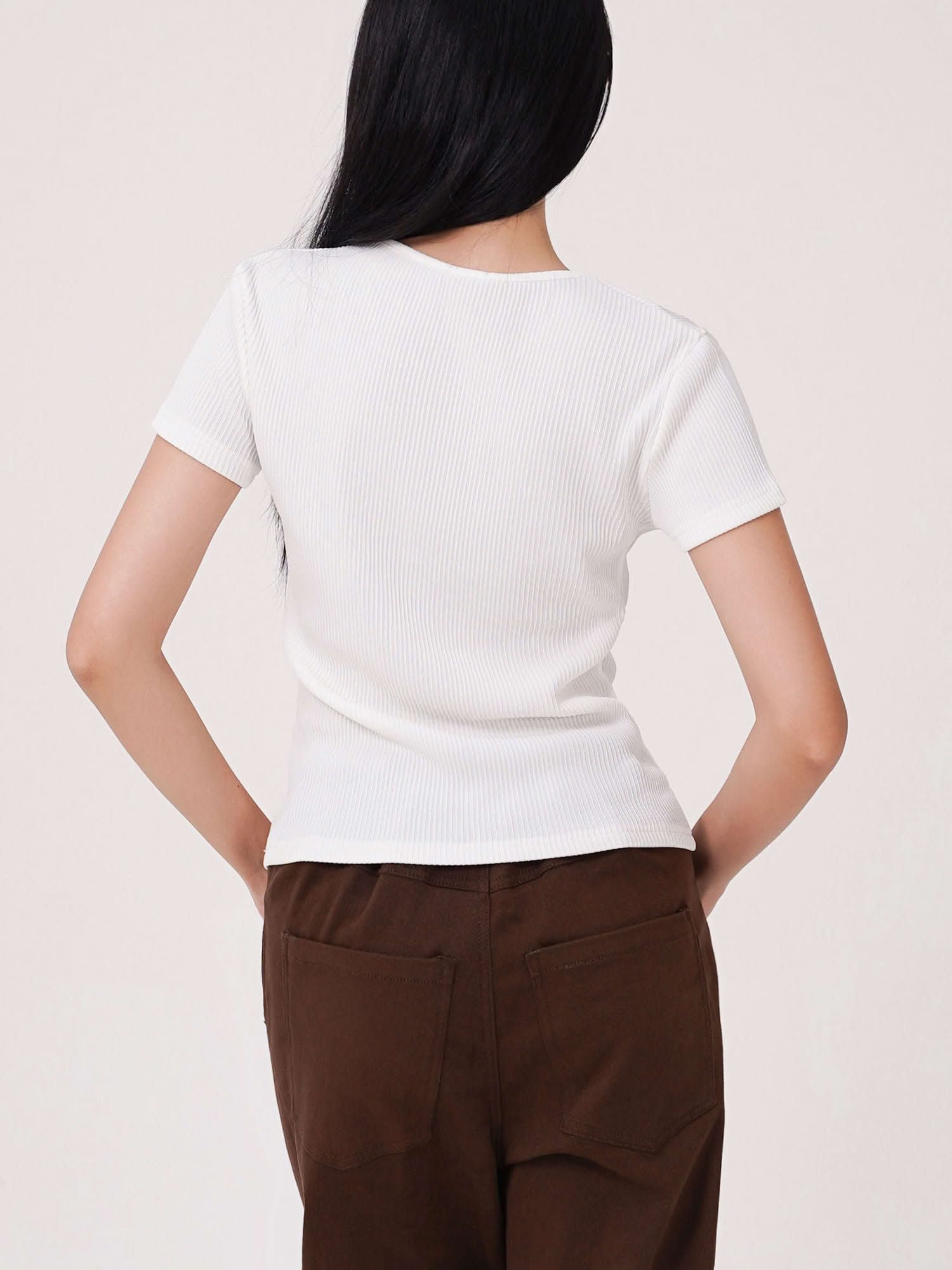 - Áo thun với thiết kế basic nhưng tinh tế với điểm nhấn hàng nút phía trước, tay ngắn là item không thể thiếu trong tủ đồ của nàng. Chất liệu thun đũa co giãn nhẹ, ôm body vừa phải – tôn dáng nhưng vẫn thoải mái. Dễ phối cùng nhiều item từ quần jean, kaki đến chân váy.