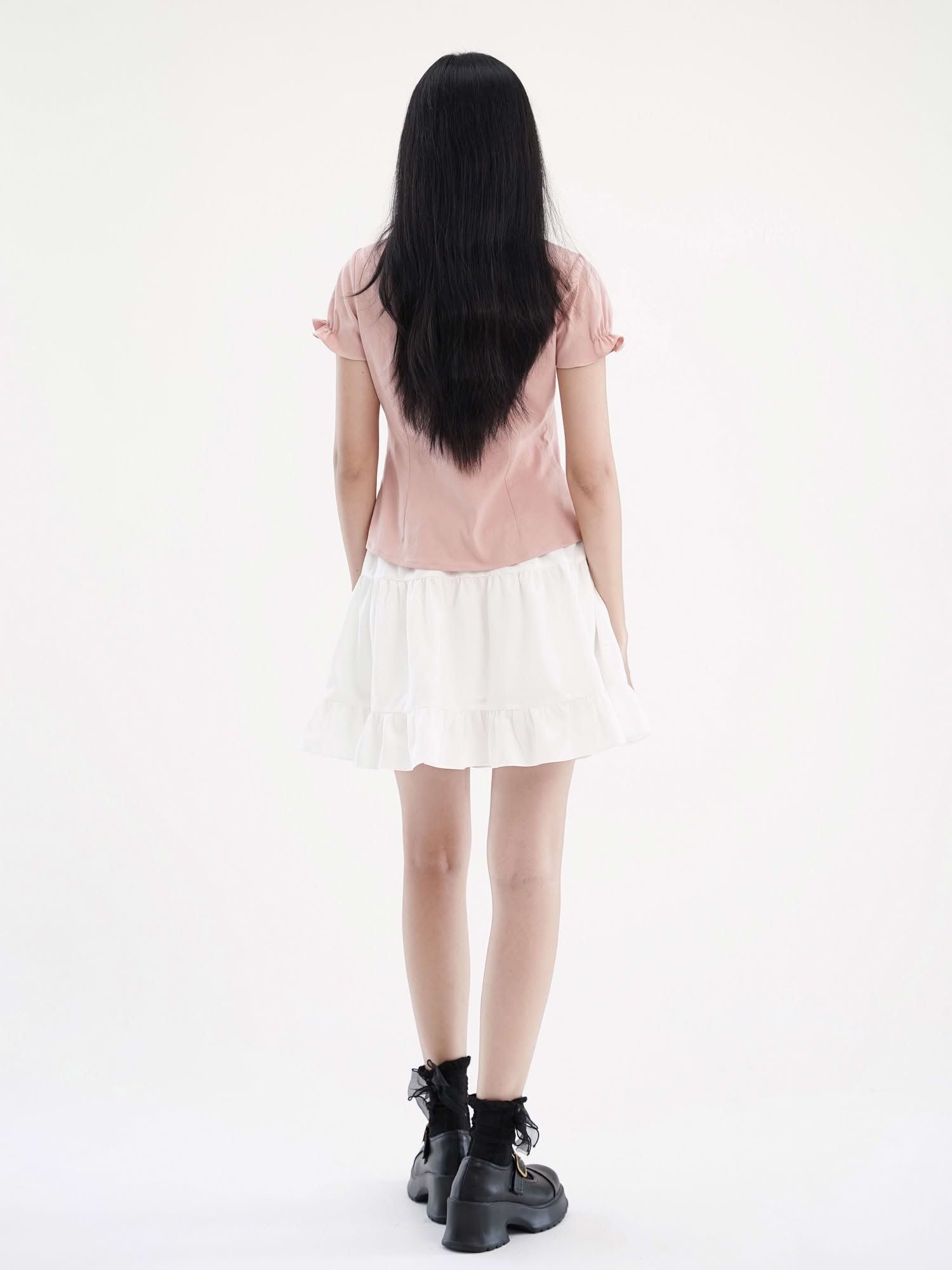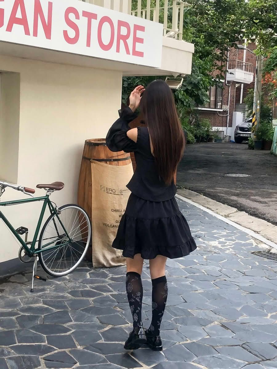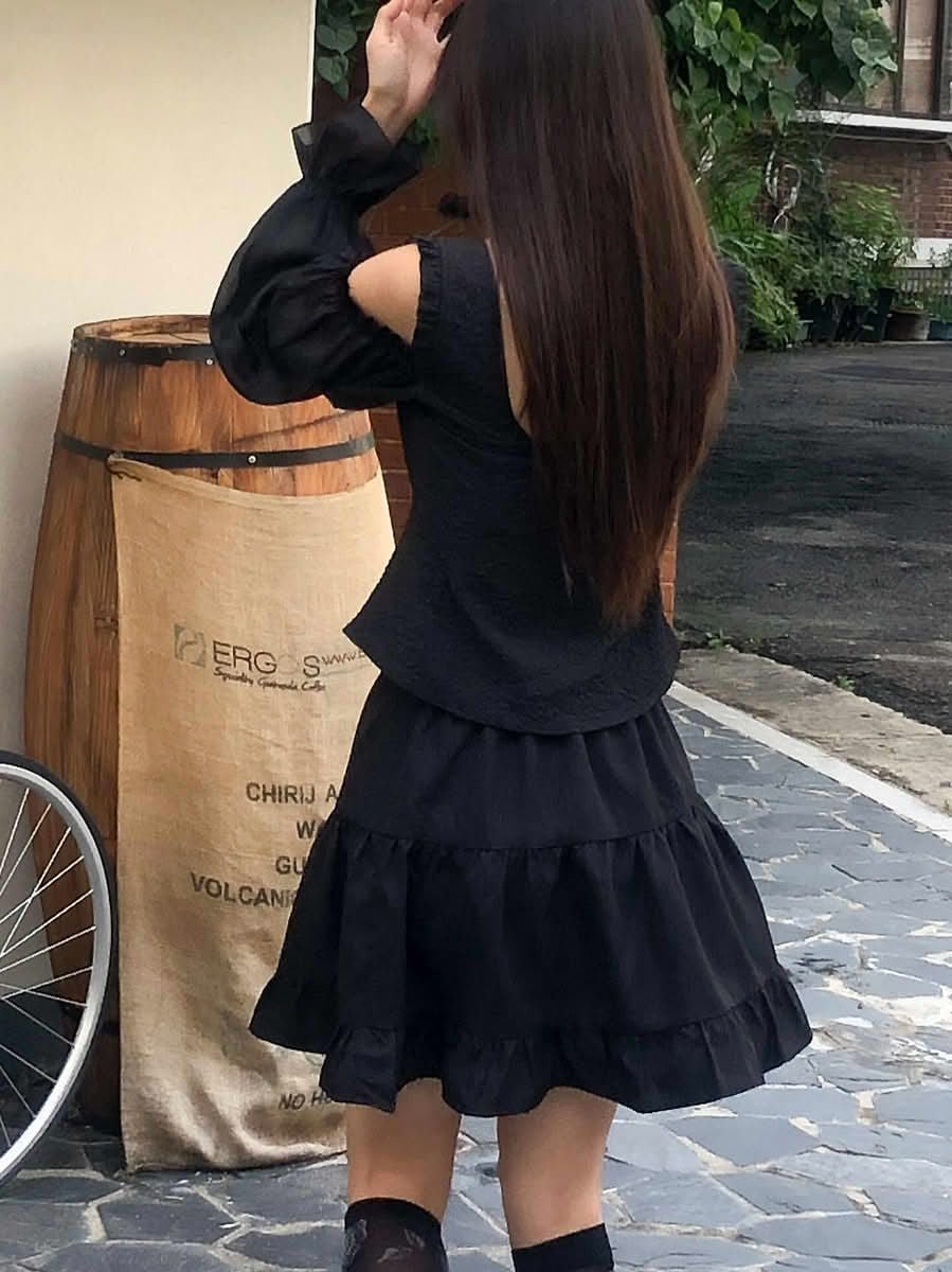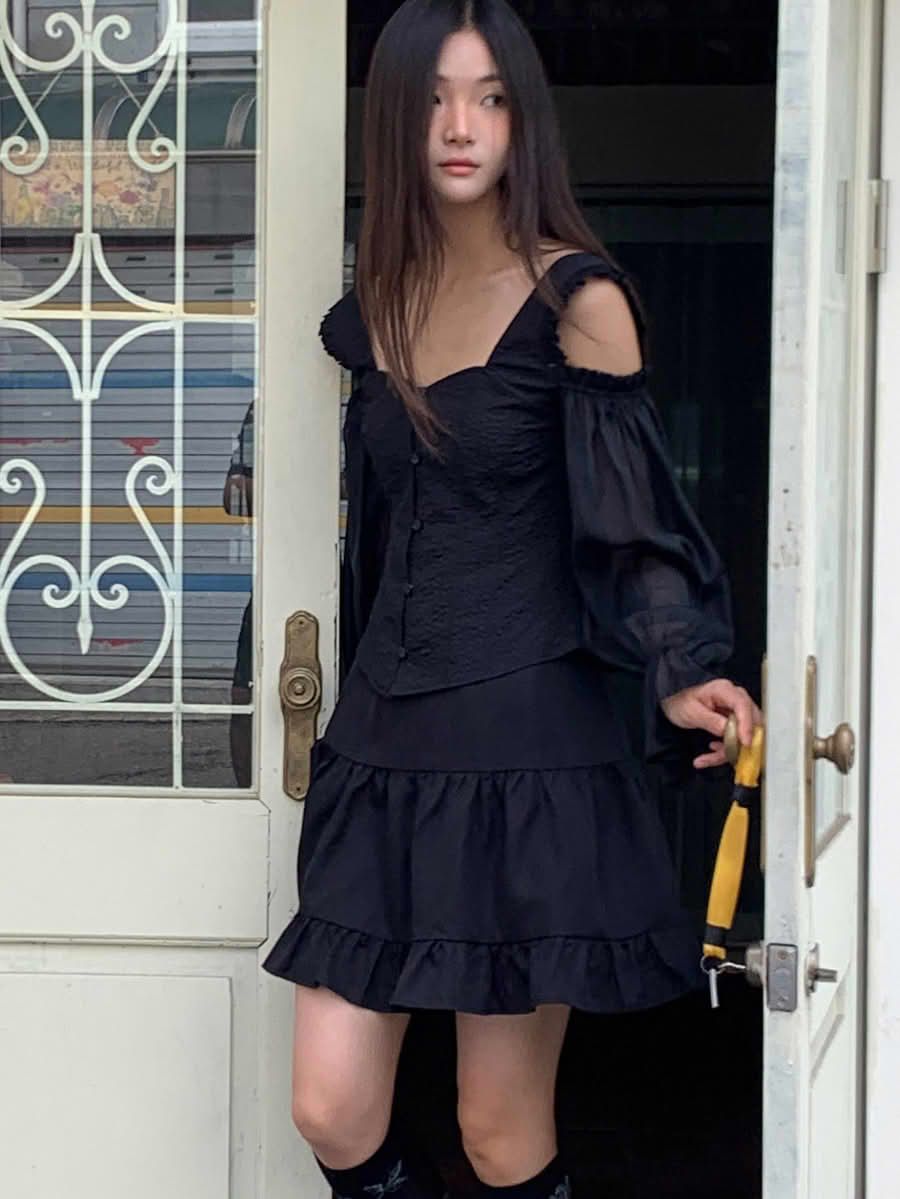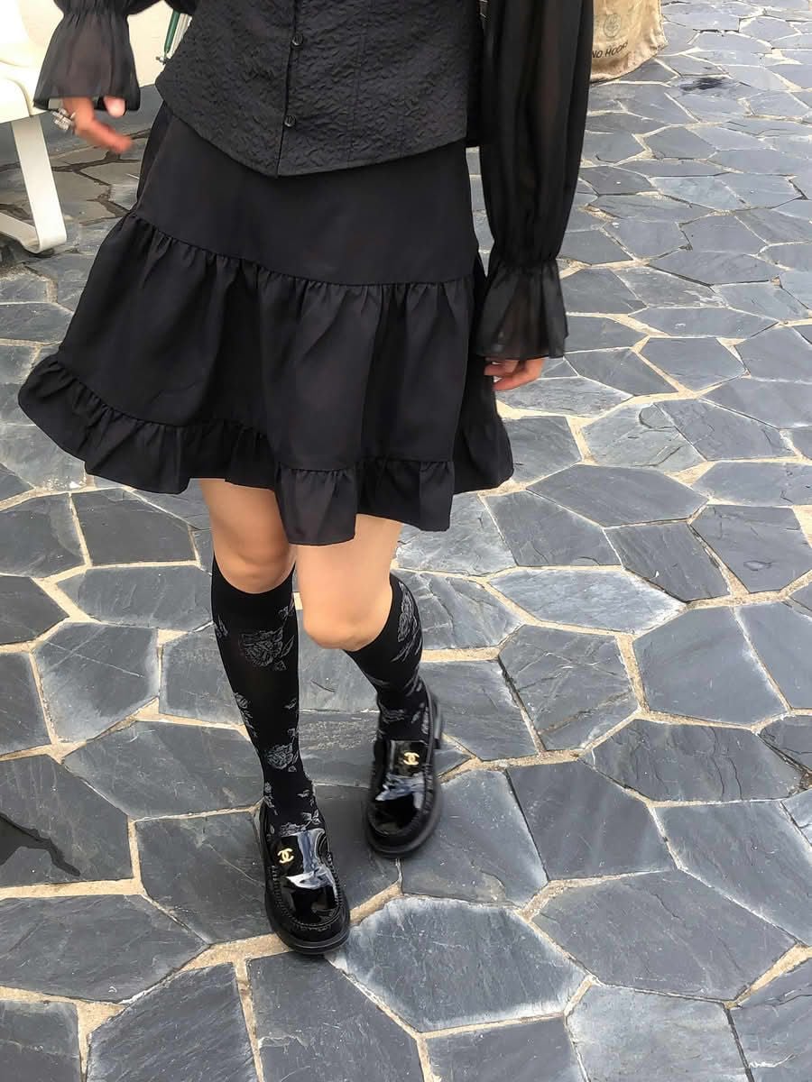 - Chân váy xòe chữ A, lưng sau thun co giãn nhẹ, dài trên gối hack dáng, tạo sự thoải mái và che khuyết điểm phần hông – đùi. Chia tầng (3 tầng), có nhún nhẹ tạo độ bồng bềnh, tăng nét nữ tính.