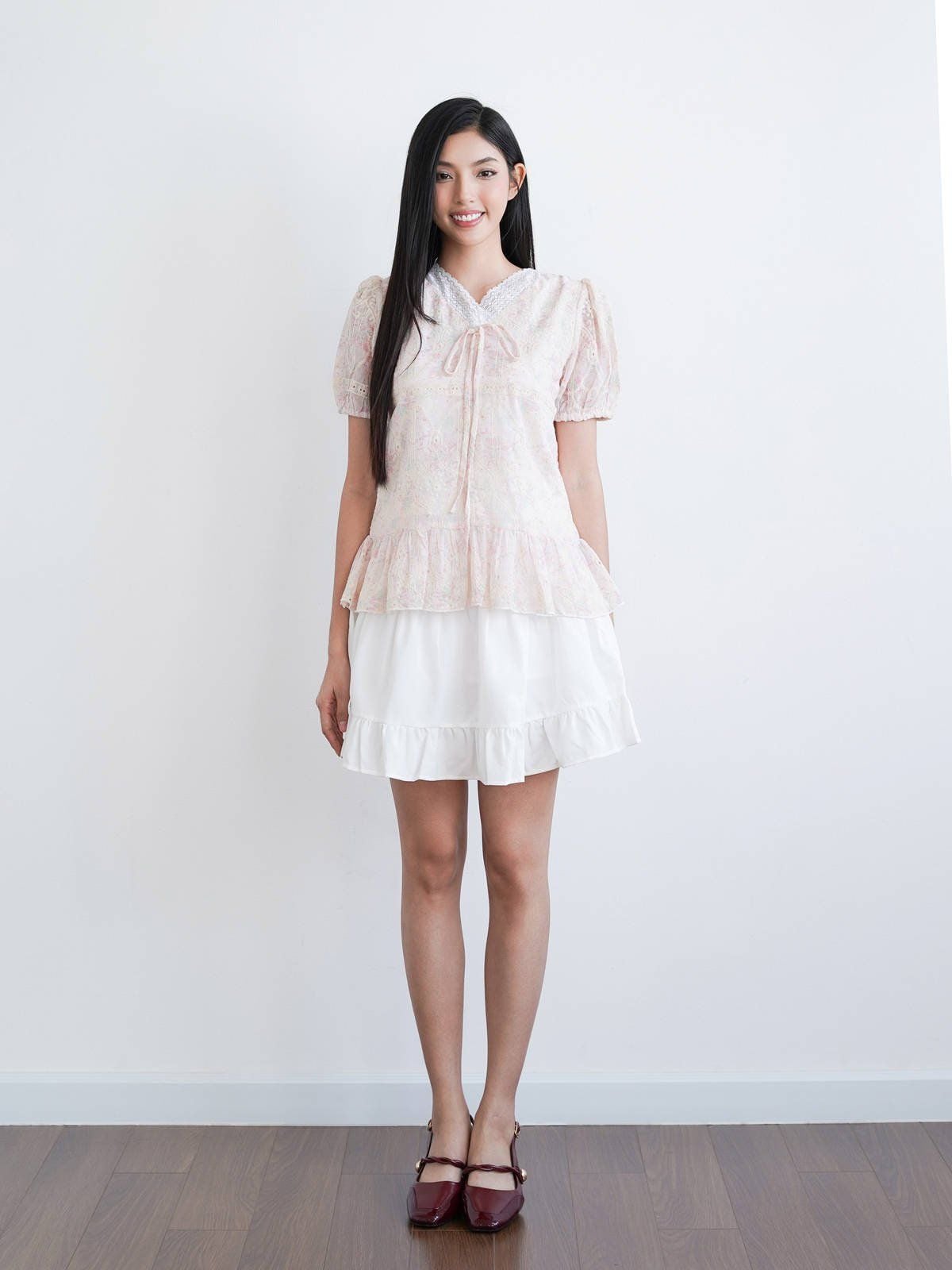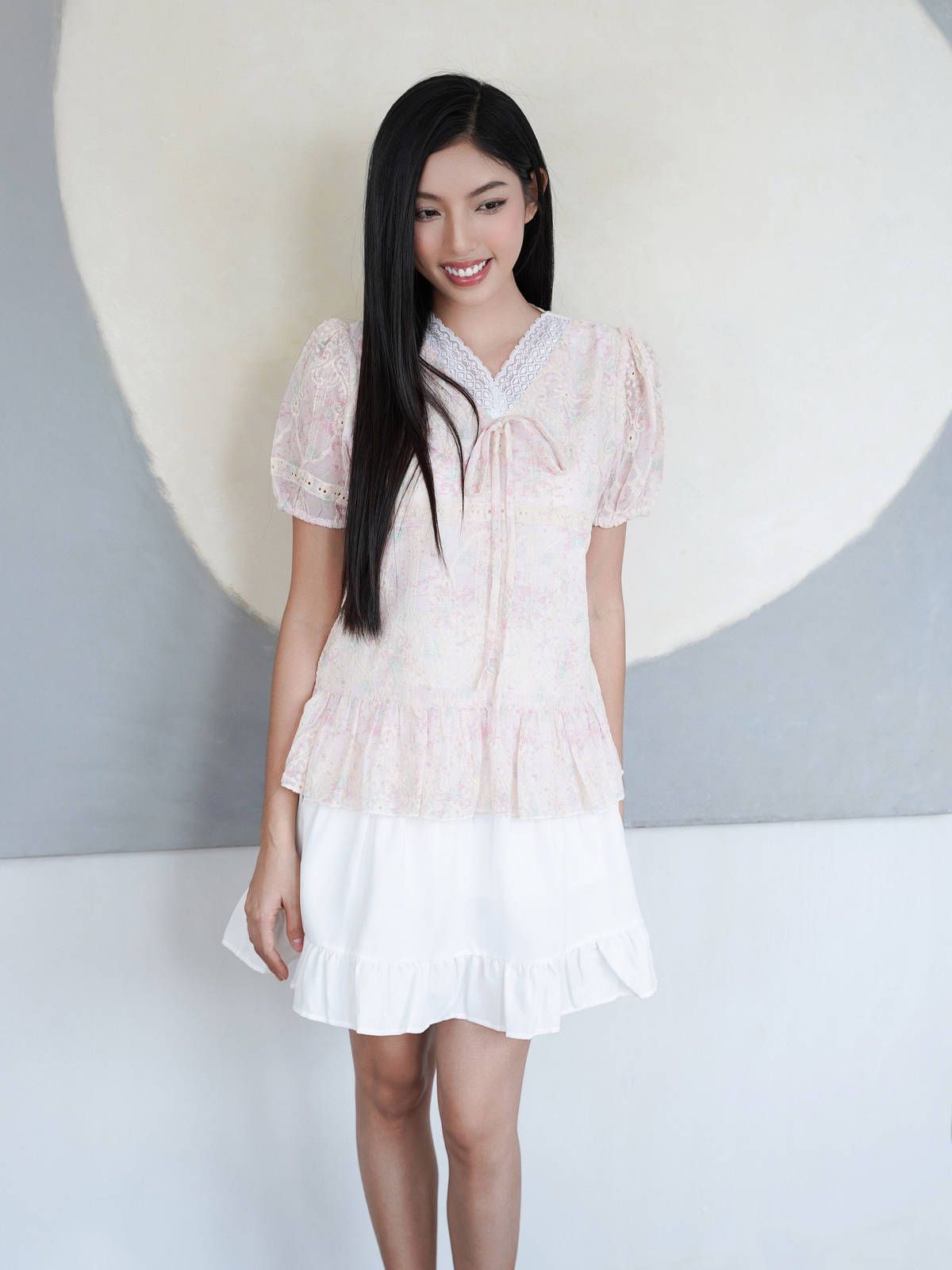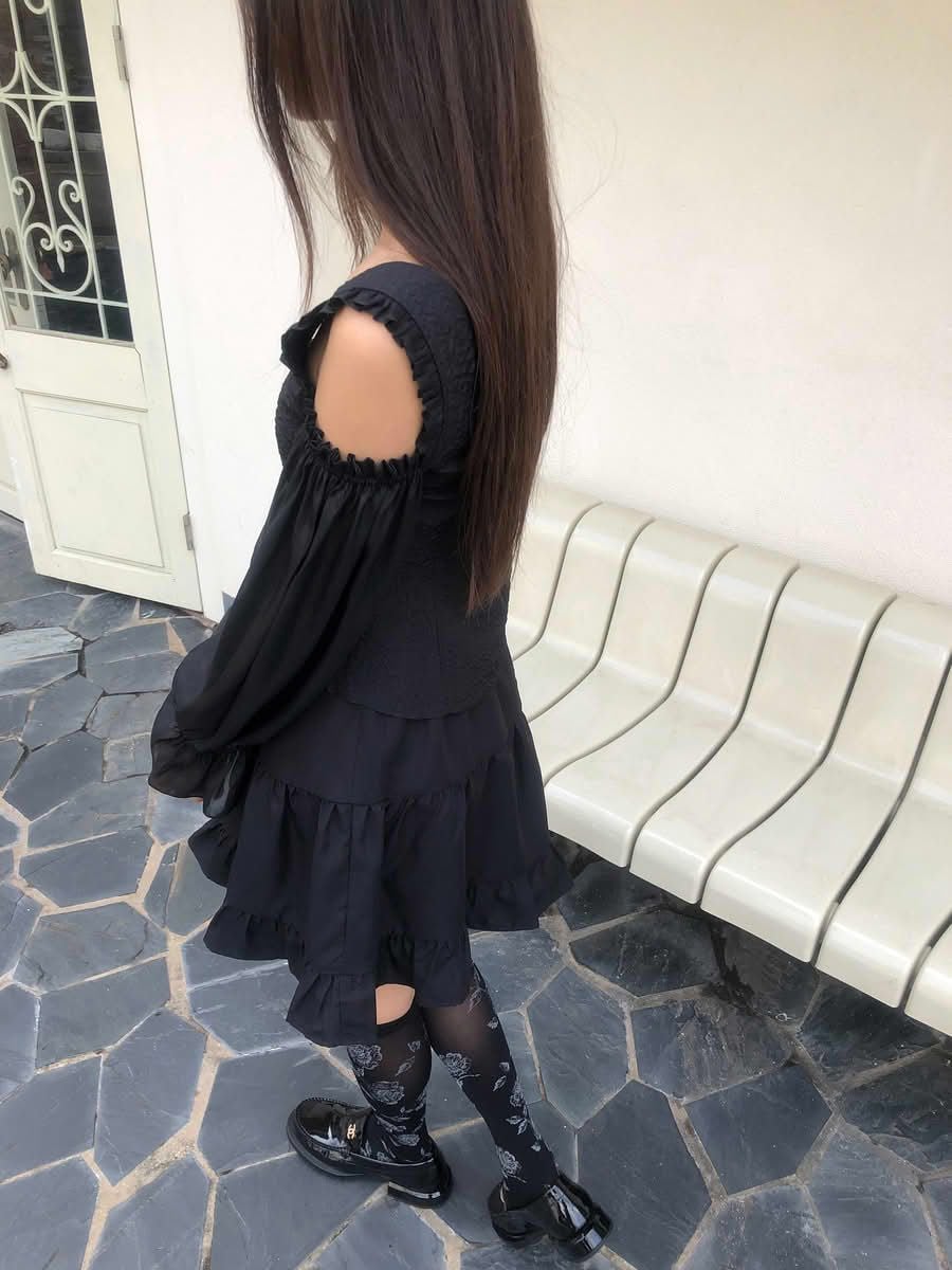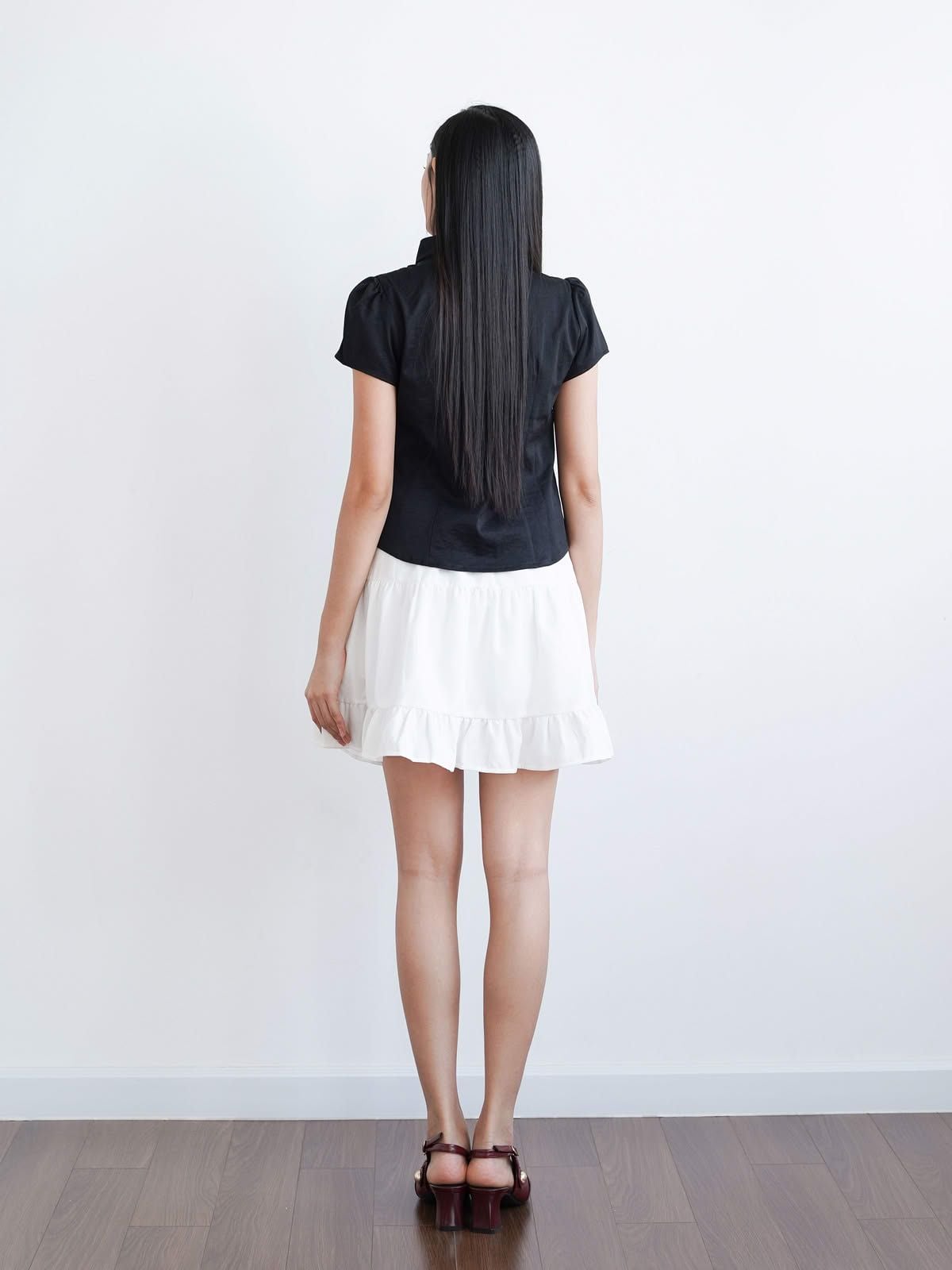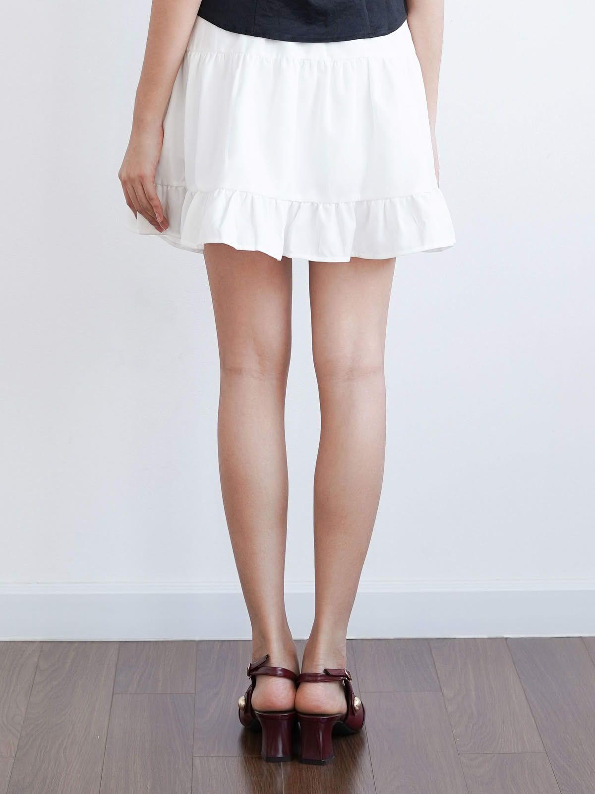 - Chân váy xòe chữ A, lưng sau thun co giãn nhẹ, dài trên gối hack dáng, tạo sự thoải mái và che khuyết điểm phần hông – đùi. Chia tầng (3 tầng), có nhún nhẹ tạo độ bồng bềnh, tăng nét nữ tính.