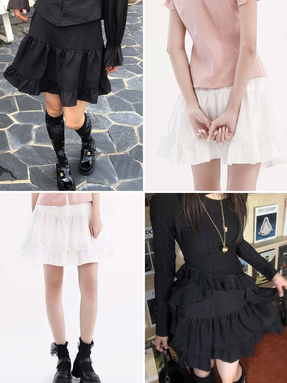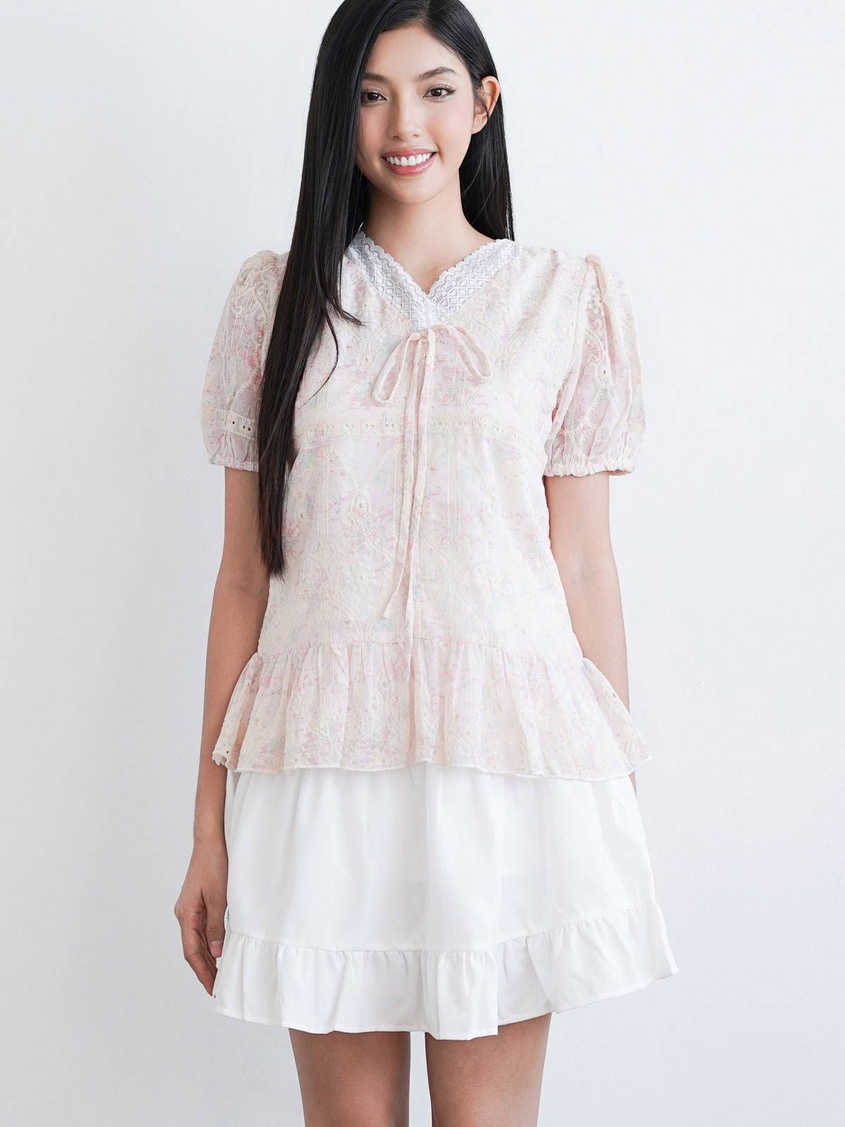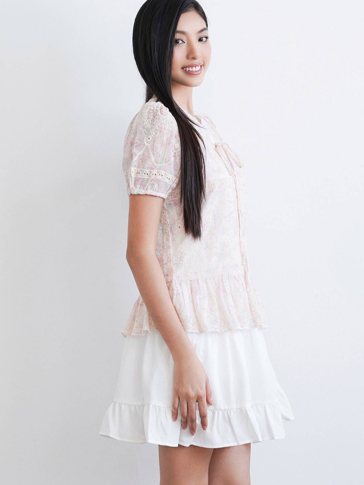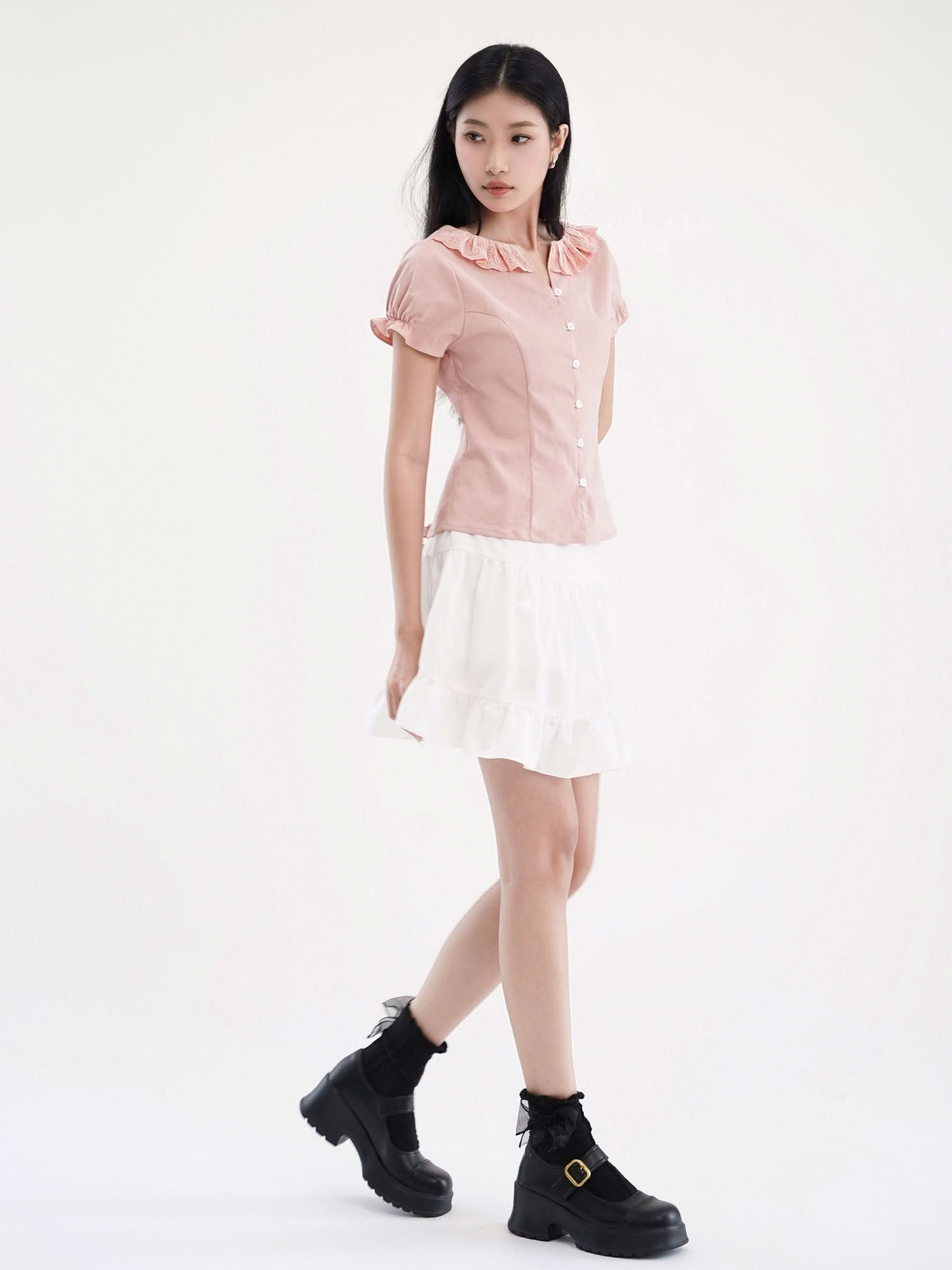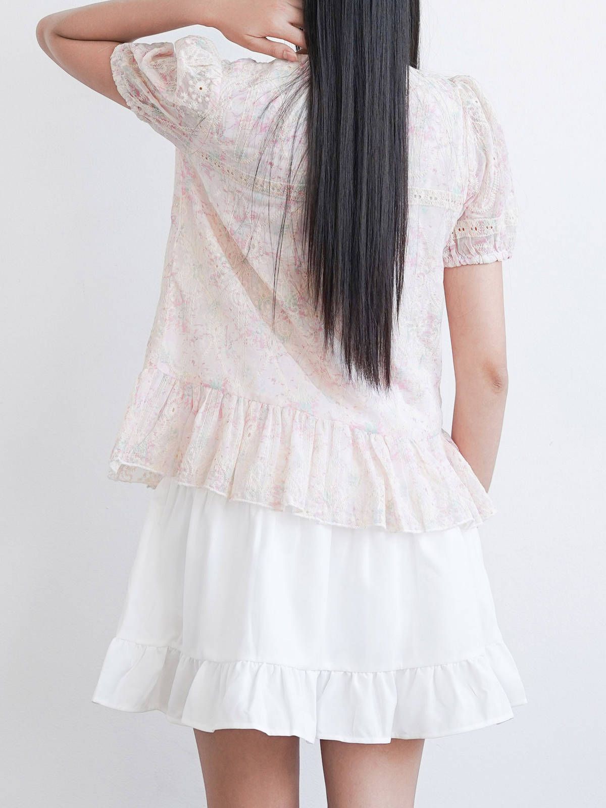 - Chân váy xòe chữ A, lưng sau thun co giãn nhẹ, dài trên gối hack dáng, tạo sự thoải mái và che khuyết điểm phần hông – đùi. Chia tầng (3 tầng), có nhún nhẹ tạo độ bồng bềnh, tăng nét nữ tính.