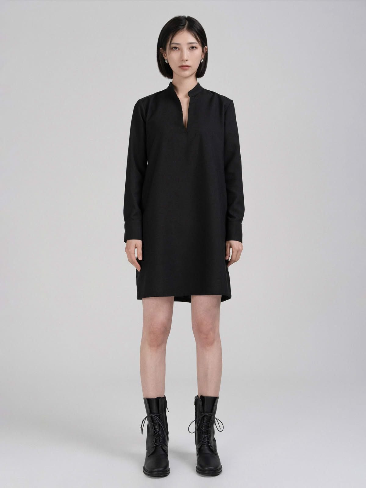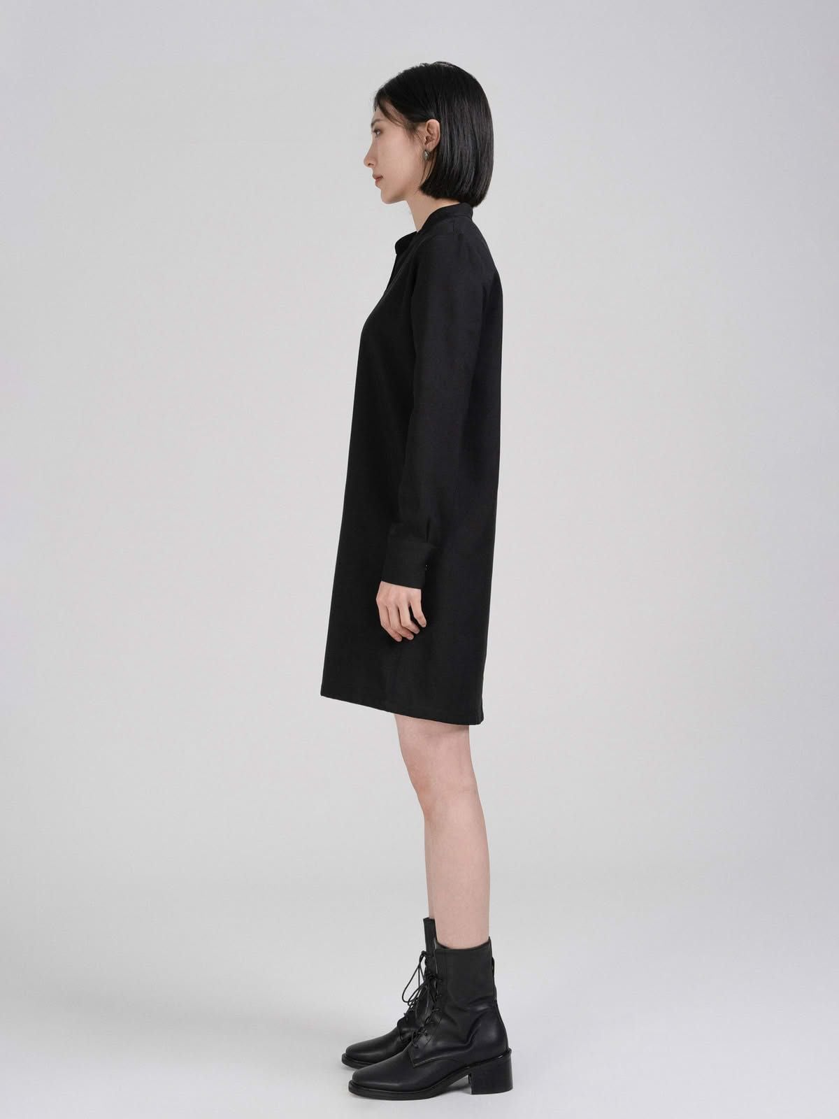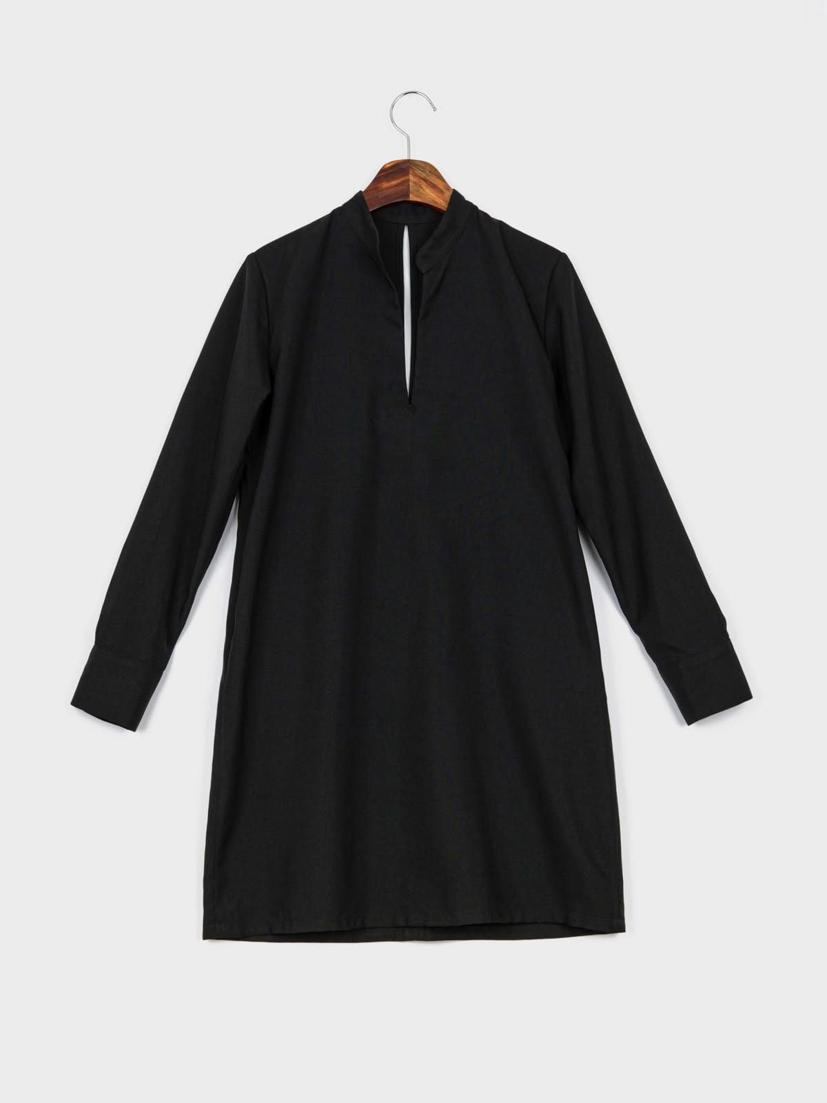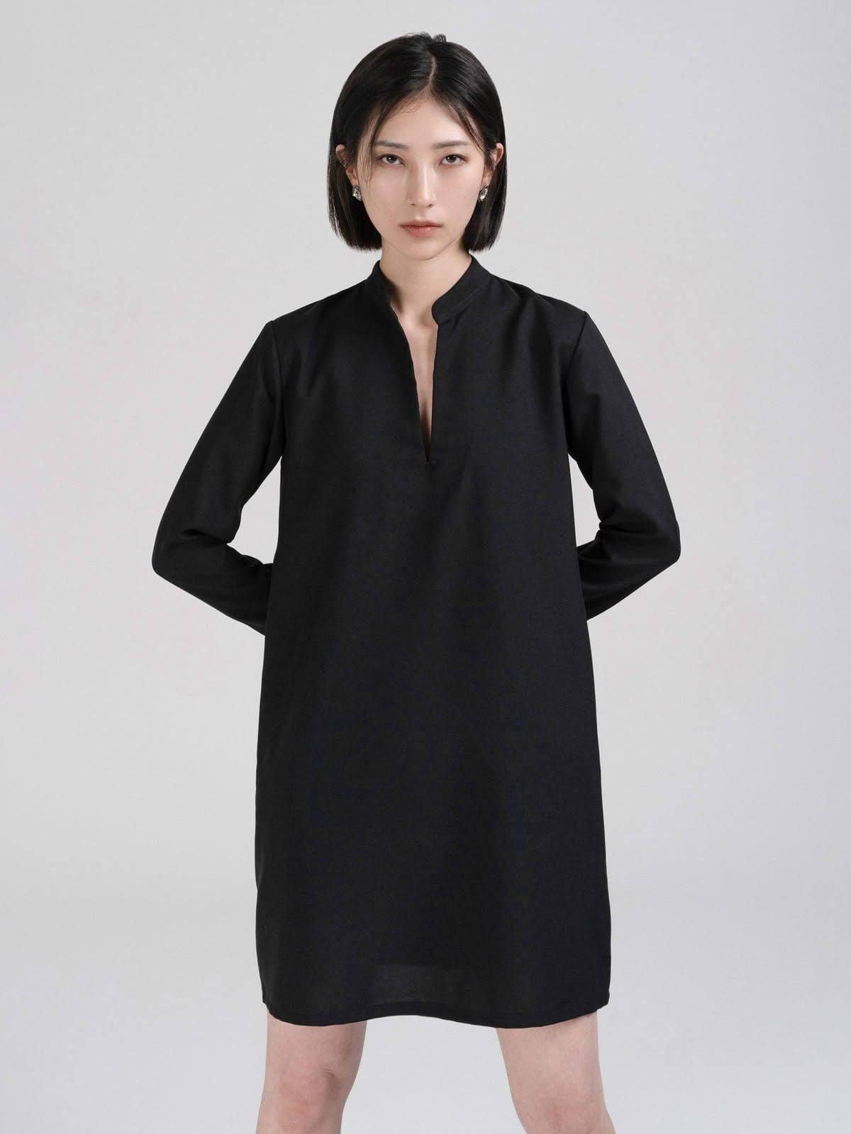 Đầm midi cổ xẻ V, cổ sau xẻ nhẹ, dáng suông.