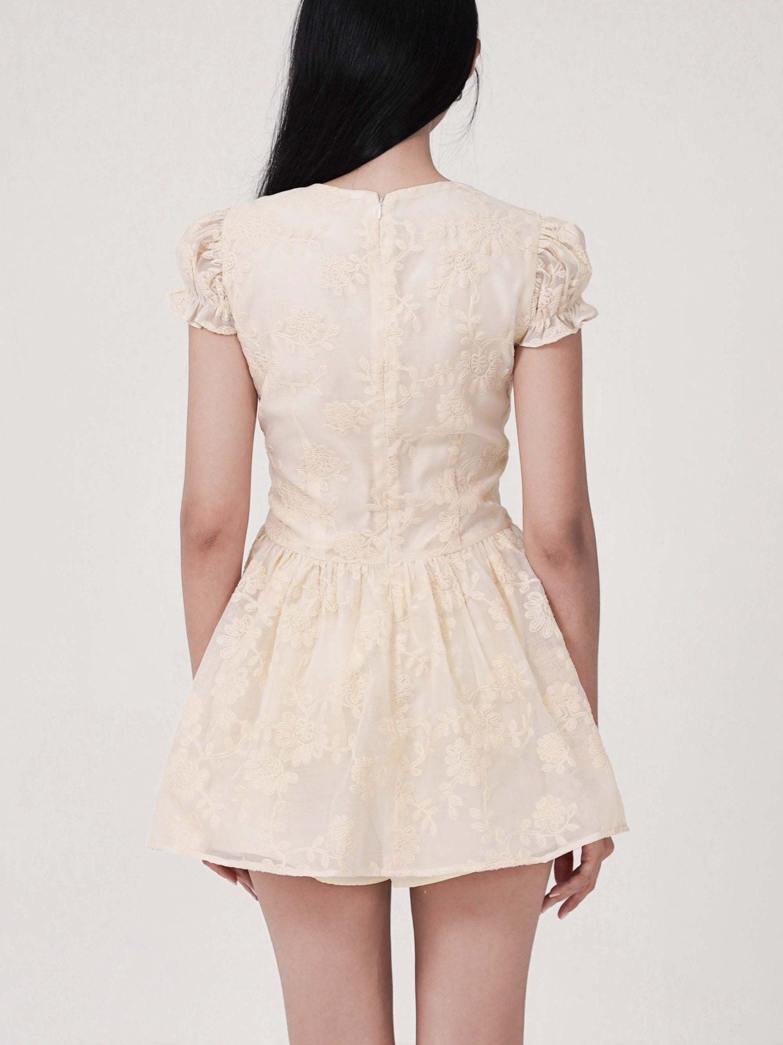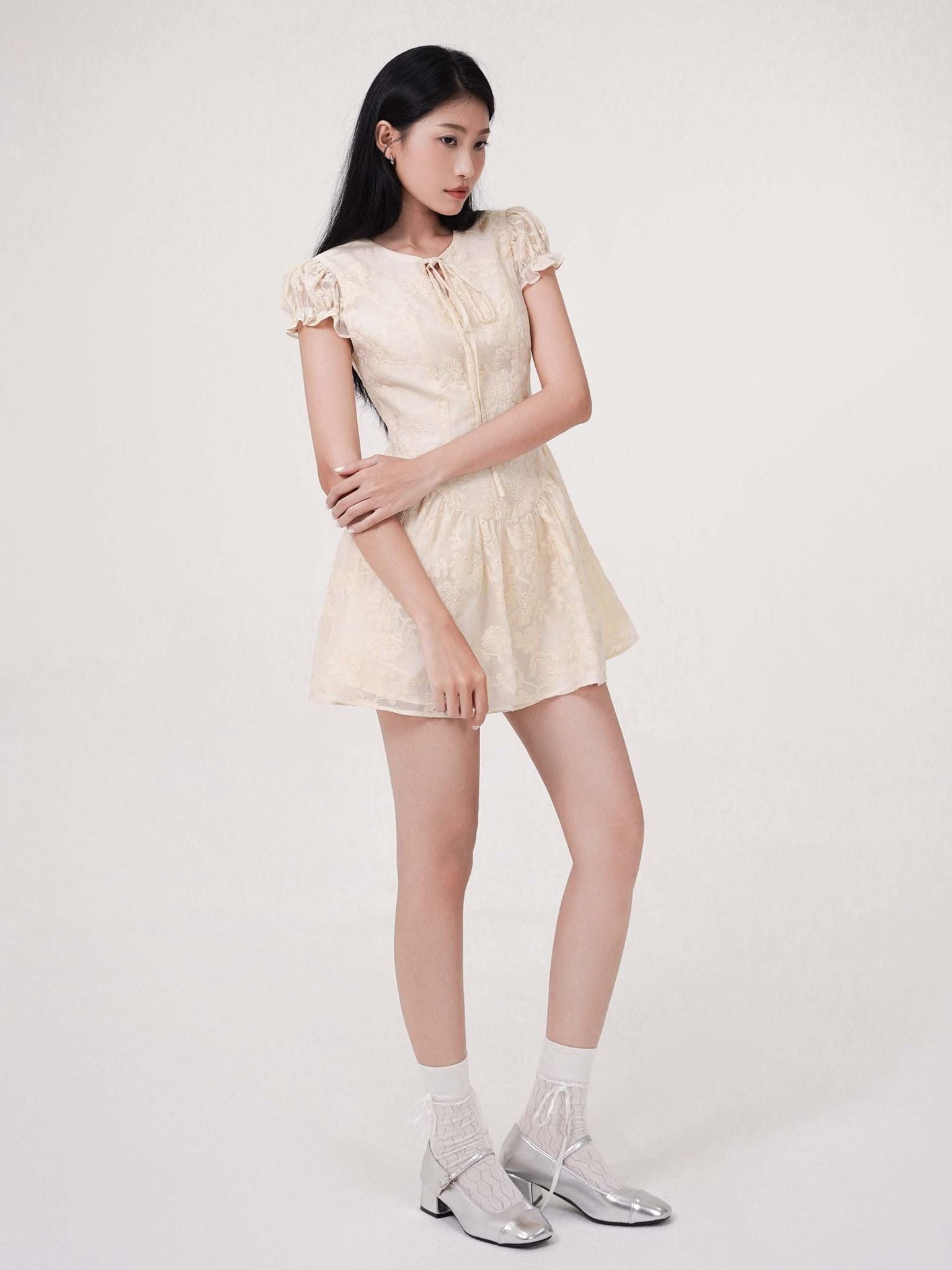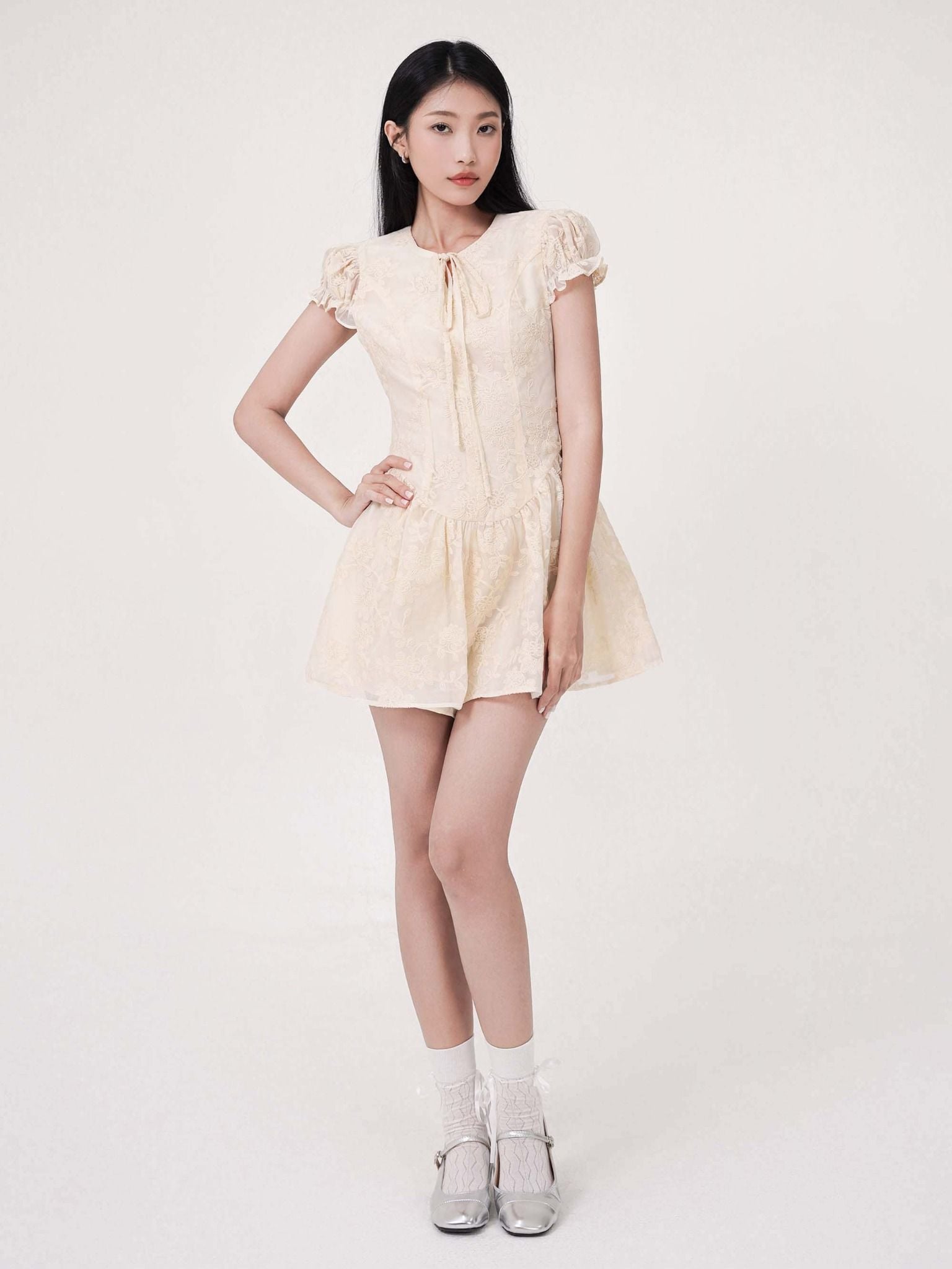 - Đây là mẫu đầm ngắn nữ mang phong cách nhẹ nhàng, thanh lịch. Phần eo được chiết ôm nhẹ, giúp tạo đường cong cơ thể. Vải ren được may 2 lớp (thân dưới là quần), có hoa văn nổi tone-sur-tone, mang đến vẻ sang trọng và cổ điển. Phù hợp cho các dịp đi chơi, hẹn hò, dạo phố hoặc tiệc nhẹ.