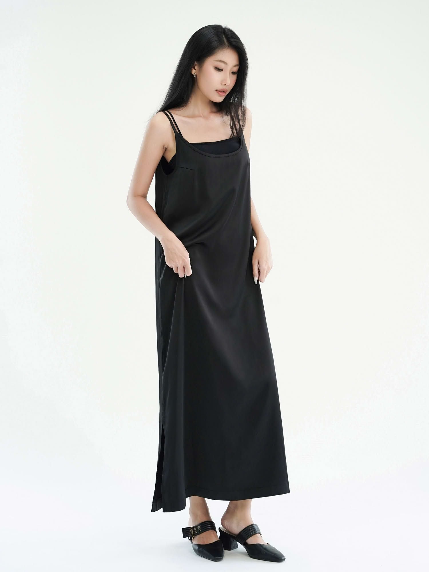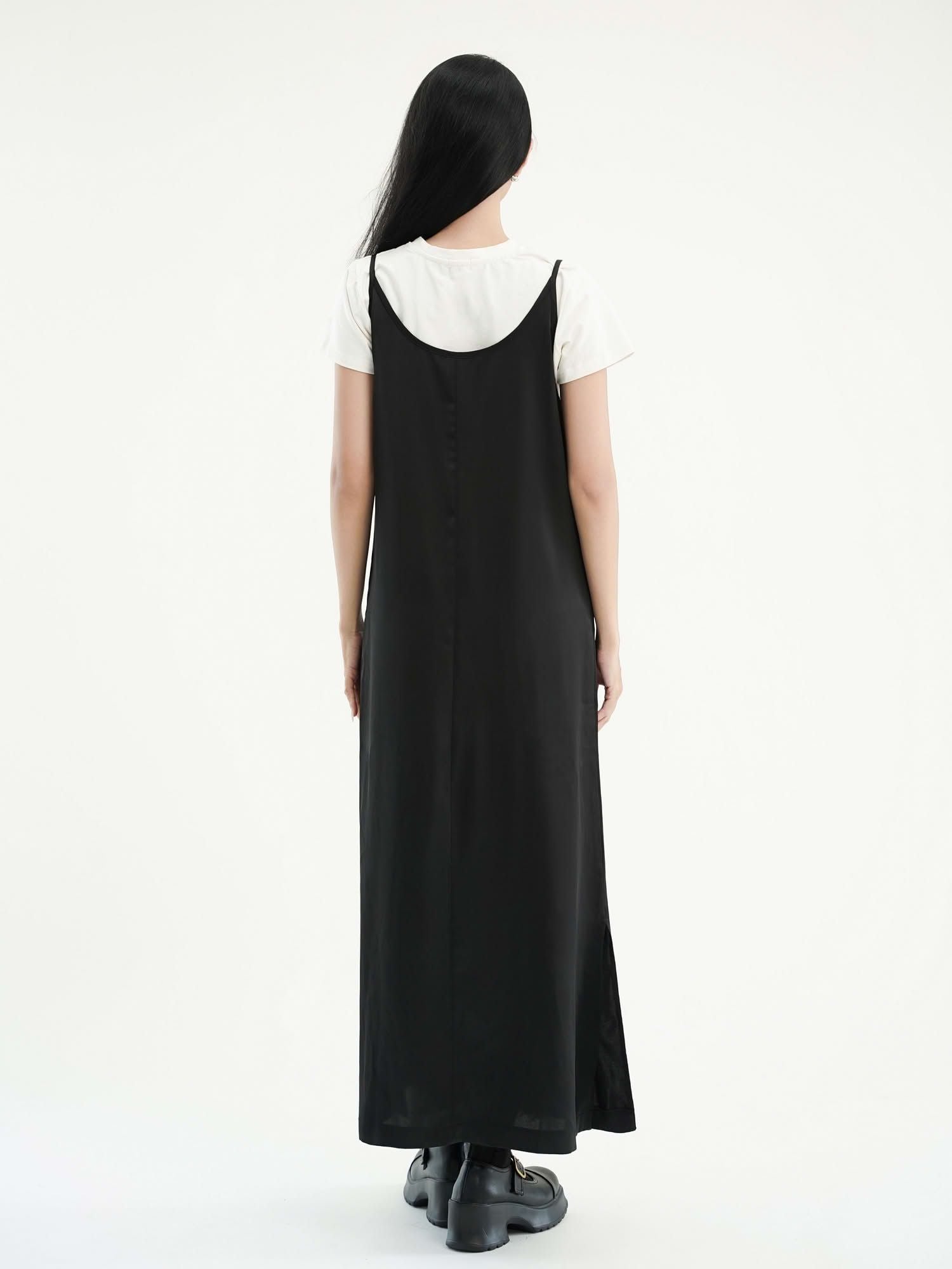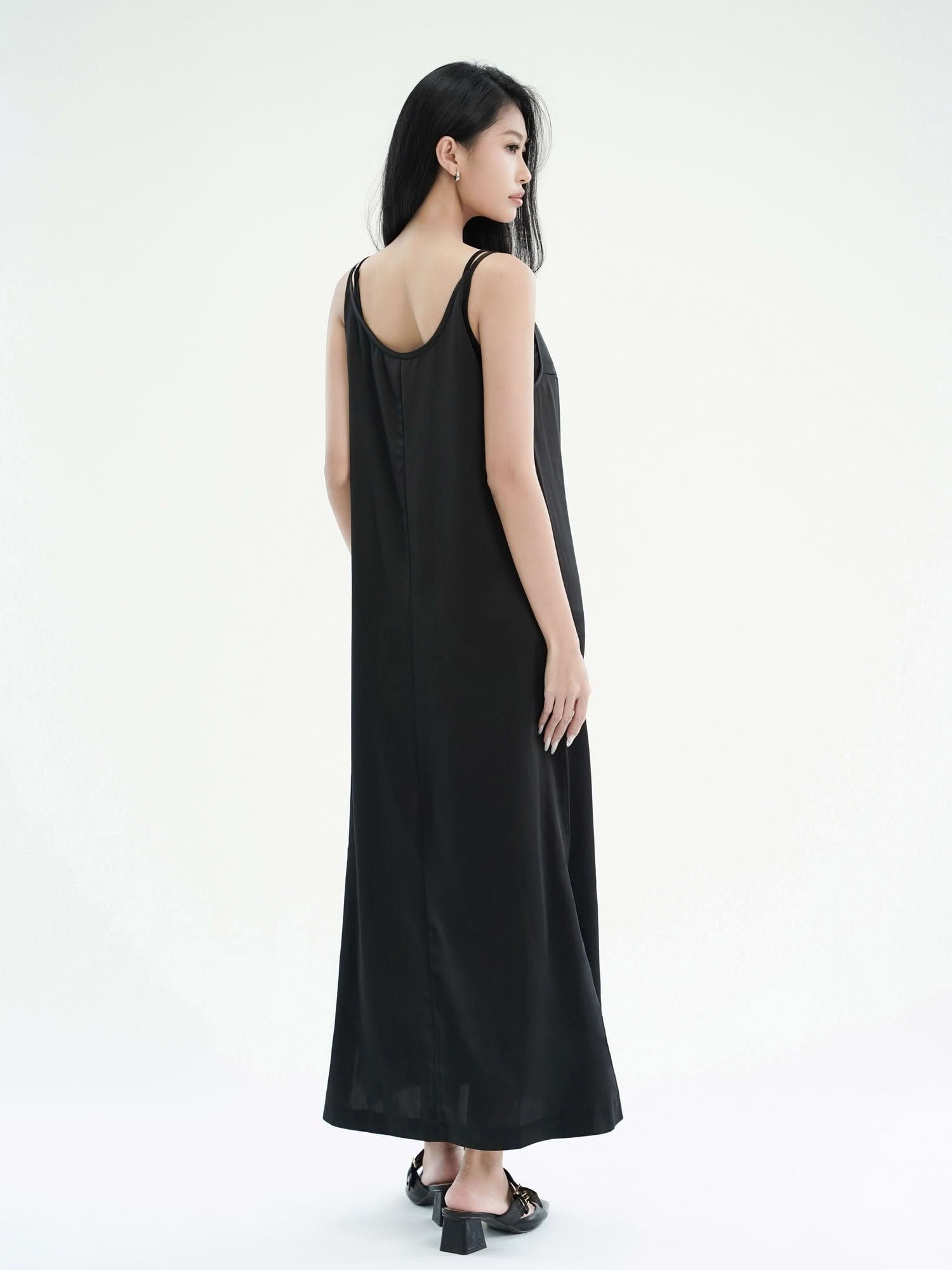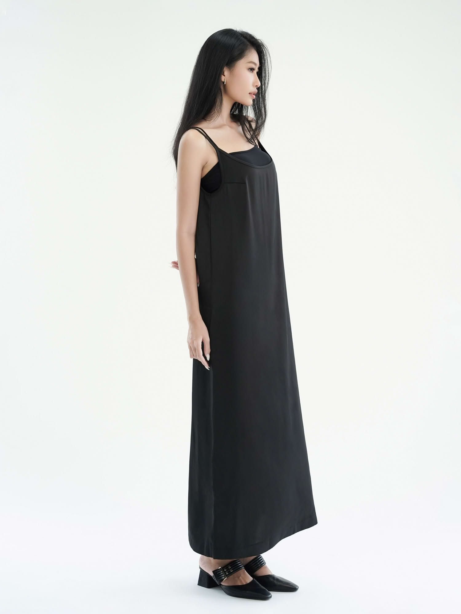 - Đầm nữ maxi phom suông hai dây màu đen với thiết kế tối giản, hiện đại. Đầm phom suôn, quý khách có thể chọn size theo vòng 1.