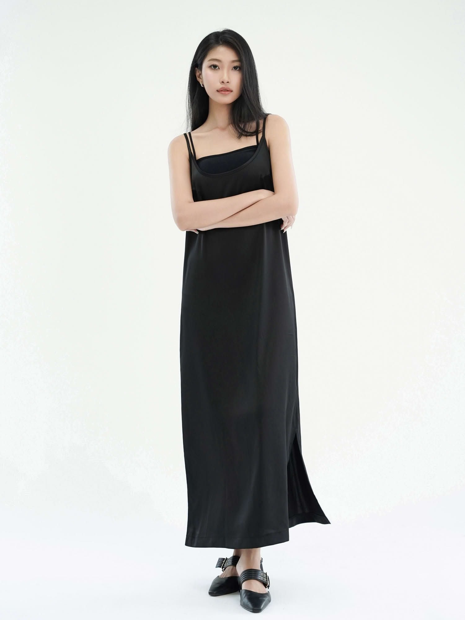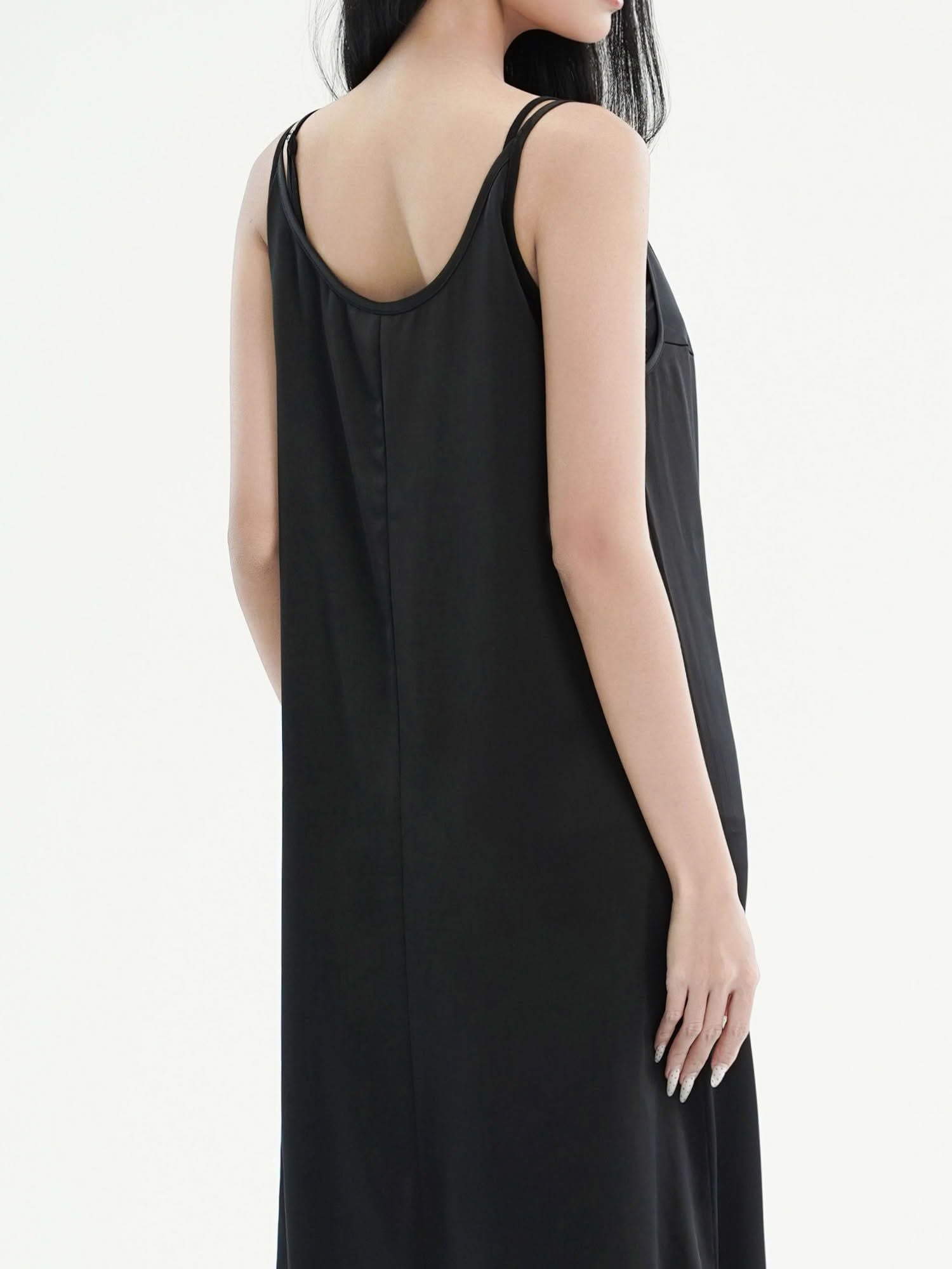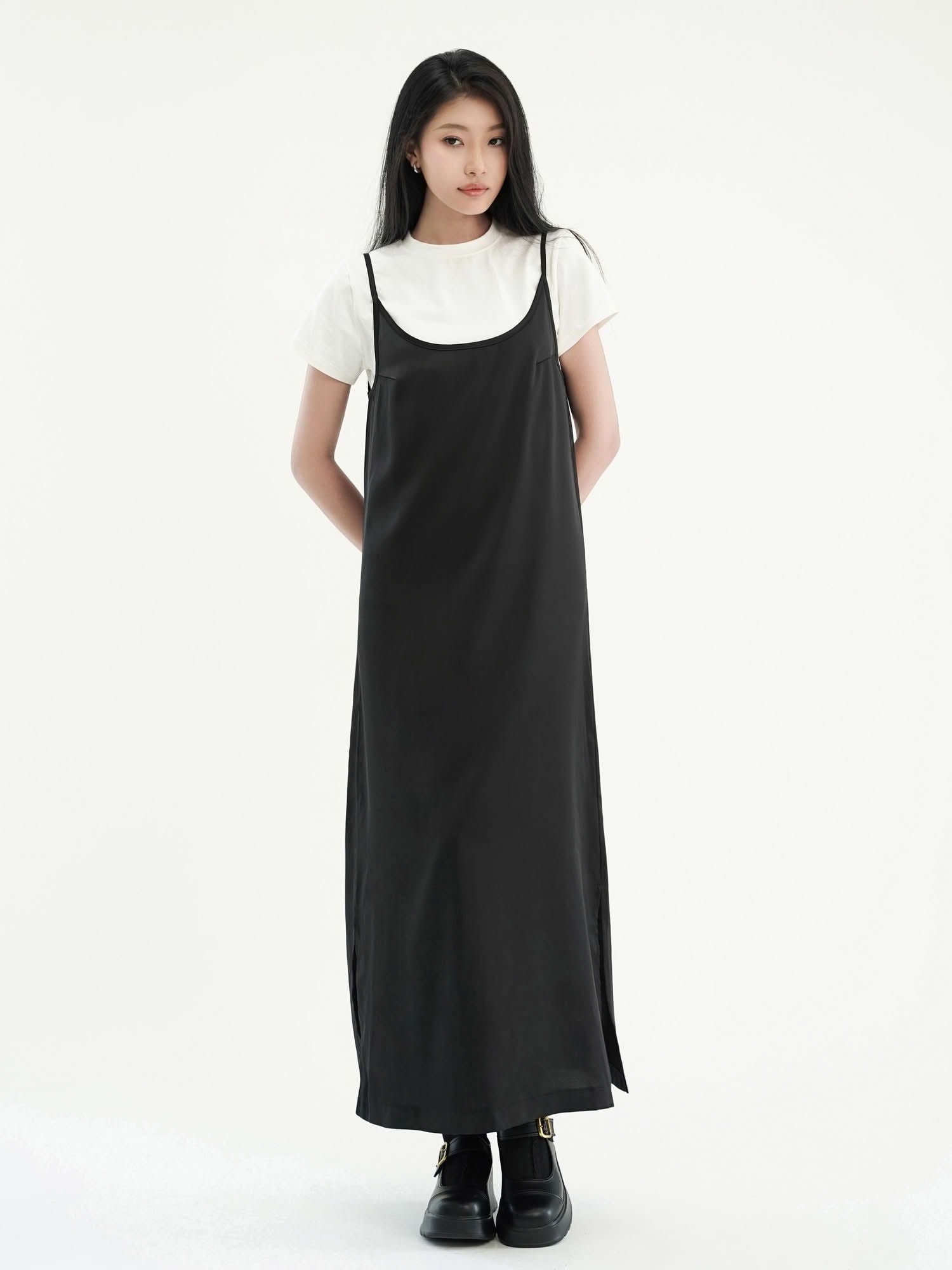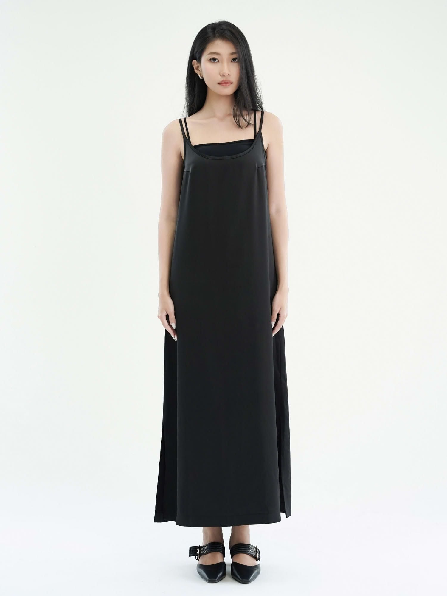 - Đầm nữ maxi phom suông hai dây màu đen với thiết kế tối giản, hiện đại. Đầm phom suôn, quý khách có thể chọn size theo vòng 1.