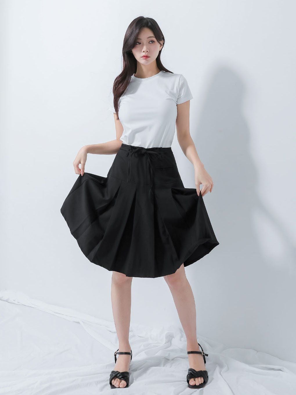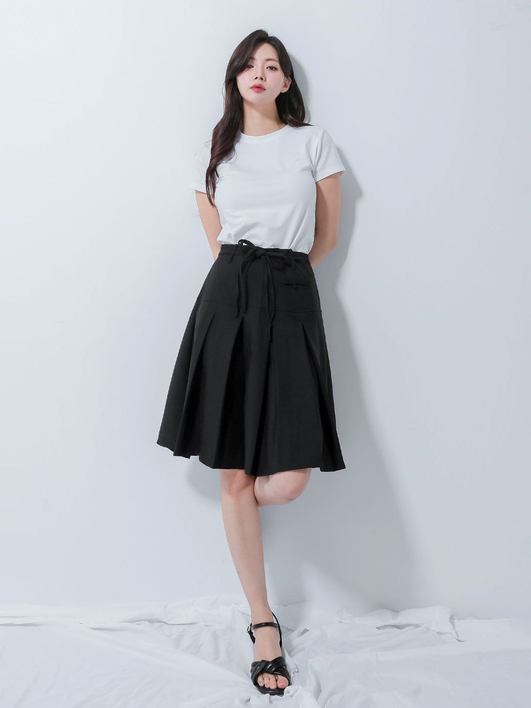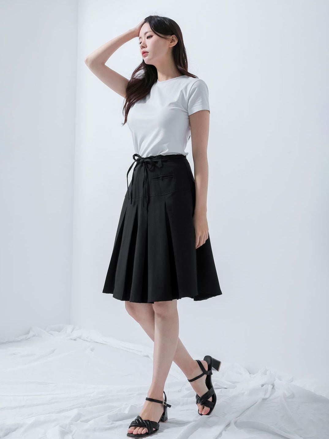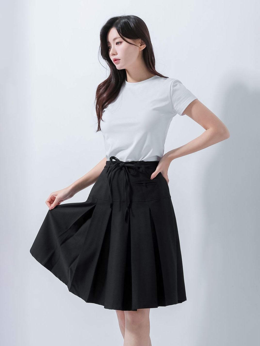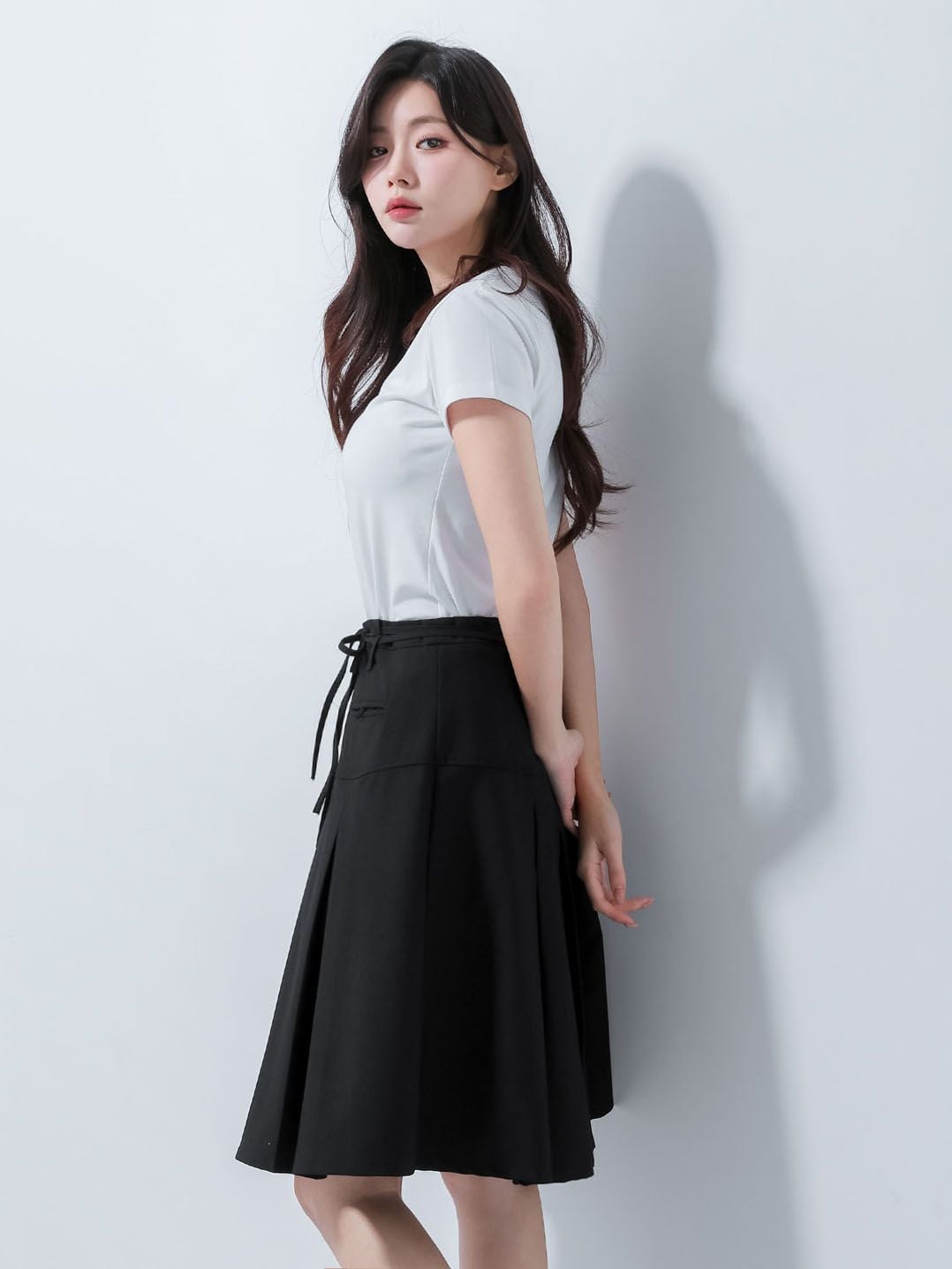 - Chân váy xòe chữ A xếp ly. Vải dày dặn, giữ form tốt, có độ rũ nhẹ, Dáng xòe chữ A, giúp che khuyết điểm phần đùi và tạo hiệu ứng thon gọn cho đôi chân. Cạp cao, có dây rút thắt nơ phía trước tạo điểm nhấn nữ tính.